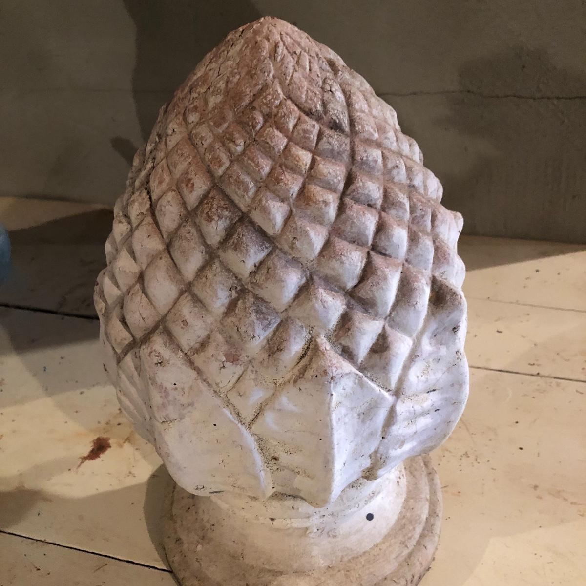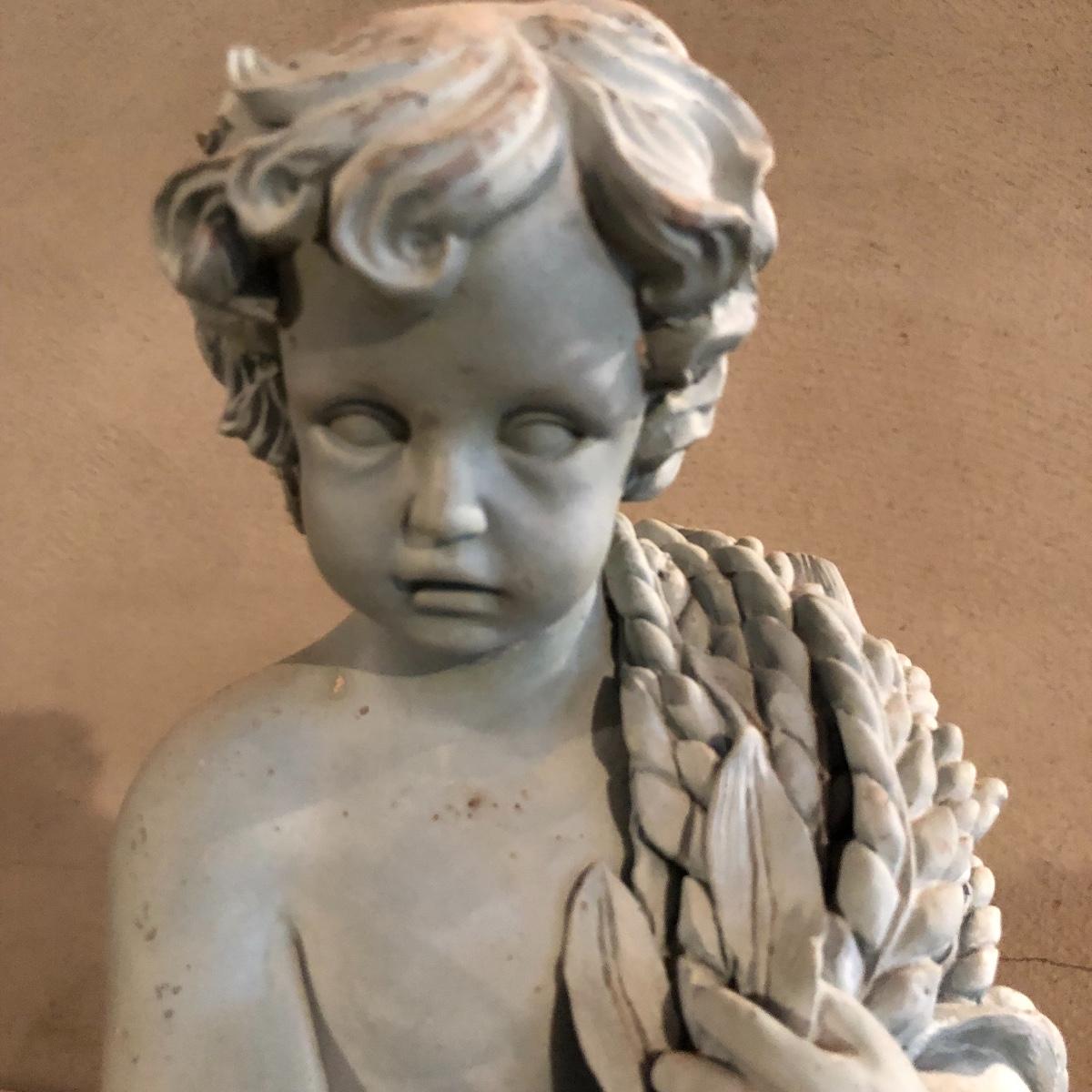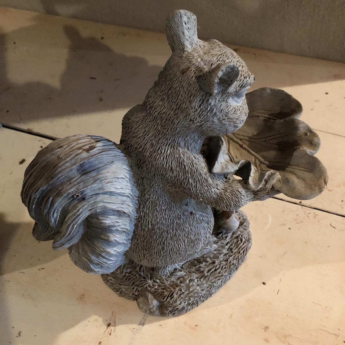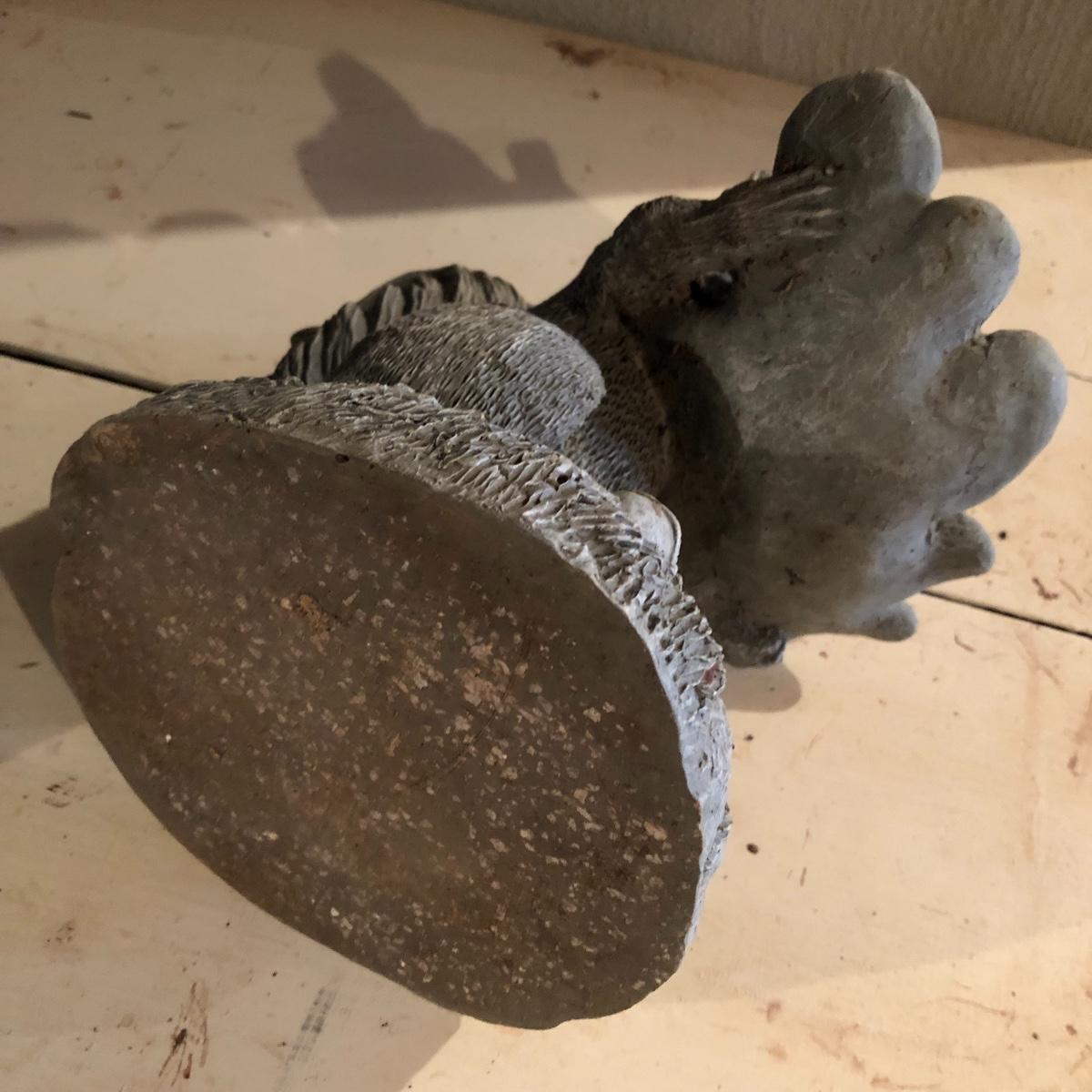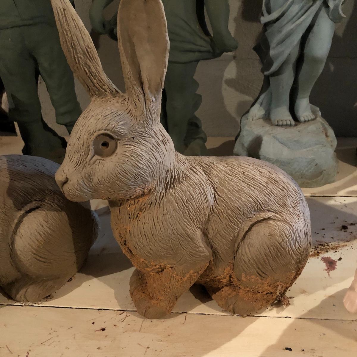 There are three figurines of children: two are heavy and could be concrete and the piggyback figurine is lighter and plastic. They are about 22” tall. The darker green children seem vintage. Note the broken hair ribbon on the piggy back figurine. There are four bunnies; two are similar (plastic filled with sand). There are yard plaques or stepping stones, a bird bath (hangs), a metal tripod, two metal butterflies and more! Local pick up only.