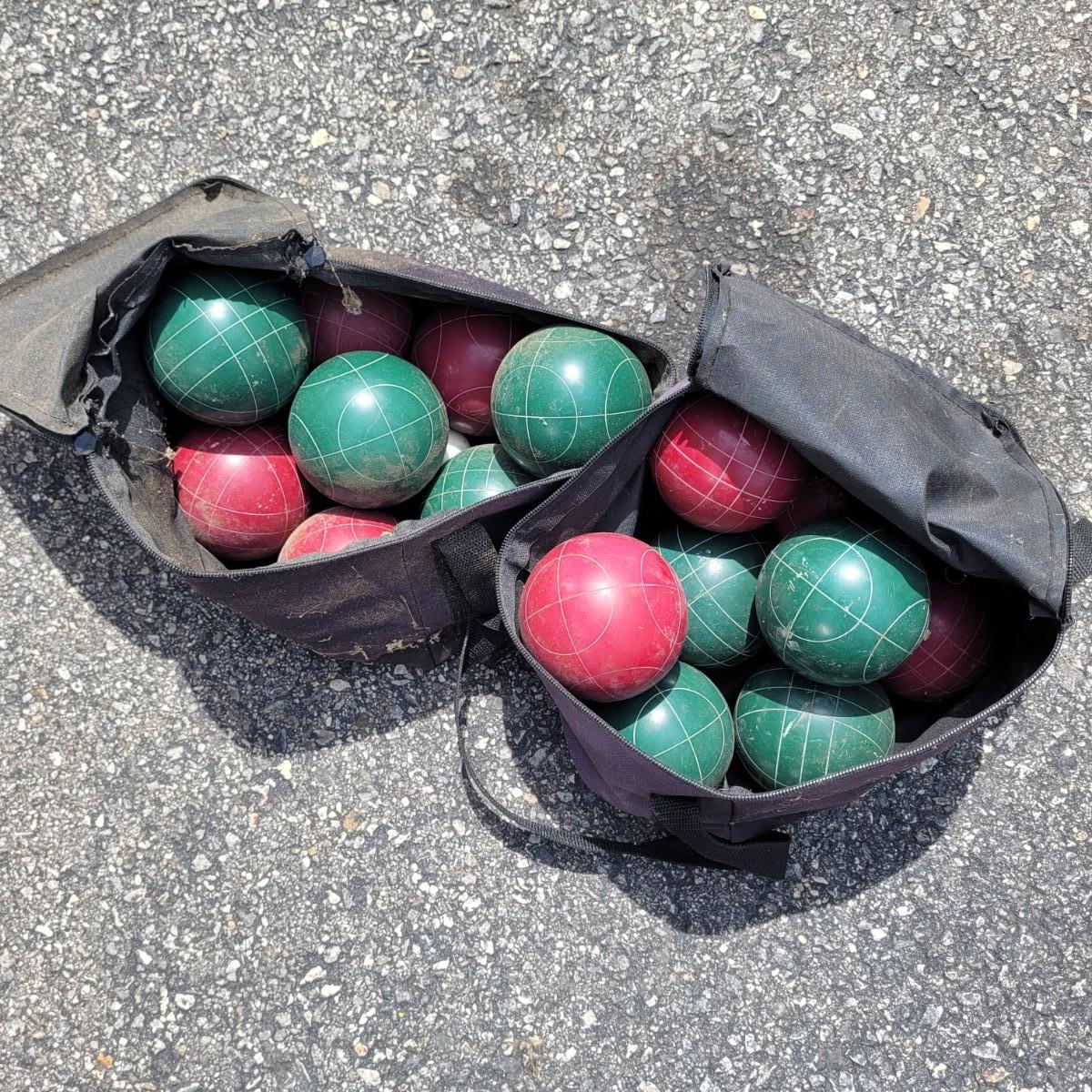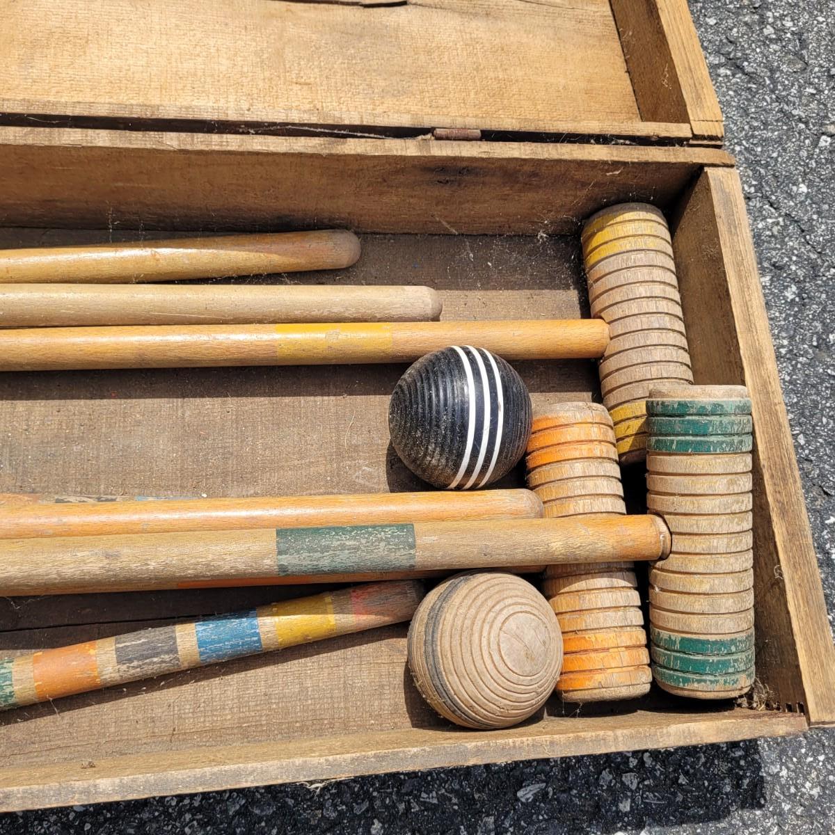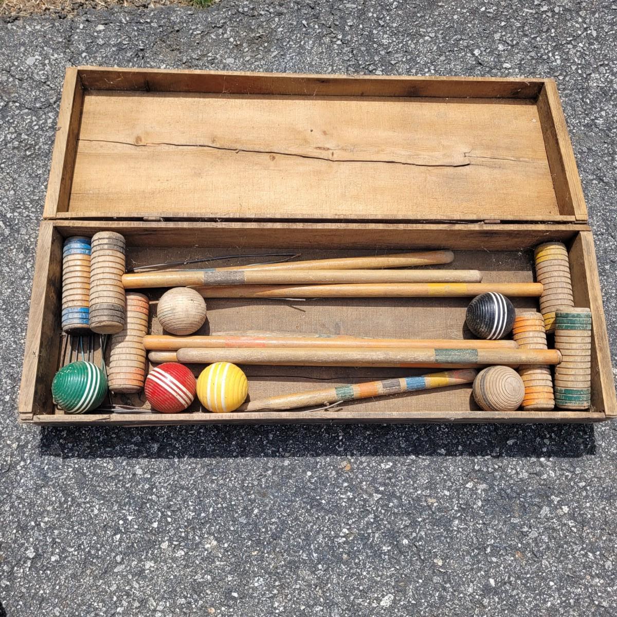 This lot includes various yard games and activities. There is a large croquet set in a wooden box. It includes mallets, stakes, and balls for playing a game of croquet. There are also two sets of bocce balls with carrying bags, a pickle ball set with carrying bag, and two Frisbees. The pickleball set contains five rackets and four plastic balls. The Frisbees are from the Asheville local restaurant "Good Hot Fish". The largest item, the croquet set, measures 34" x 12" x 6"H.