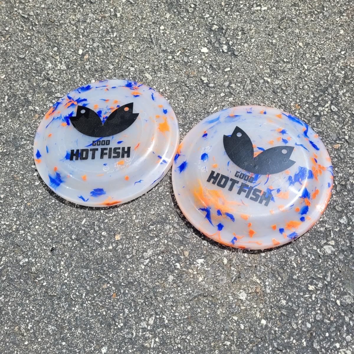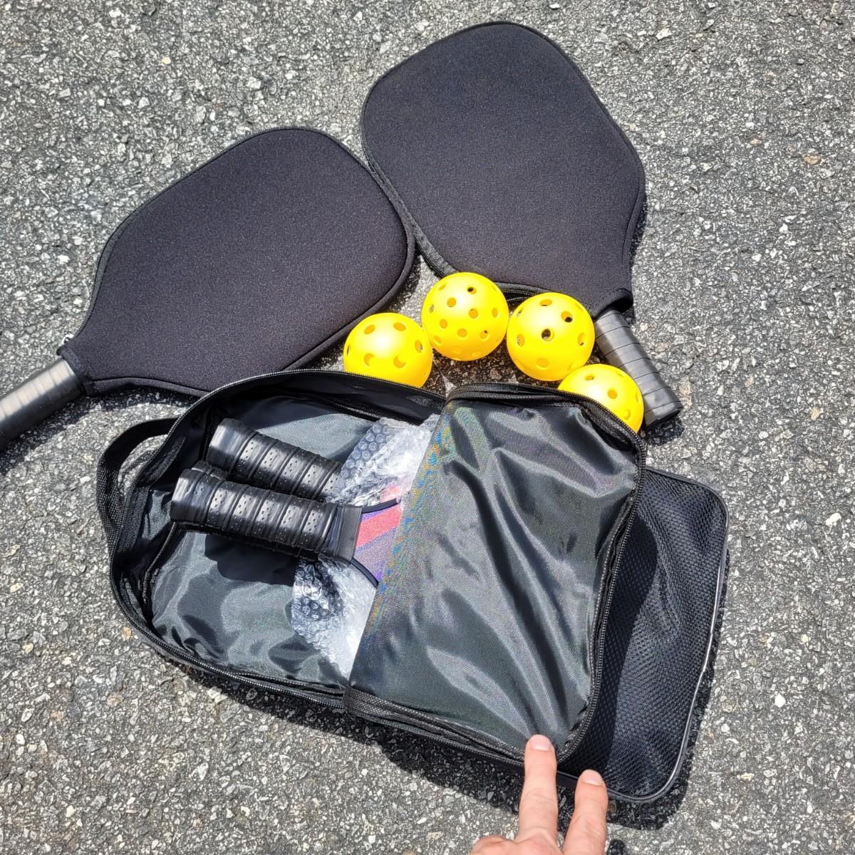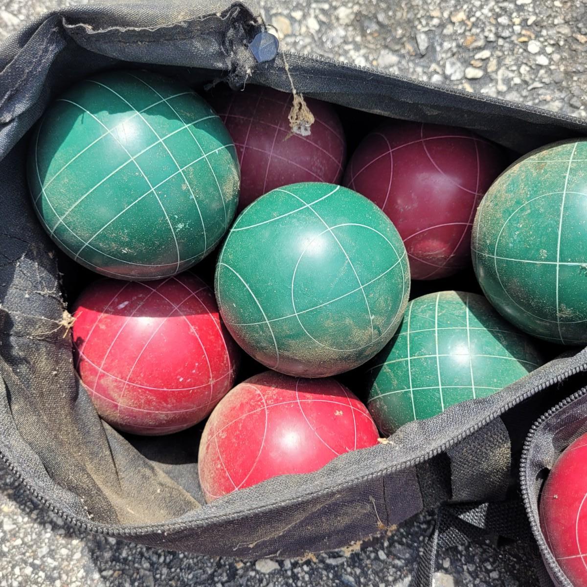 This lot includes various yard games and activities. There is a large croquet set in a wooden box. It includes mallets, stakes, and balls for playing a game of croquet. There are also two sets of bocce balls with carrying bags, a pickle ball set with carrying bag, and two Frisbees. The pickleball set contains five rackets and four plastic balls. The Frisbees are from the Asheville local restaurant "Good Hot Fish". The largest item, the croquet set, measures 34" x 12" x 6"H.