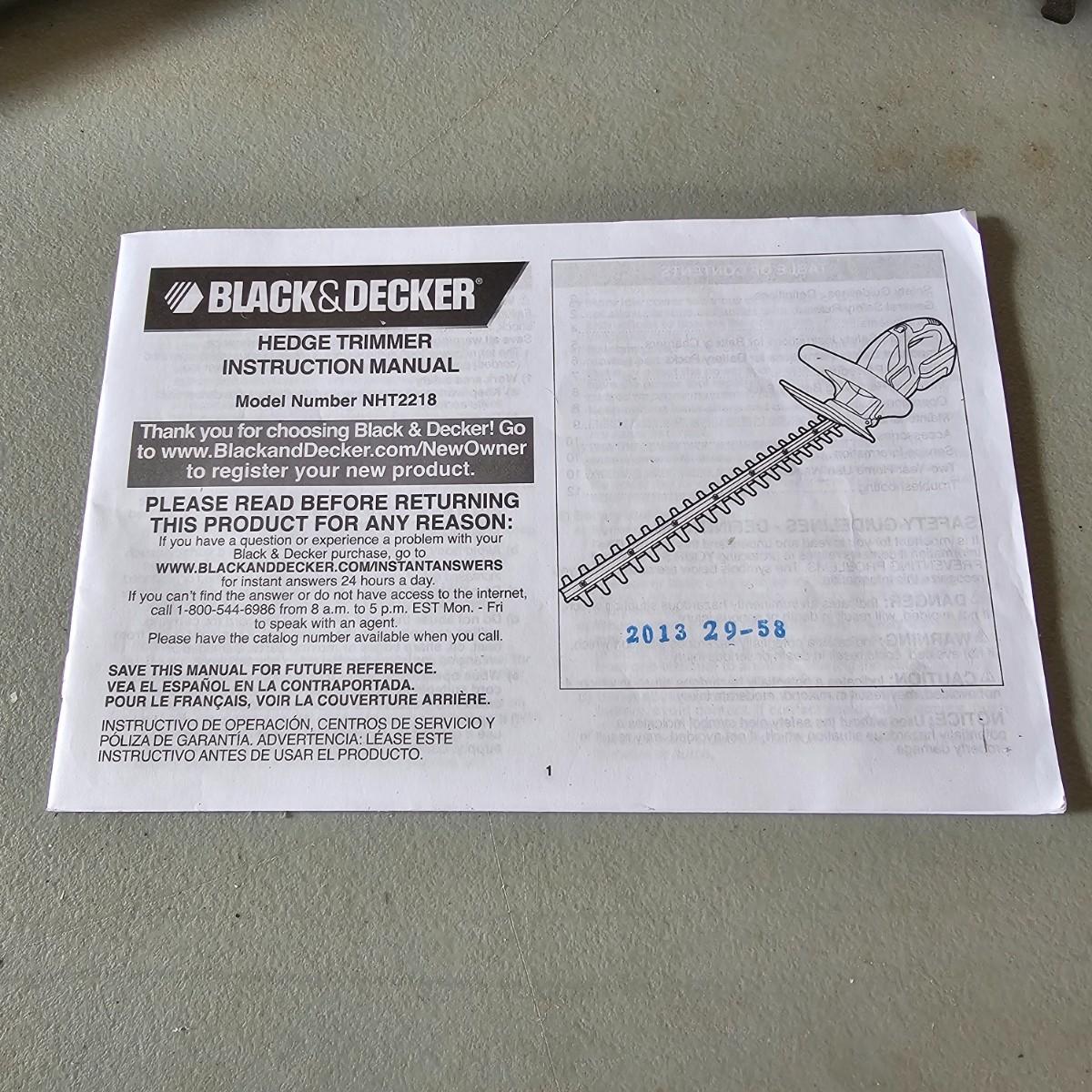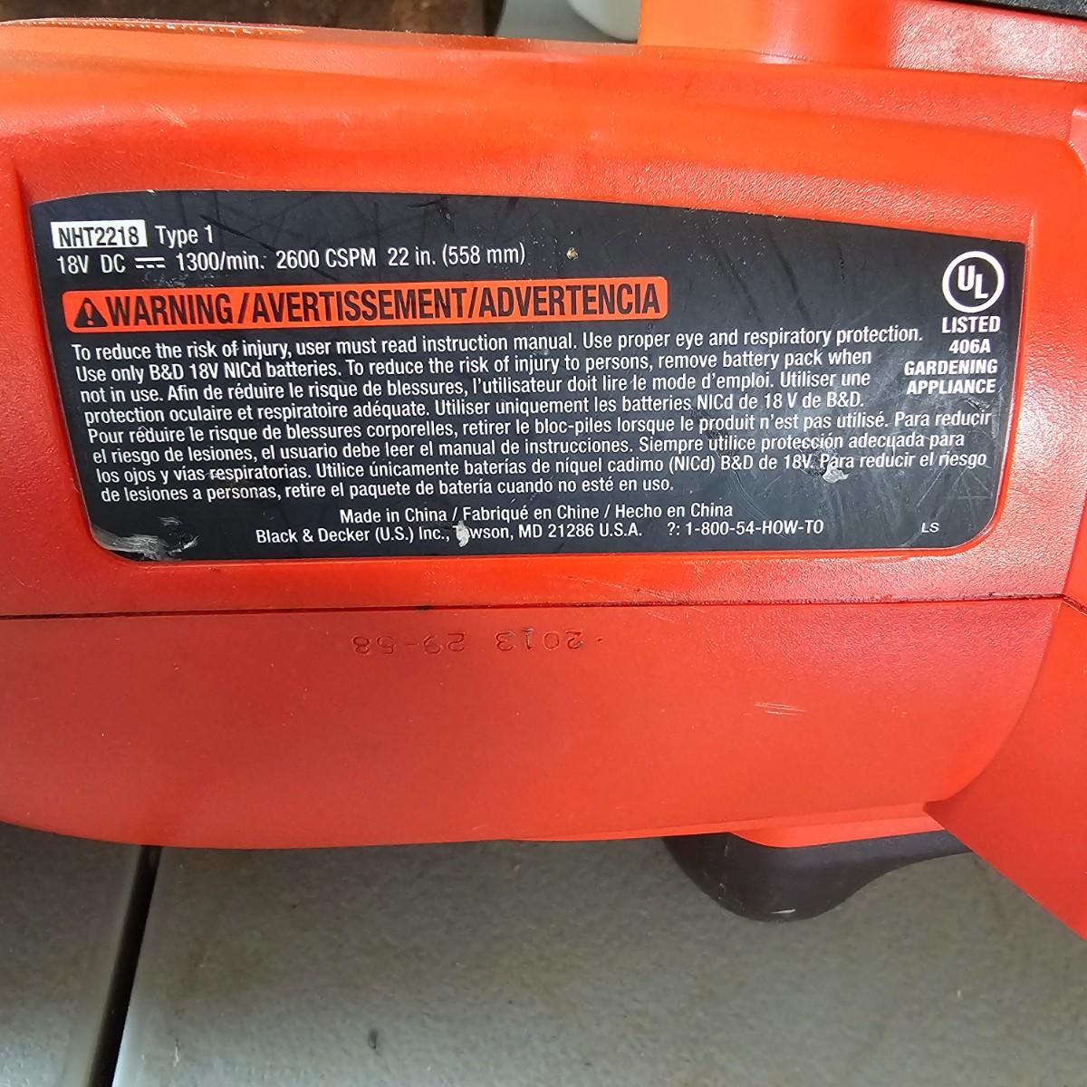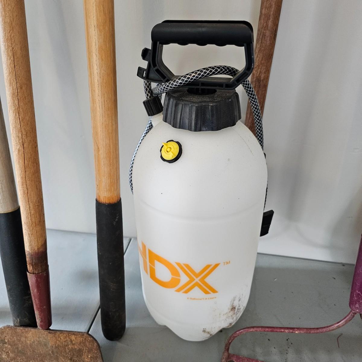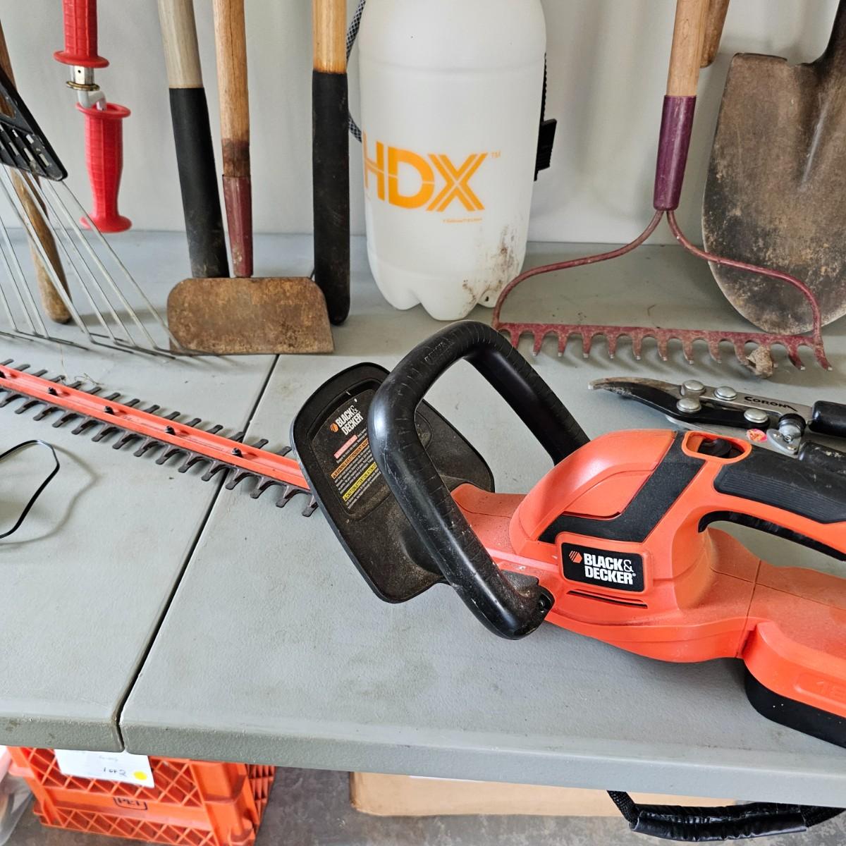 Rakes, shovels, hoes and more. 2 gallon pump sprayer, 22" Black and Decker cordless hedge trimmer with battery and charger, powered on when plugged in. Square and round point shovels and two brooms. Longest rake is 64". See photos for details. Local pickup only.
