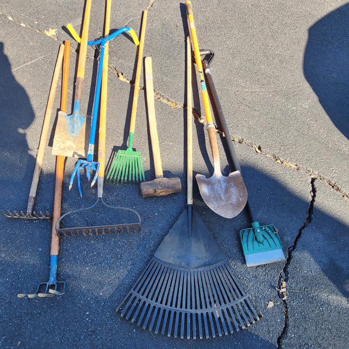 Yard Garden Tool Lot Rakes Shovel, tiller,& more