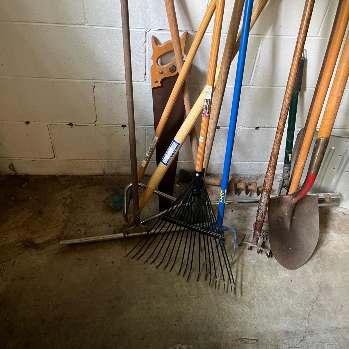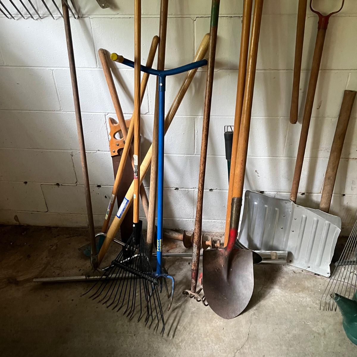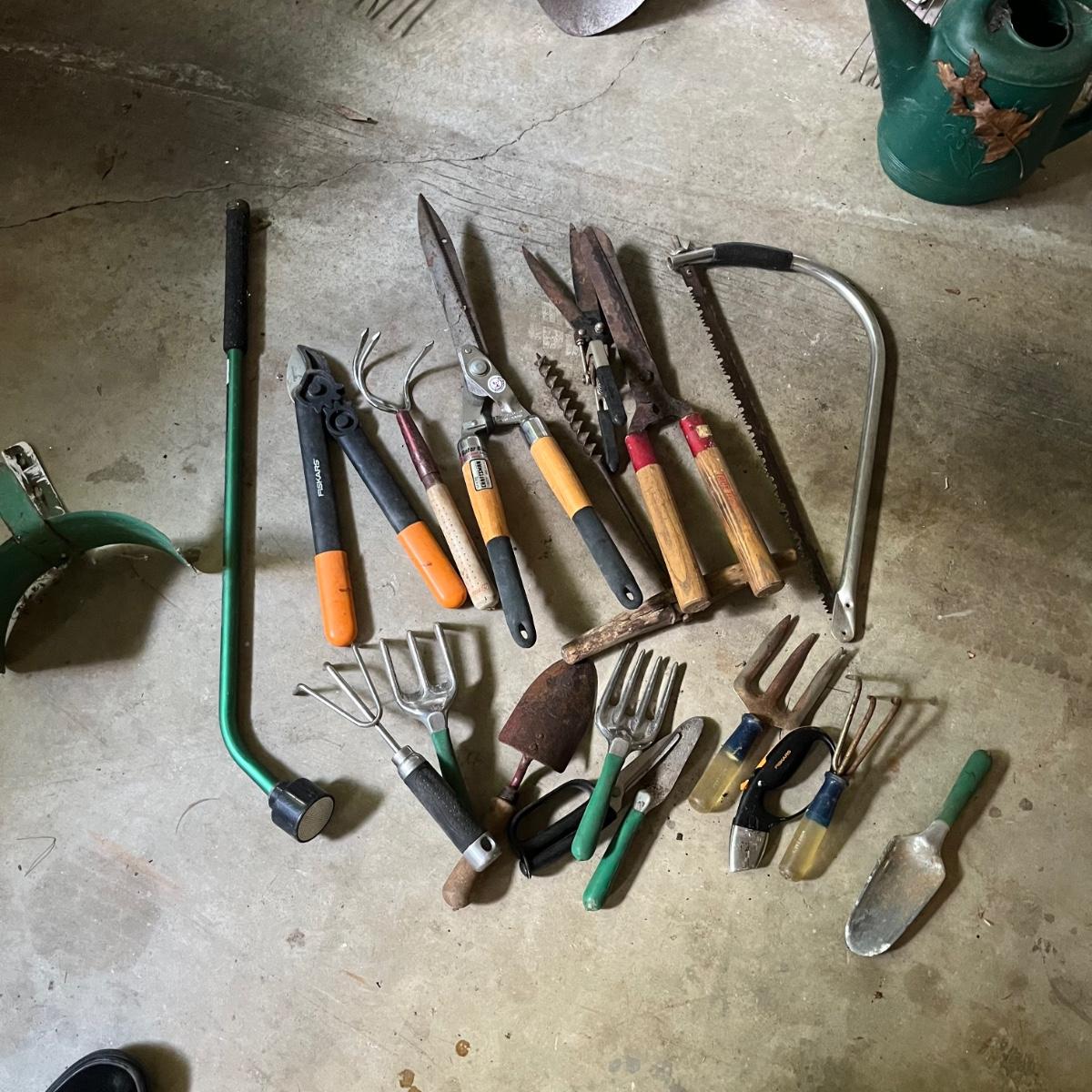 Lot includes a sturdy assortment of rakes, shovel, loppers, hedge trimmers, garden trowels and rakes, saw, potato fork and more.