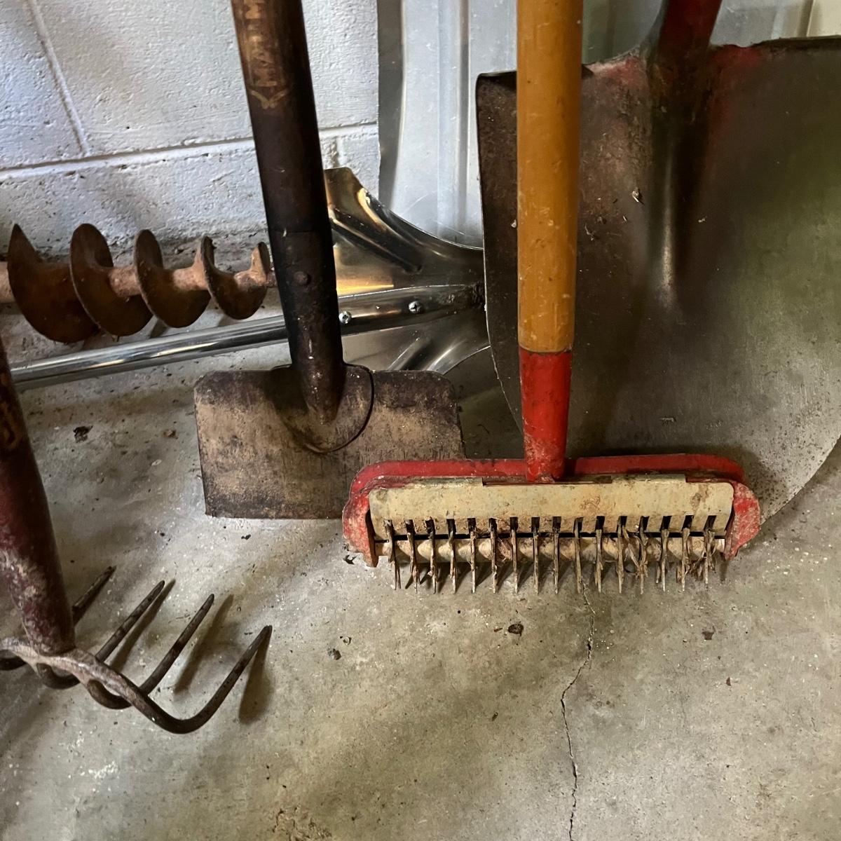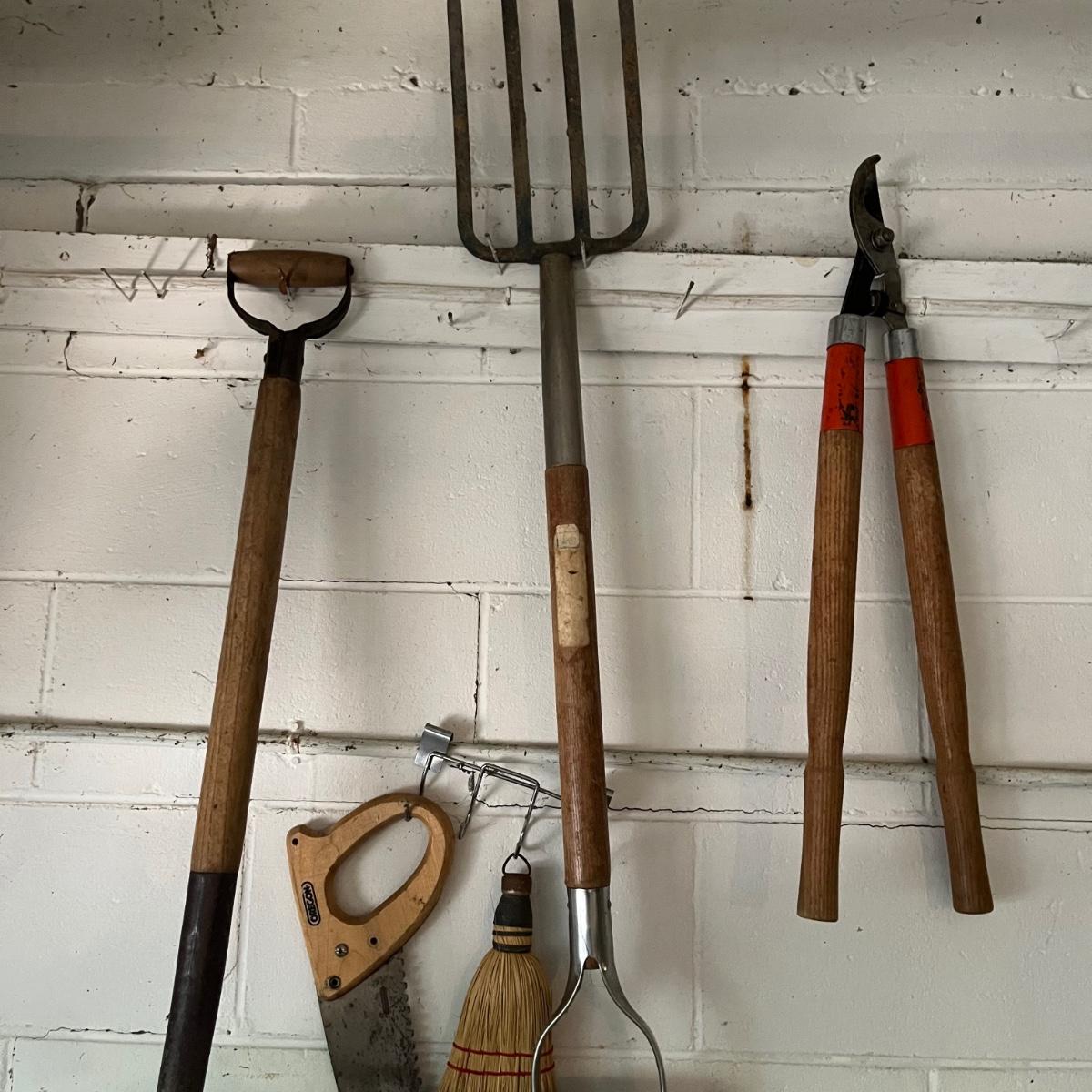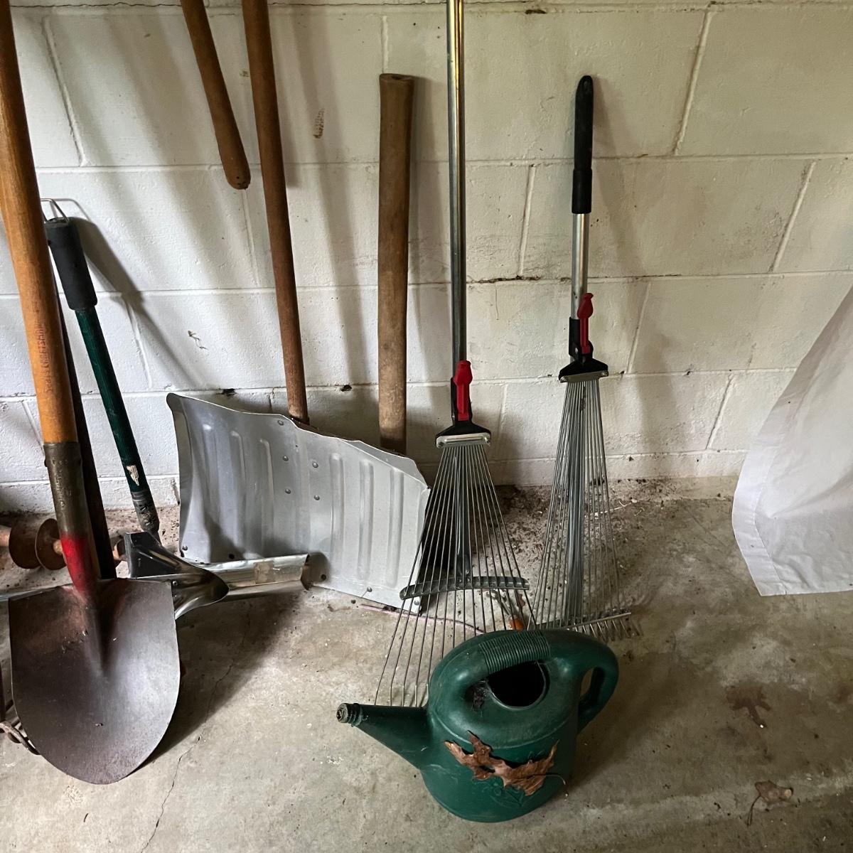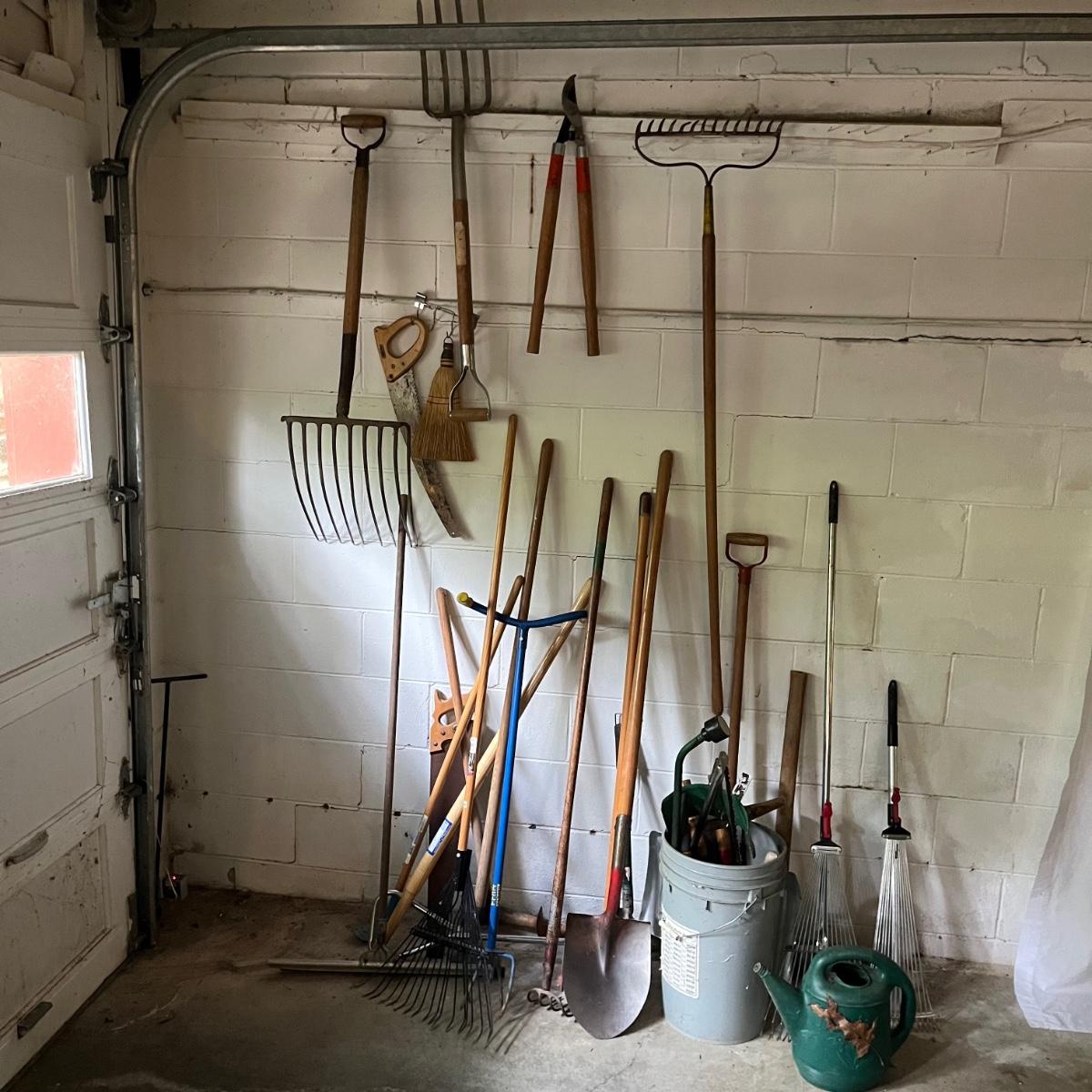 Lot includes a sturdy assortment of rakes, shovel, loppers, hedge trimmers, garden trowels and rakes, saw, potato fork and more.