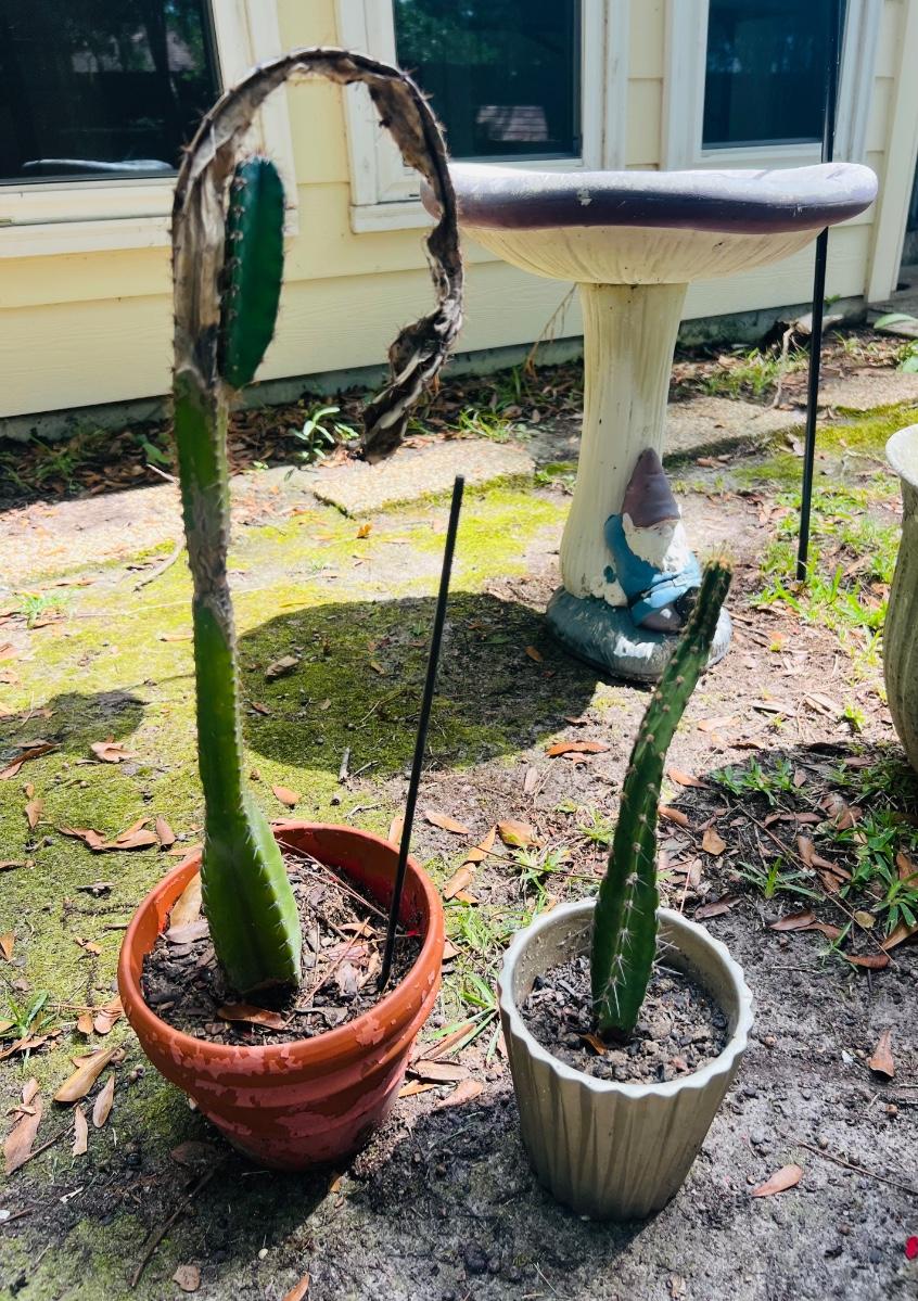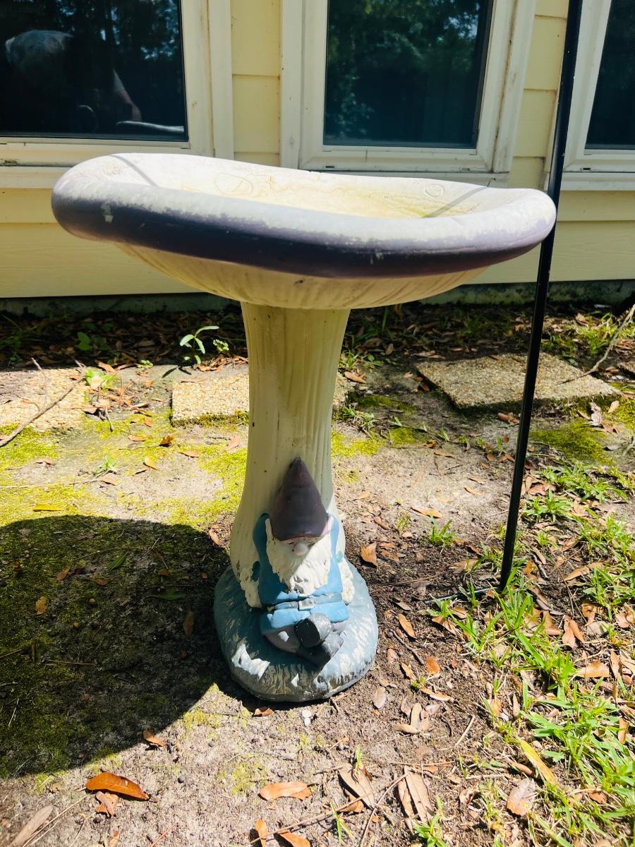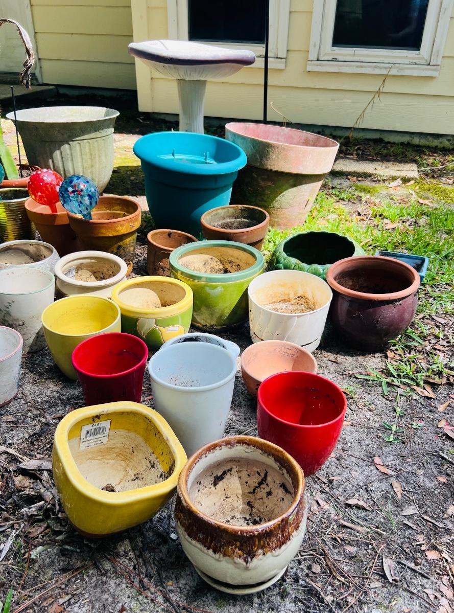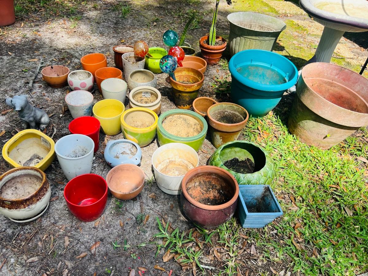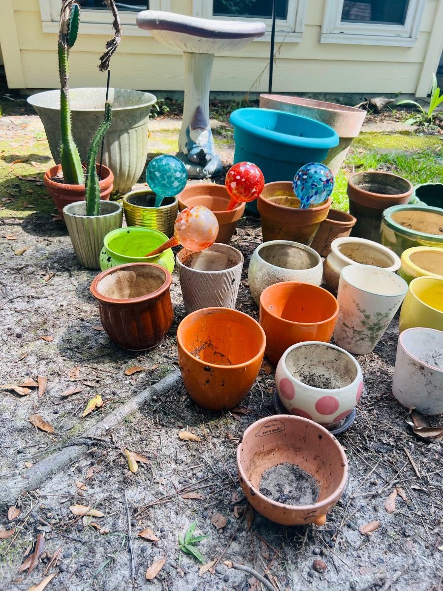 lot of yard items over 35 pieces Gnome Birdbath, hummingbird feeder, planters, 2 cactus plants. Planters range from various sizes and include terra-cotta, ceramic and a few plastic pots. Everything you see here.