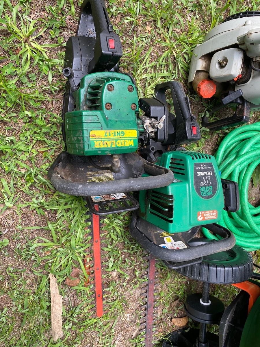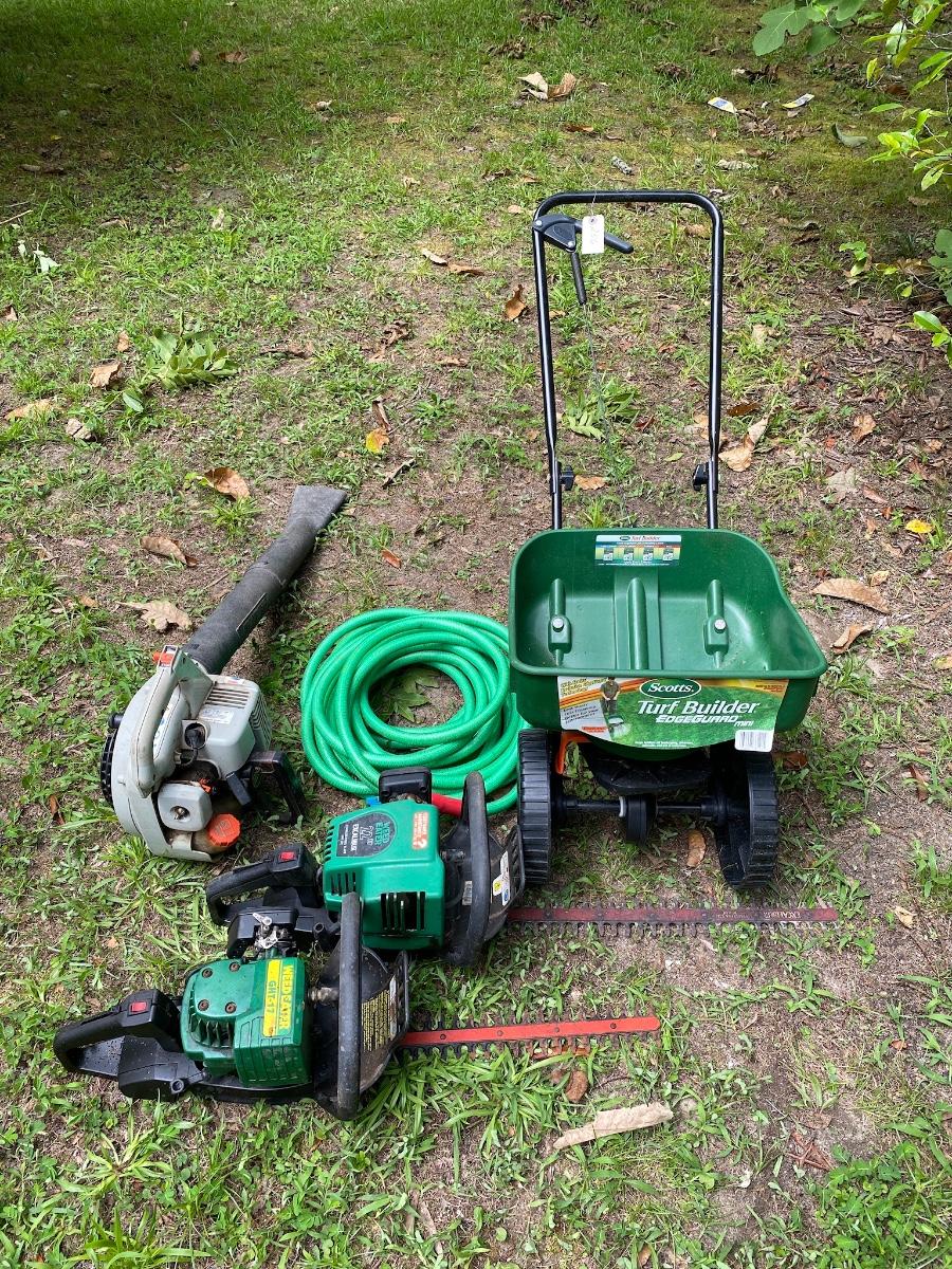 Yard Maintanence Lot includes Spreader, 2 Hedge Trimmers, and Untested Gas Powered Blower and More As Pictured