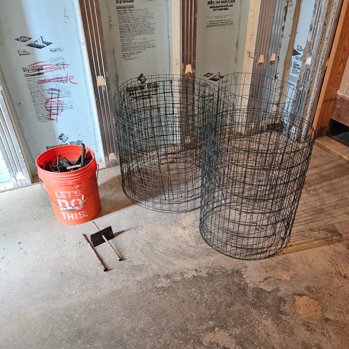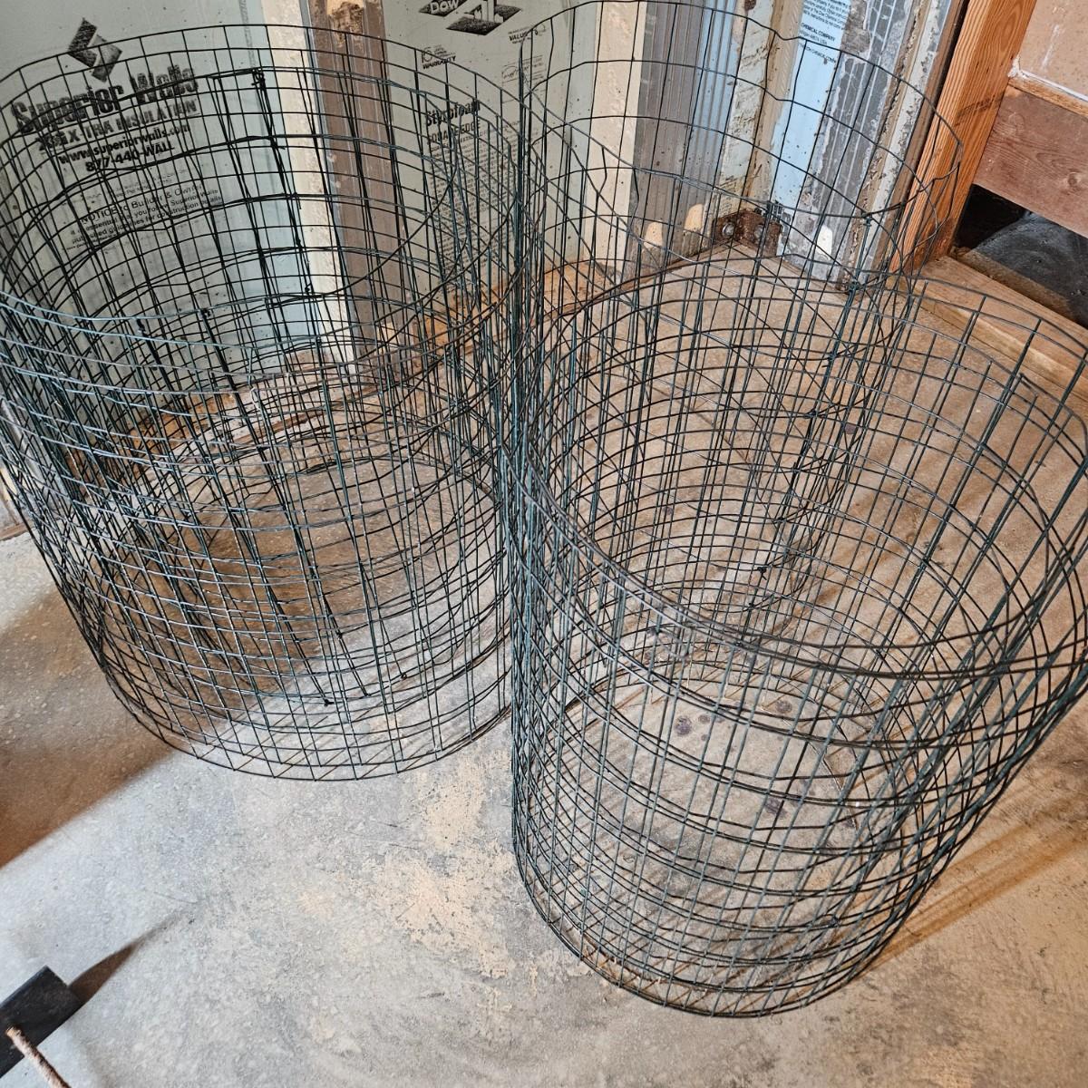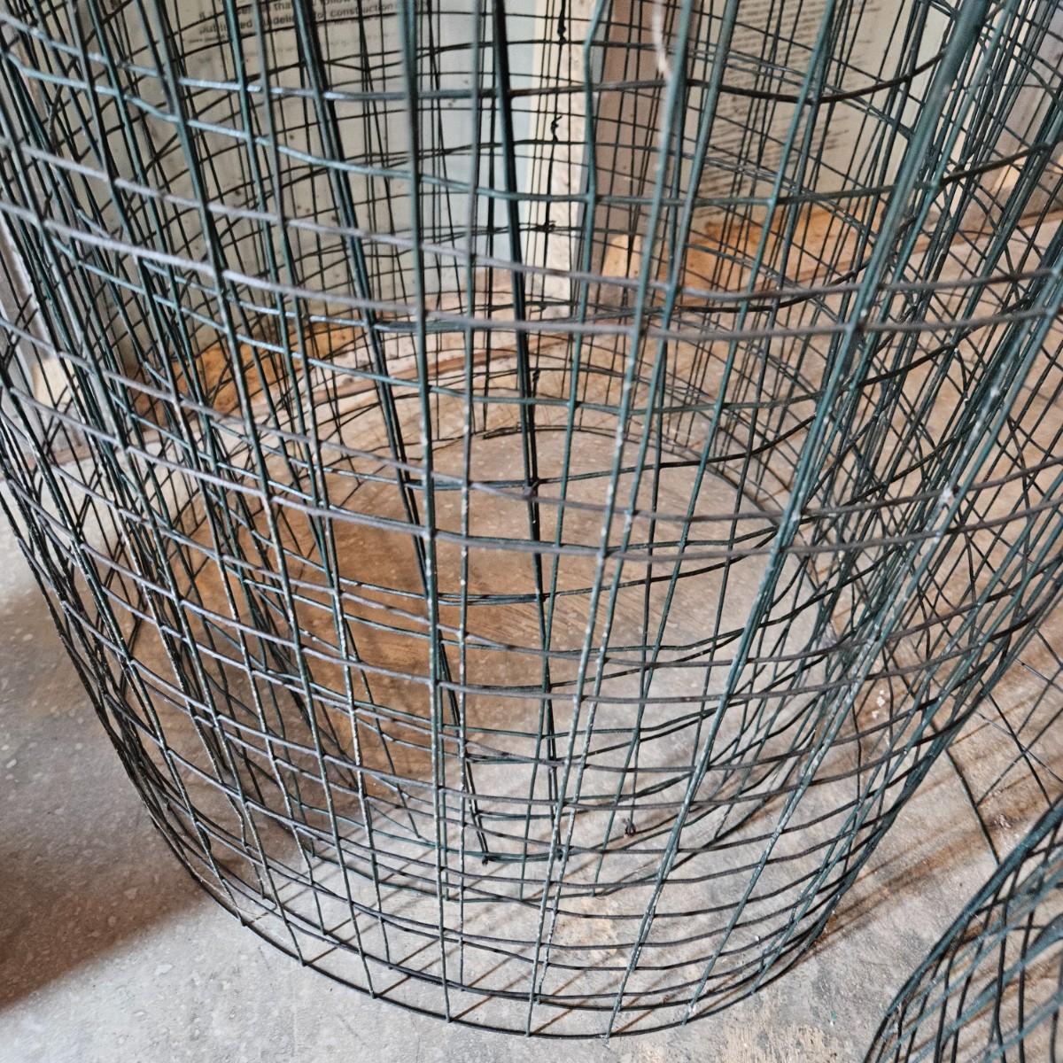 A bucket of yard stakes that are approximately 12" in length and likely over 80 in the orange bucket that also includes a handful of edging locks. Also includes seven pieces of gardening wire that has been cut and joined into cages. Wire is approximately 3' tall. Local pickup only