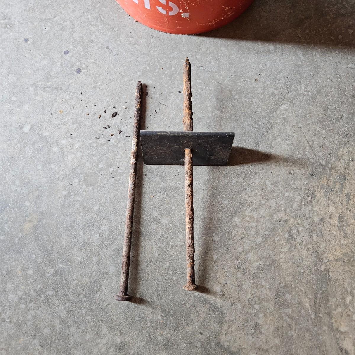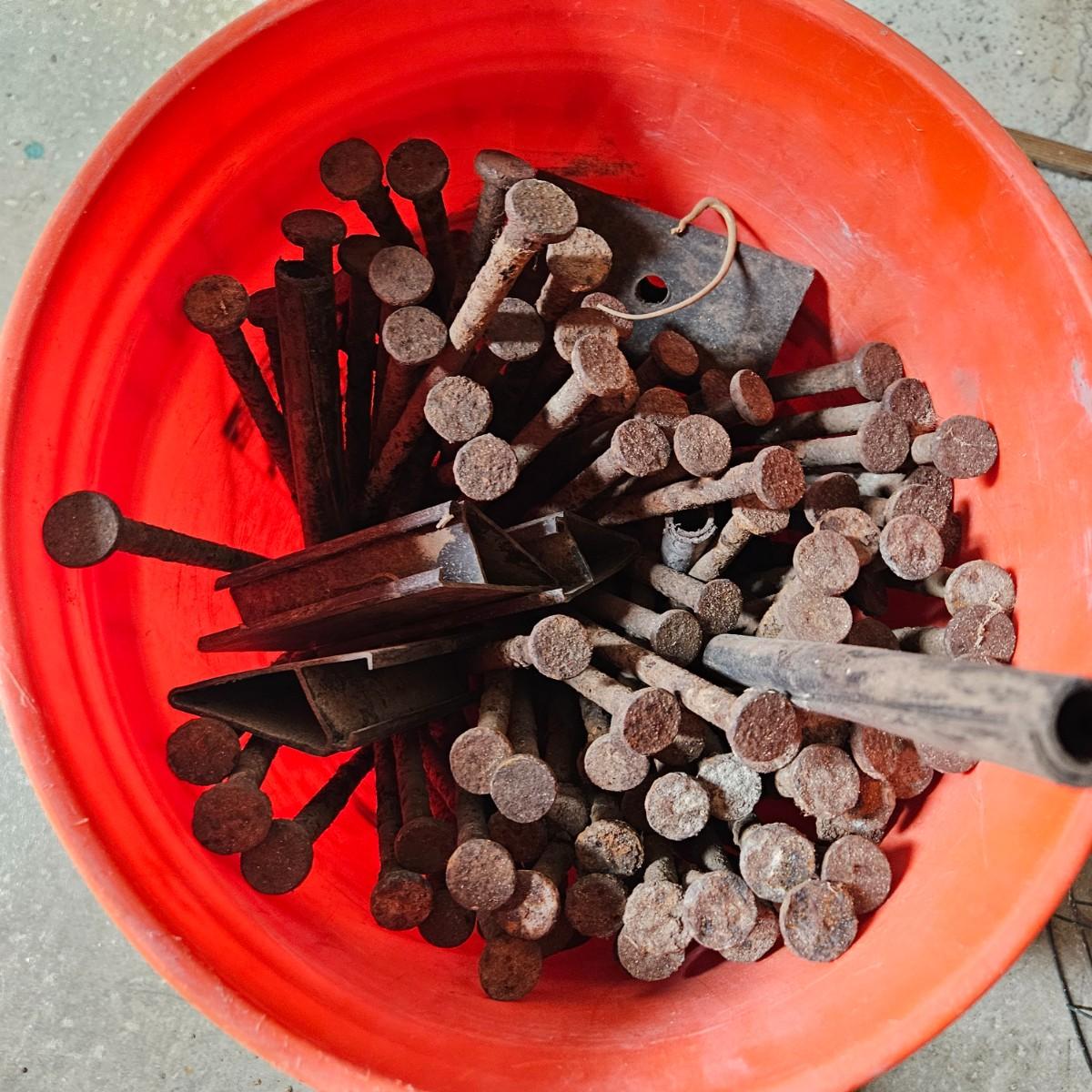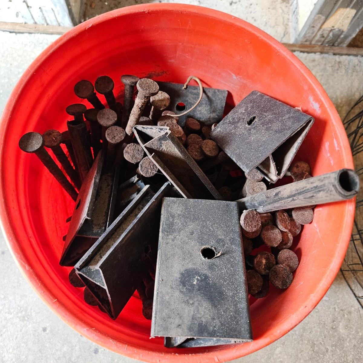 A bucket of yard stakes that are approximately 12" in length and likely over 80 in the orange bucket that also includes a handful of edging locks. Also includes seven pieces of gardening wire that has been cut and joined into cages. Wire is approximately 3' tall. Local pickup only