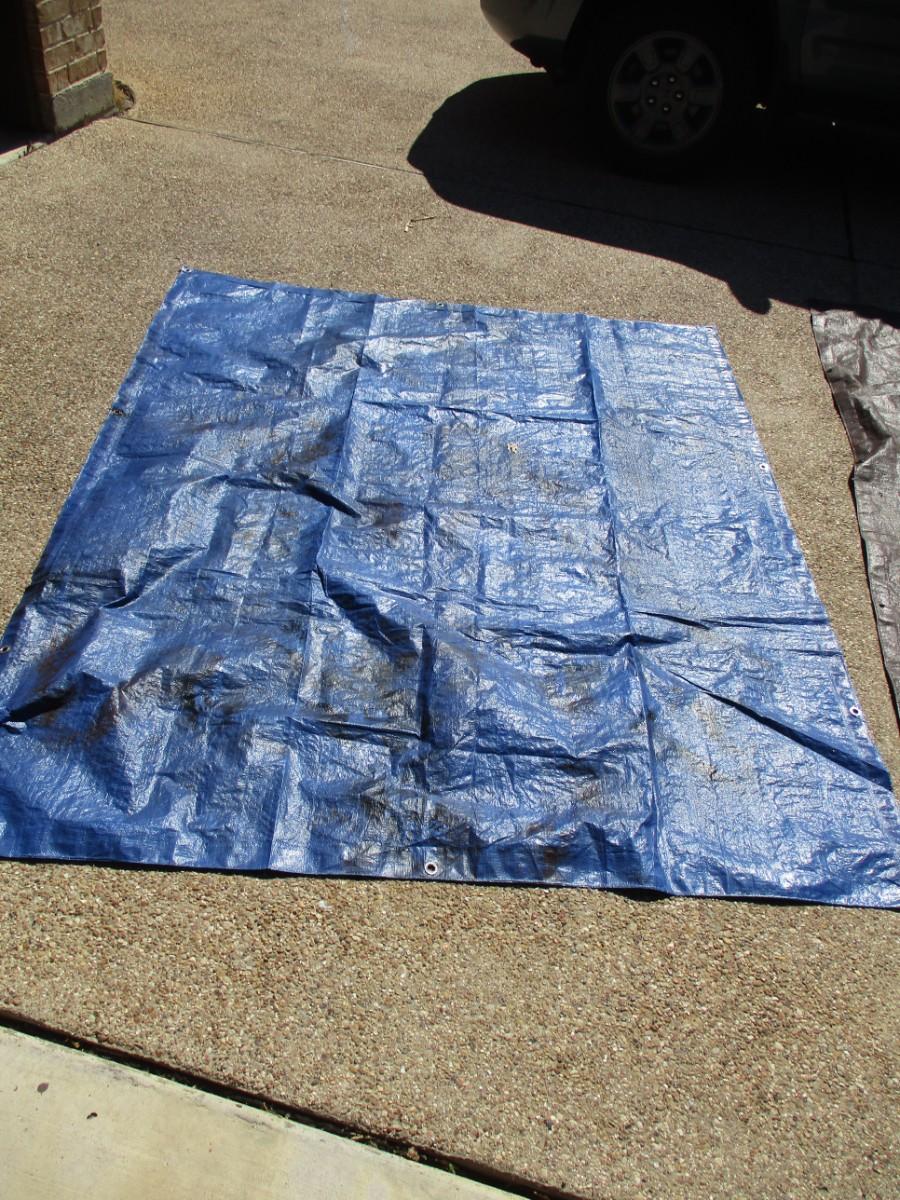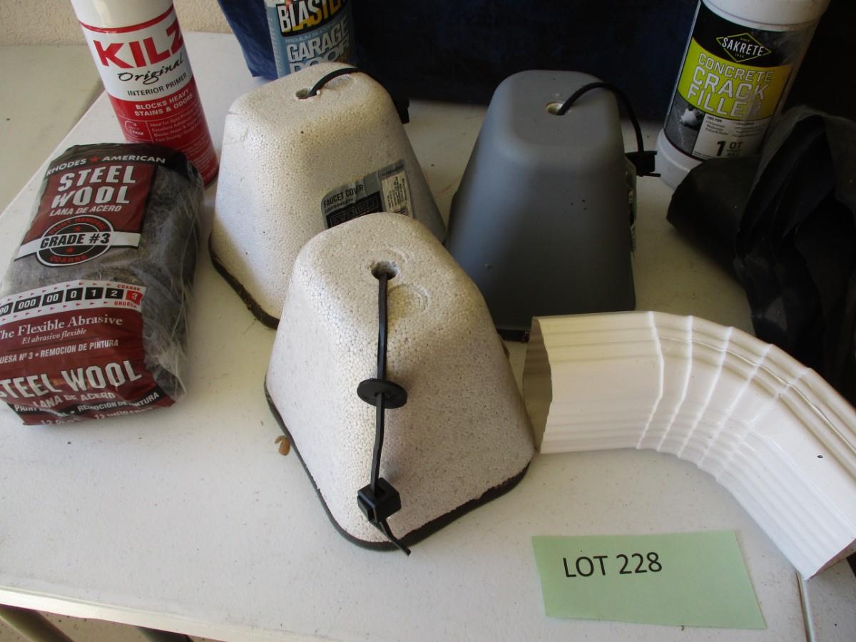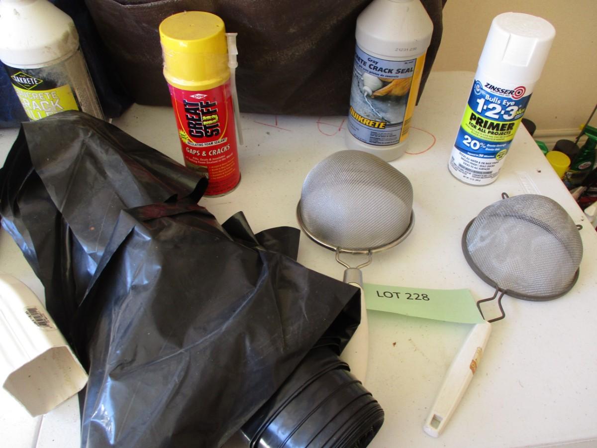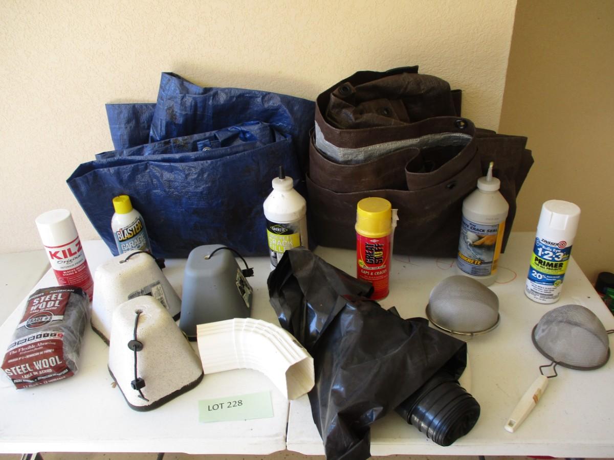Garden bags, faucet covers, concrete crack seal, Tarps 1 large/1 small. Garage door lubricant