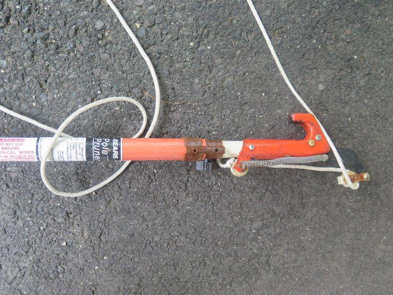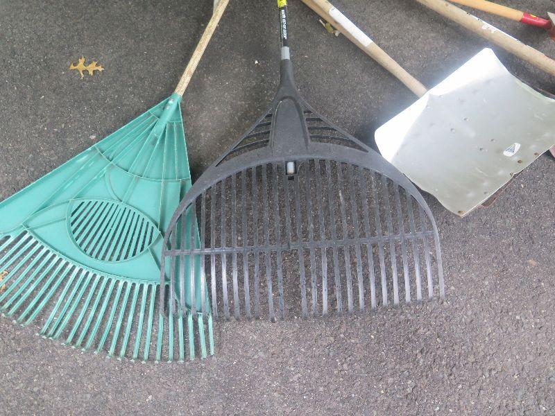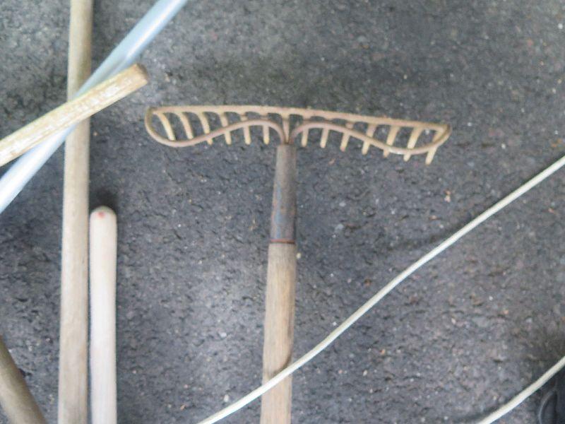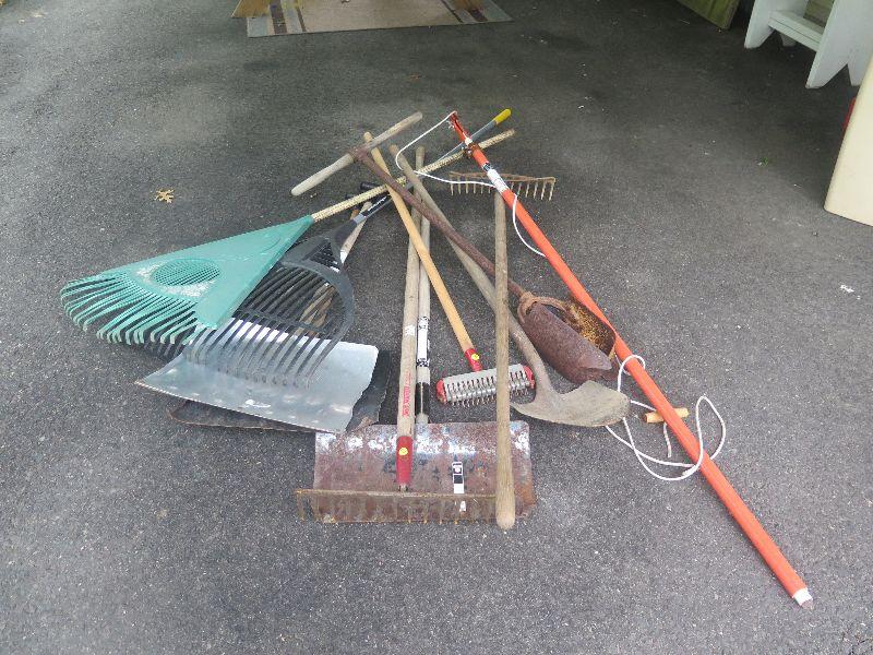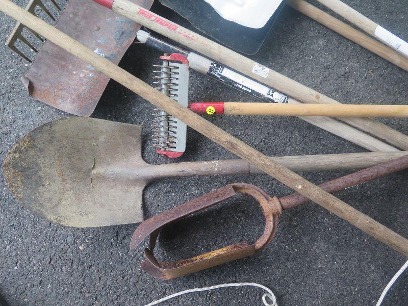 Rakes, shovels, tree pruner, post hole digger, very rusted, and more.