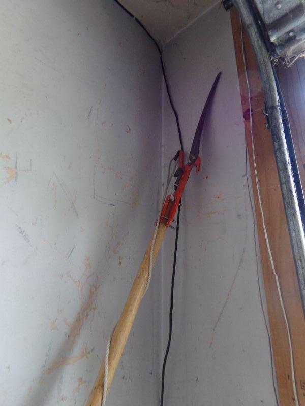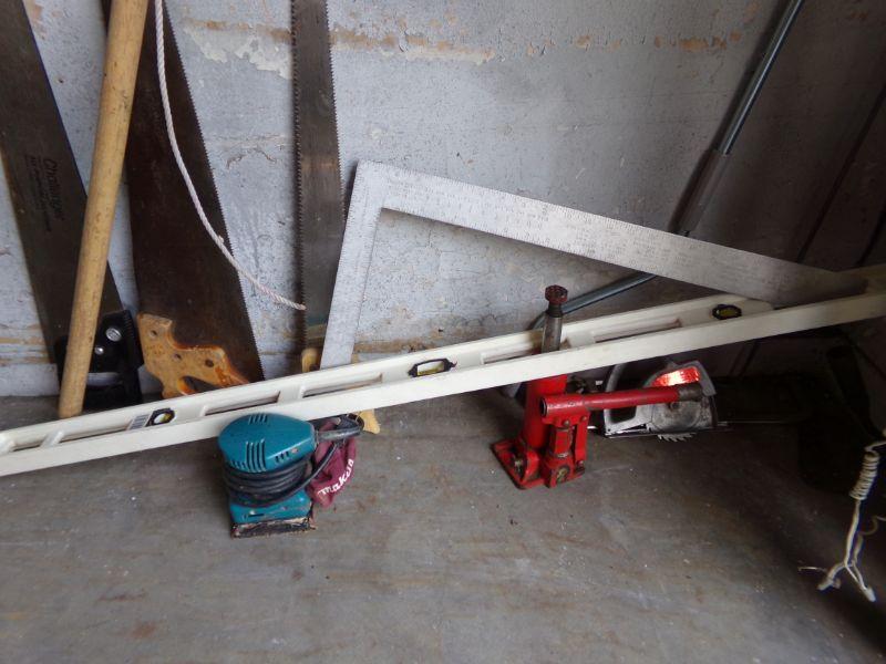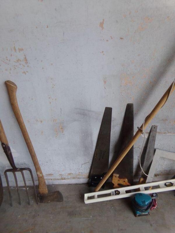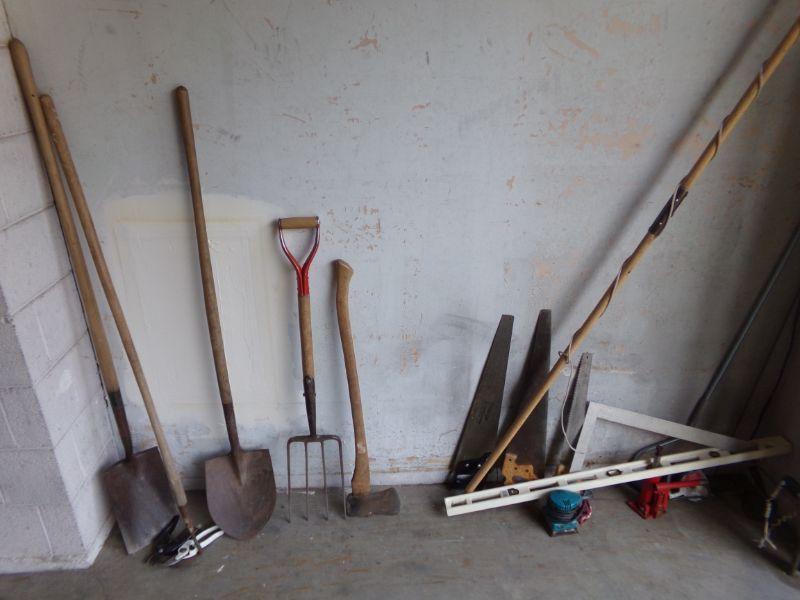 SHOVELS, PITCHFORK, SAWS, AX, BRANCH SAW, SANDER, JACK, AND LEVEL.
