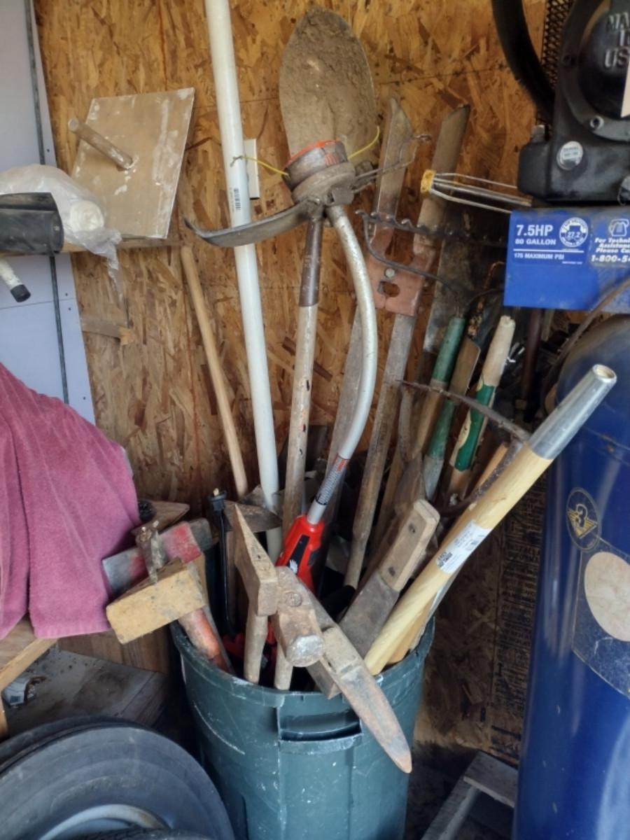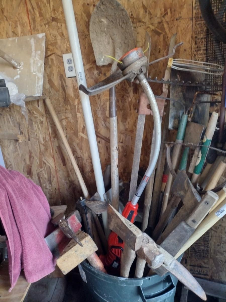 Axes, sledge hammers, and other yard tools. Includes contents of barrel.