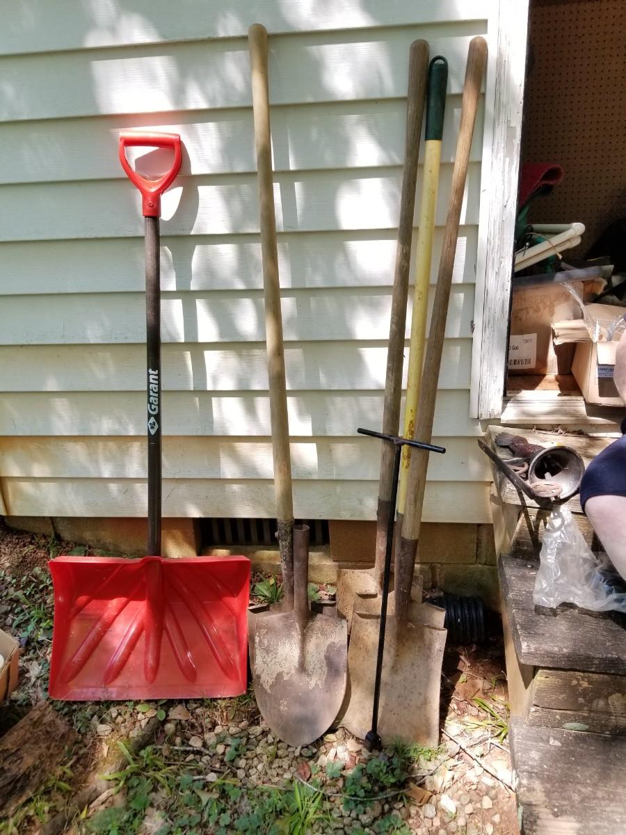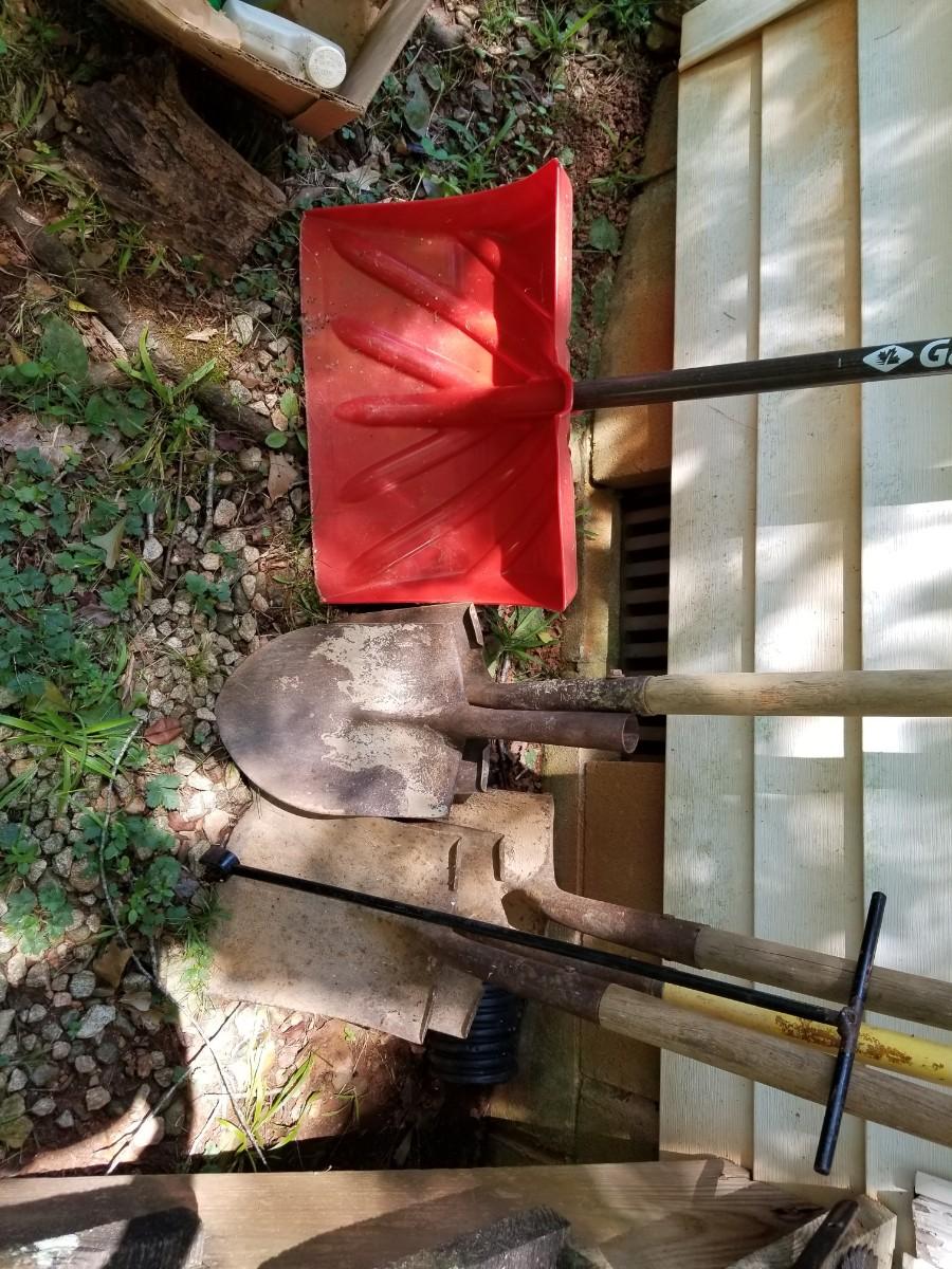 Variety of yard tools mostly shovels
