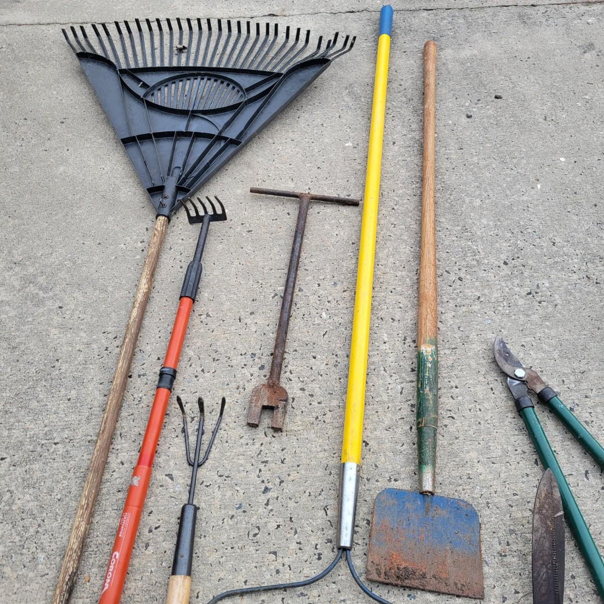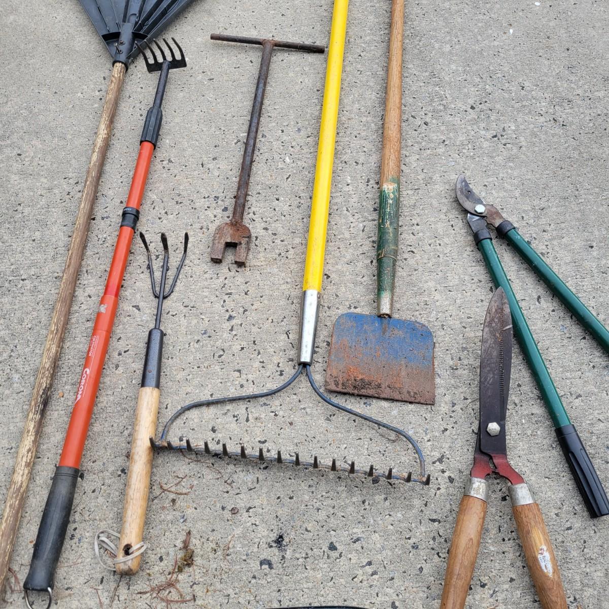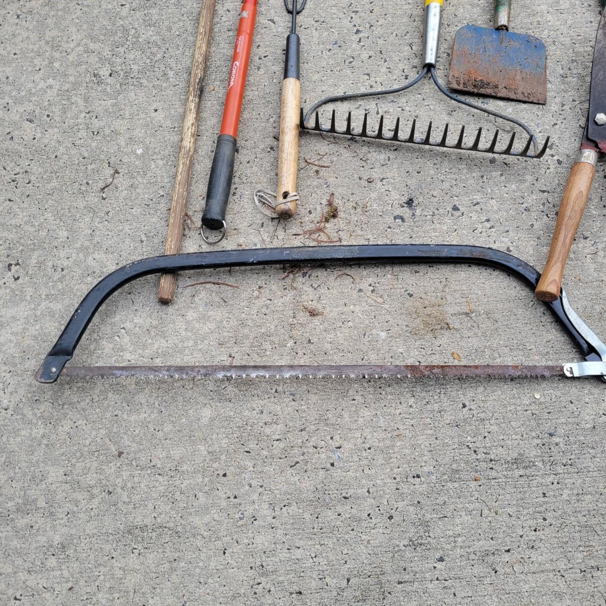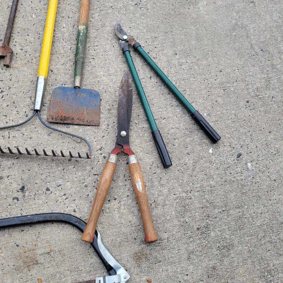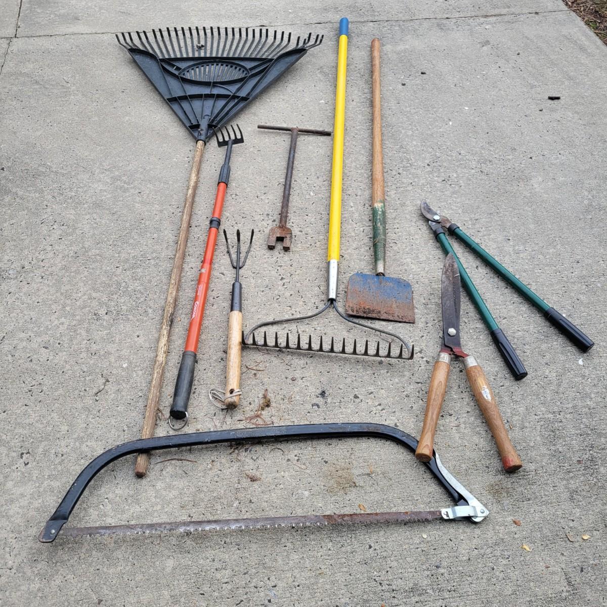 An assortment of yard tools that includes a rake, loppers, a bow saw, scraper and hoes. Local pickup only