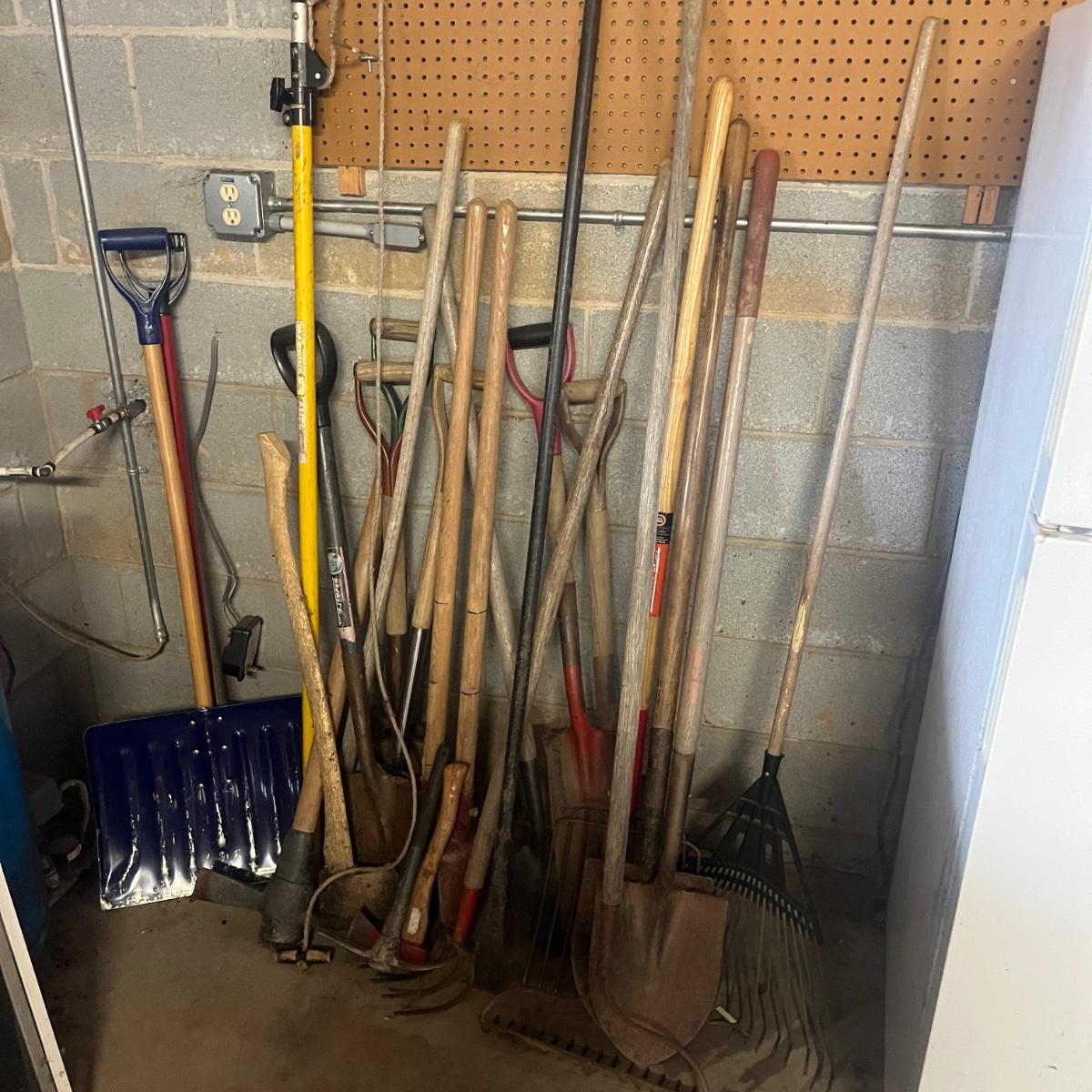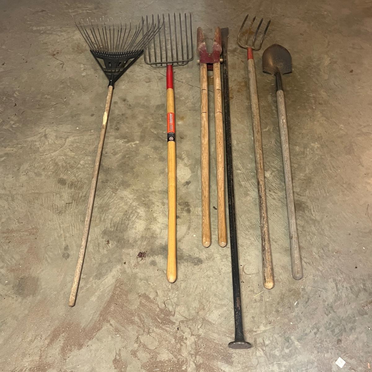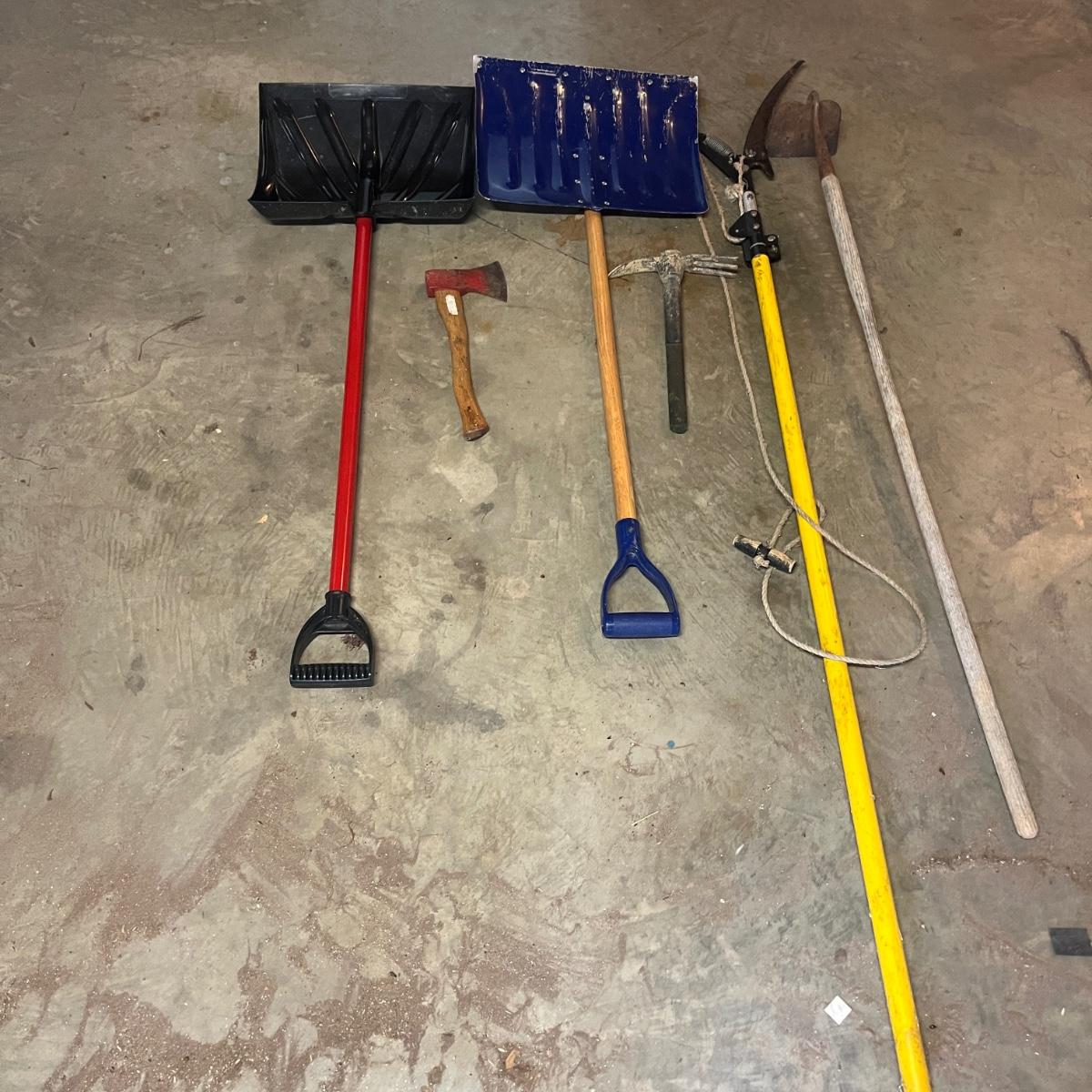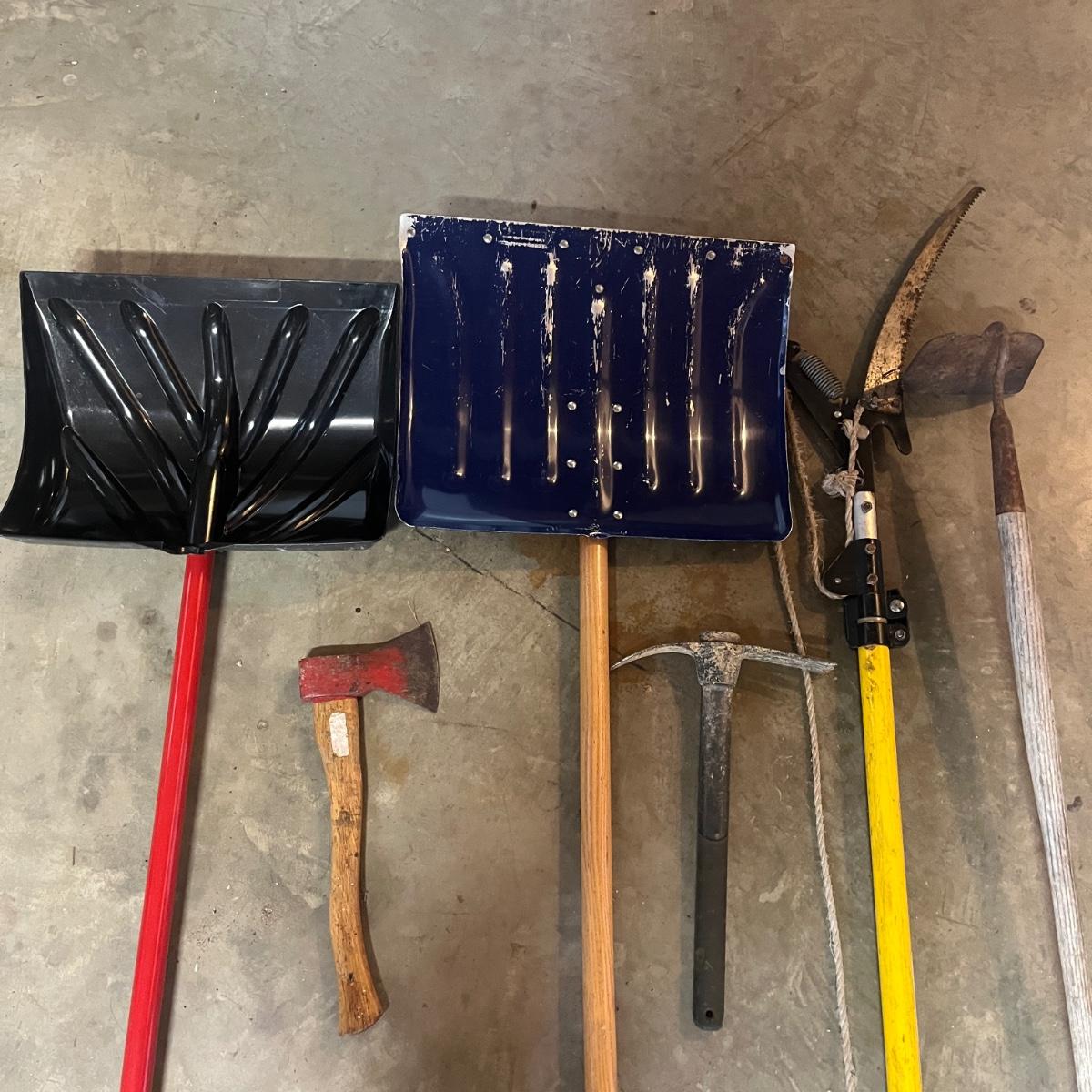Lot contains a large selection of yard tools including Lee Valley shovel, heavy rake, light rake, round and square shovels, pole saw, potato fork, ax, pickax, snow shovels , heavy iron tamper and more.