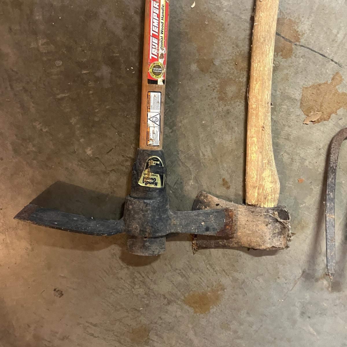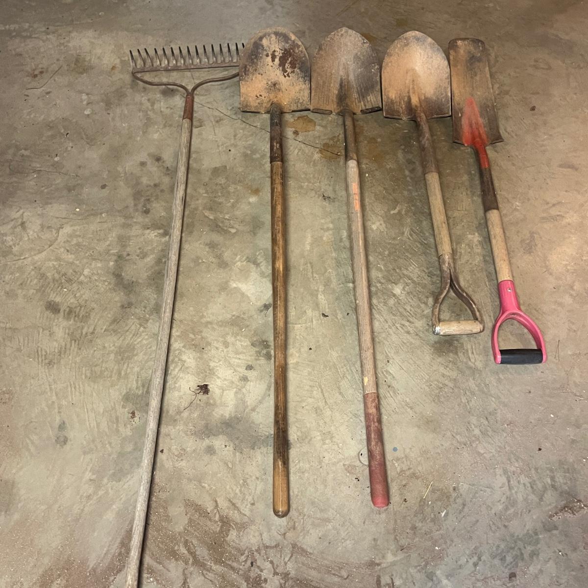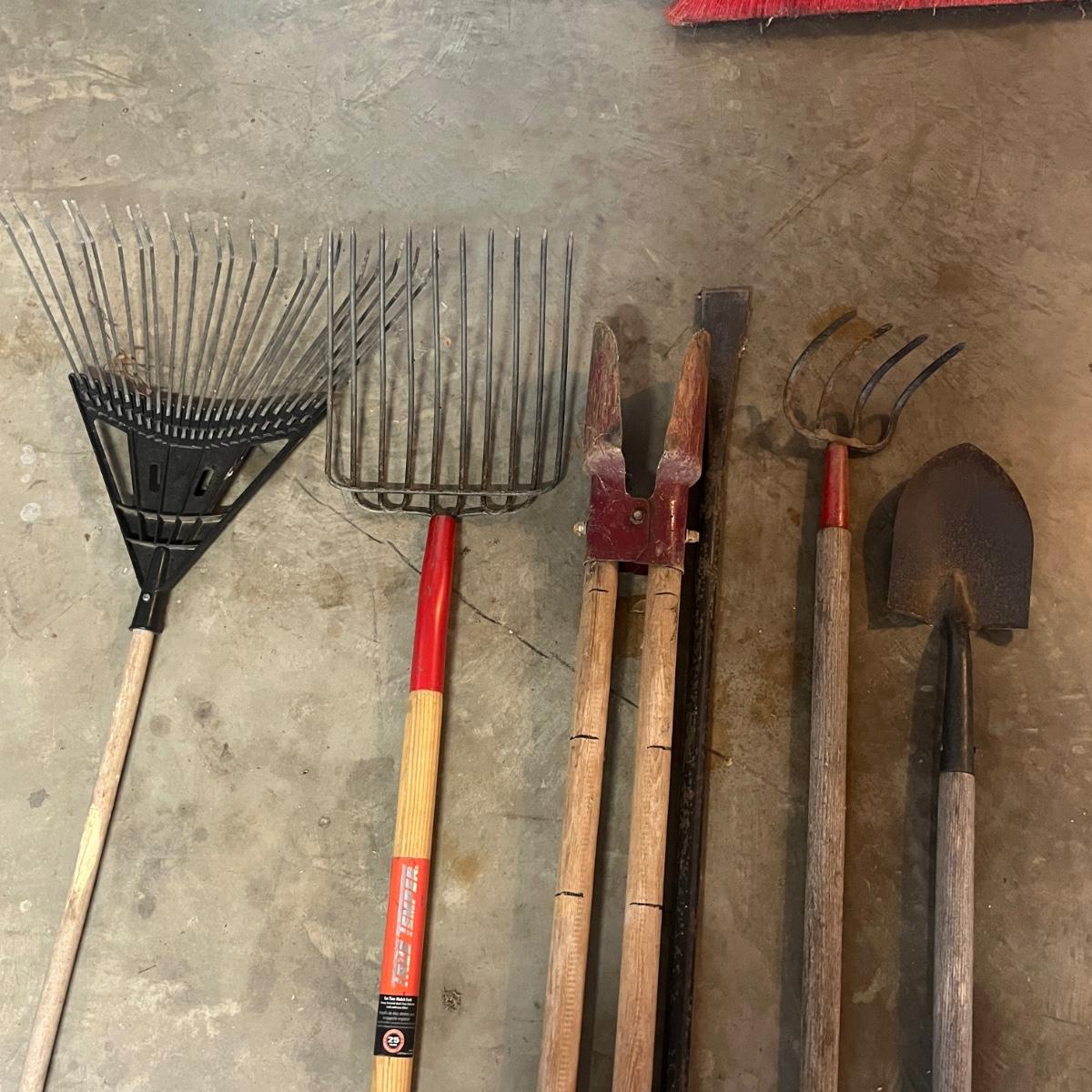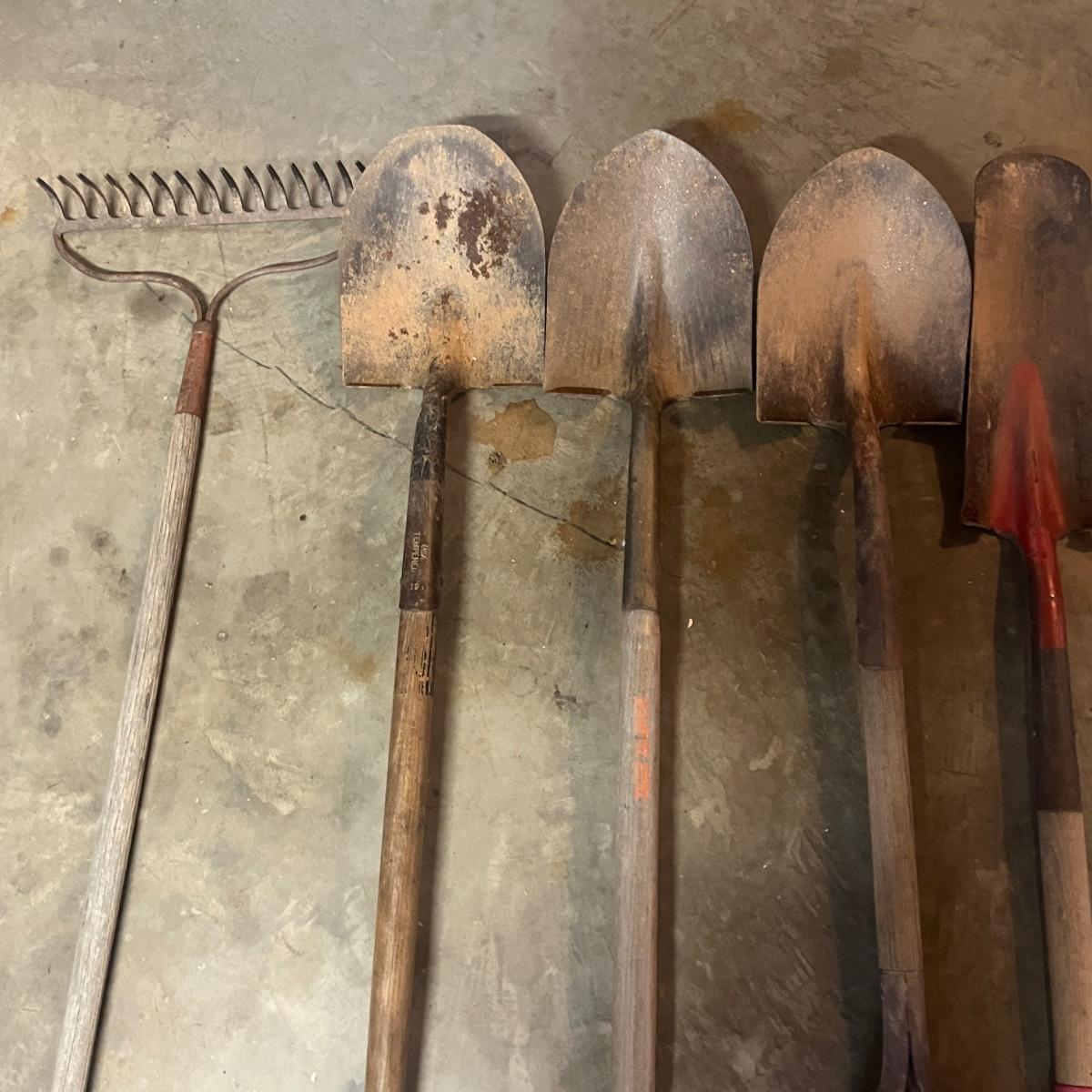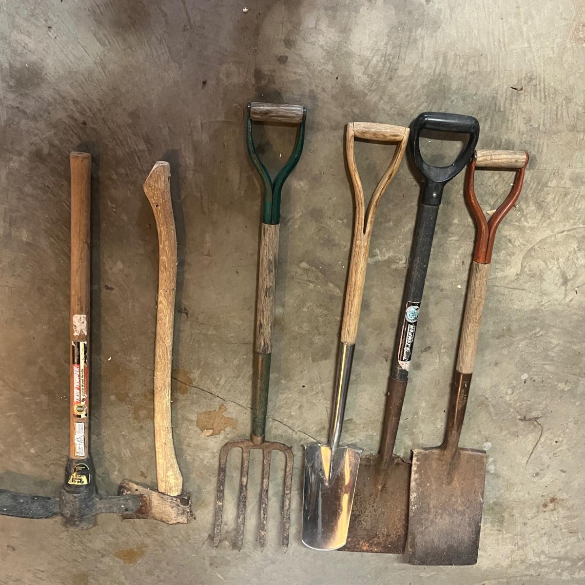 Lot contains a large selection of yard tools including Lee Valley shovel, heavy rake, light rake, round and square shovels, pole saw, potato fork, ax, pickax, snow shovels , heavy iron tamper and more.