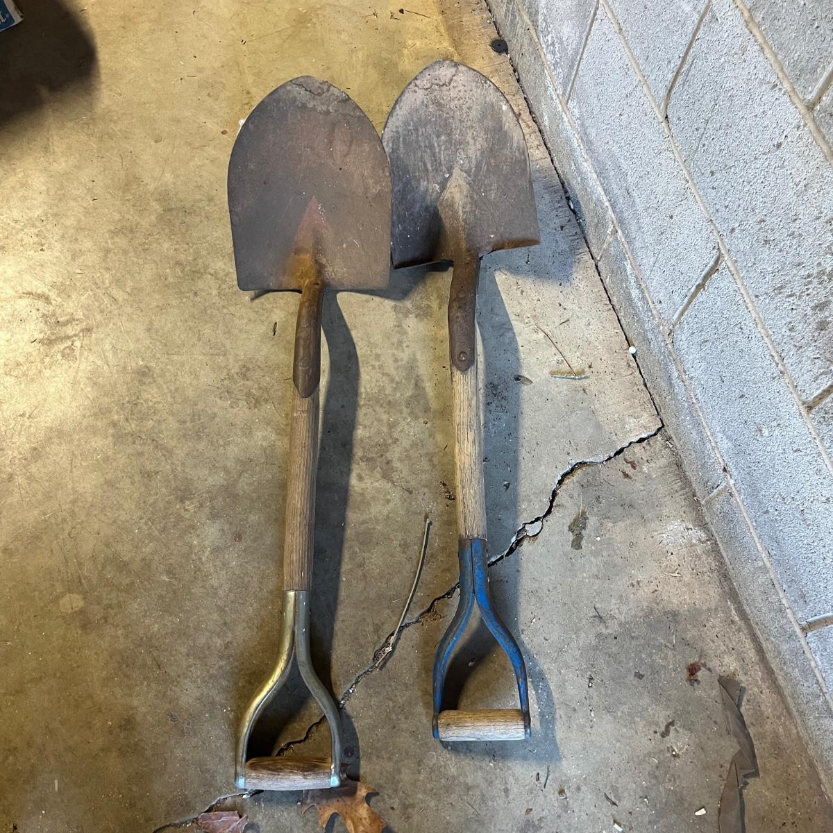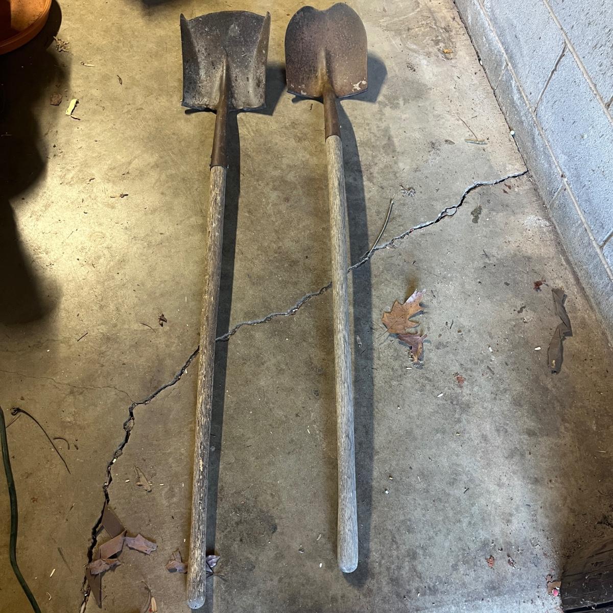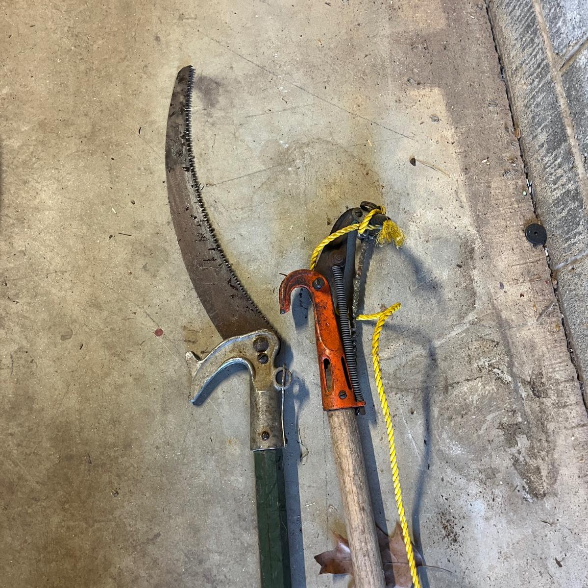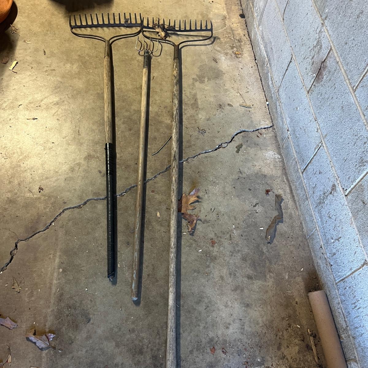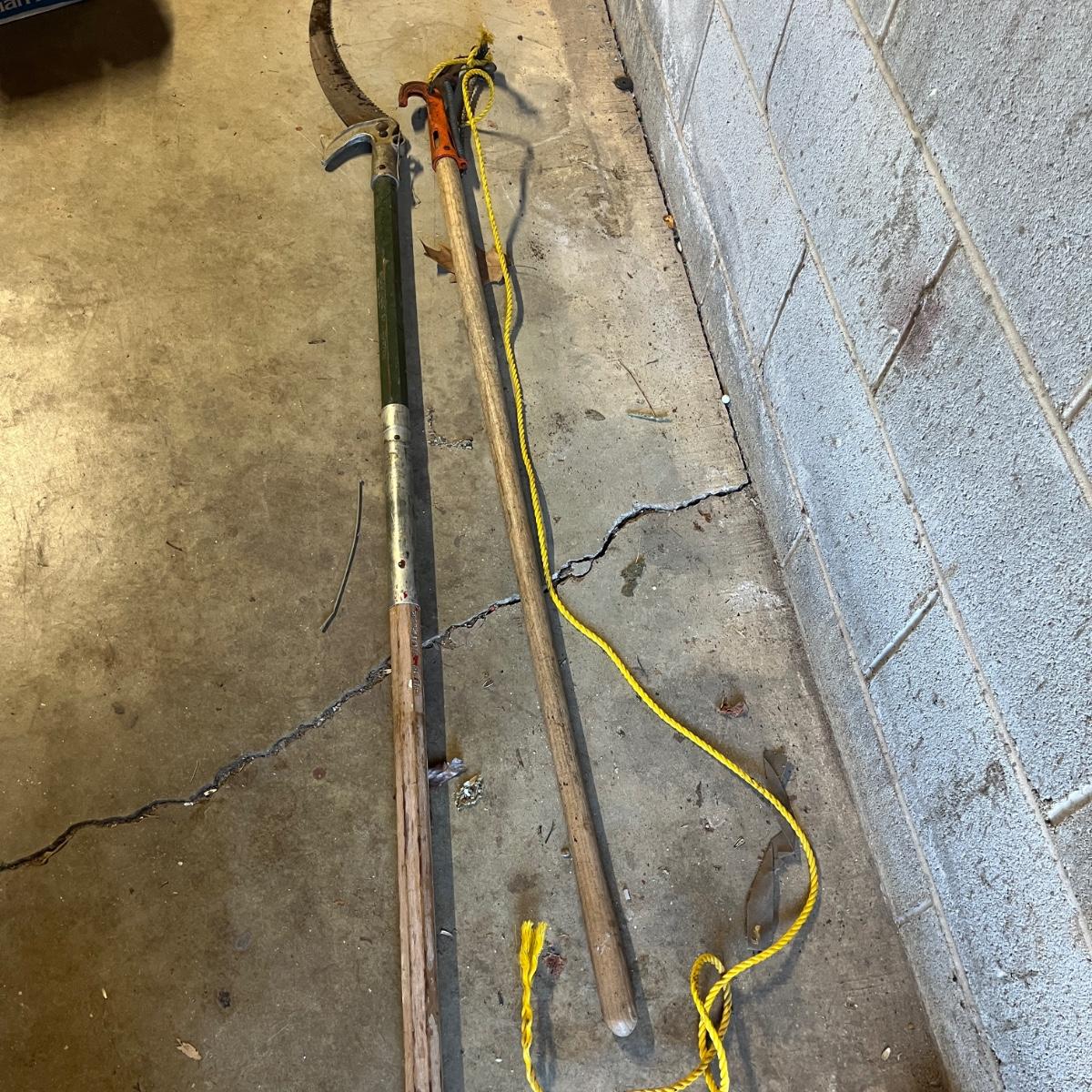 Lot includes shovels, snow shovel, pole saw, rakes, grain shovel and more.