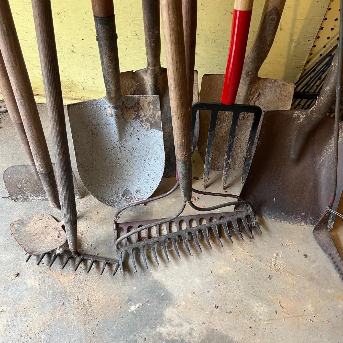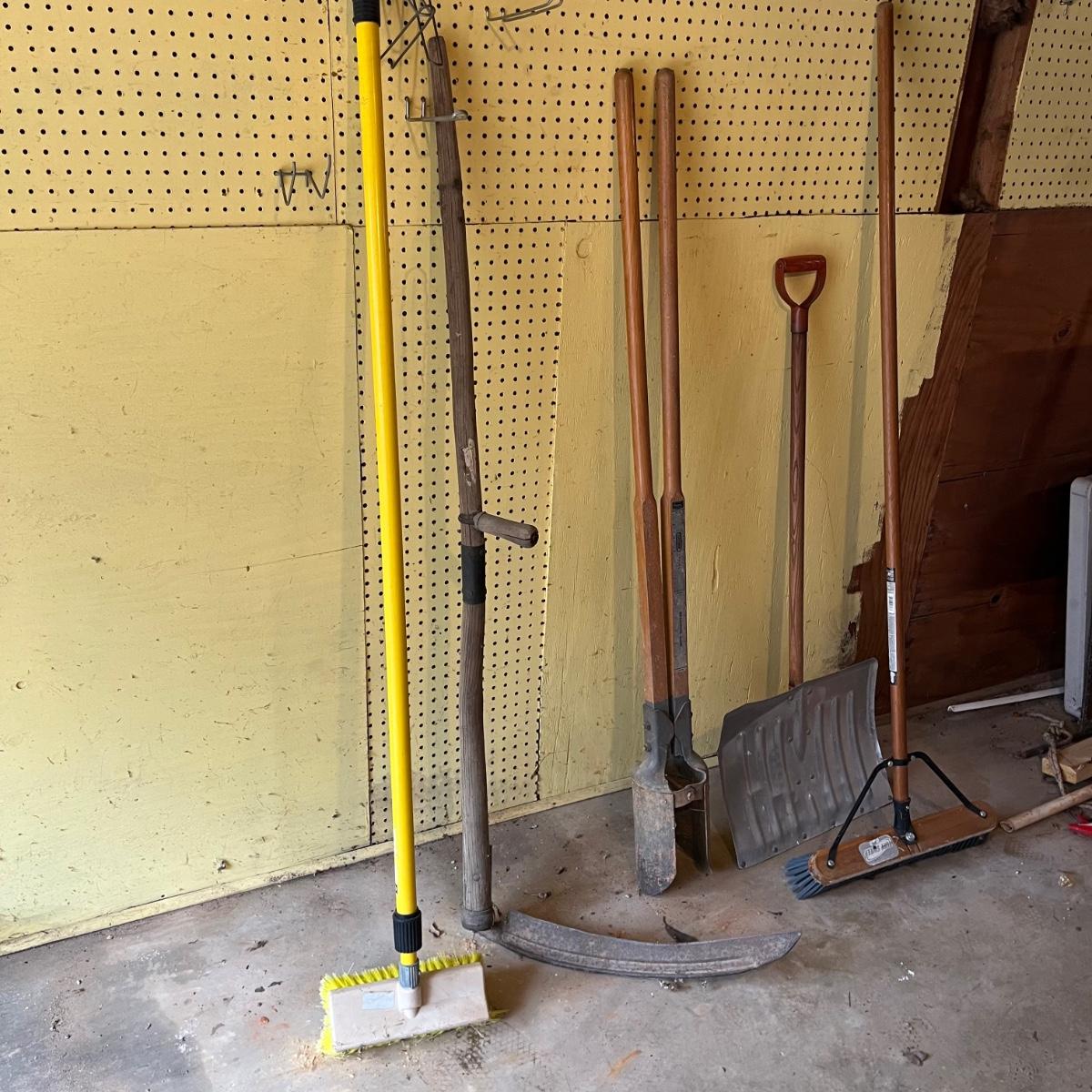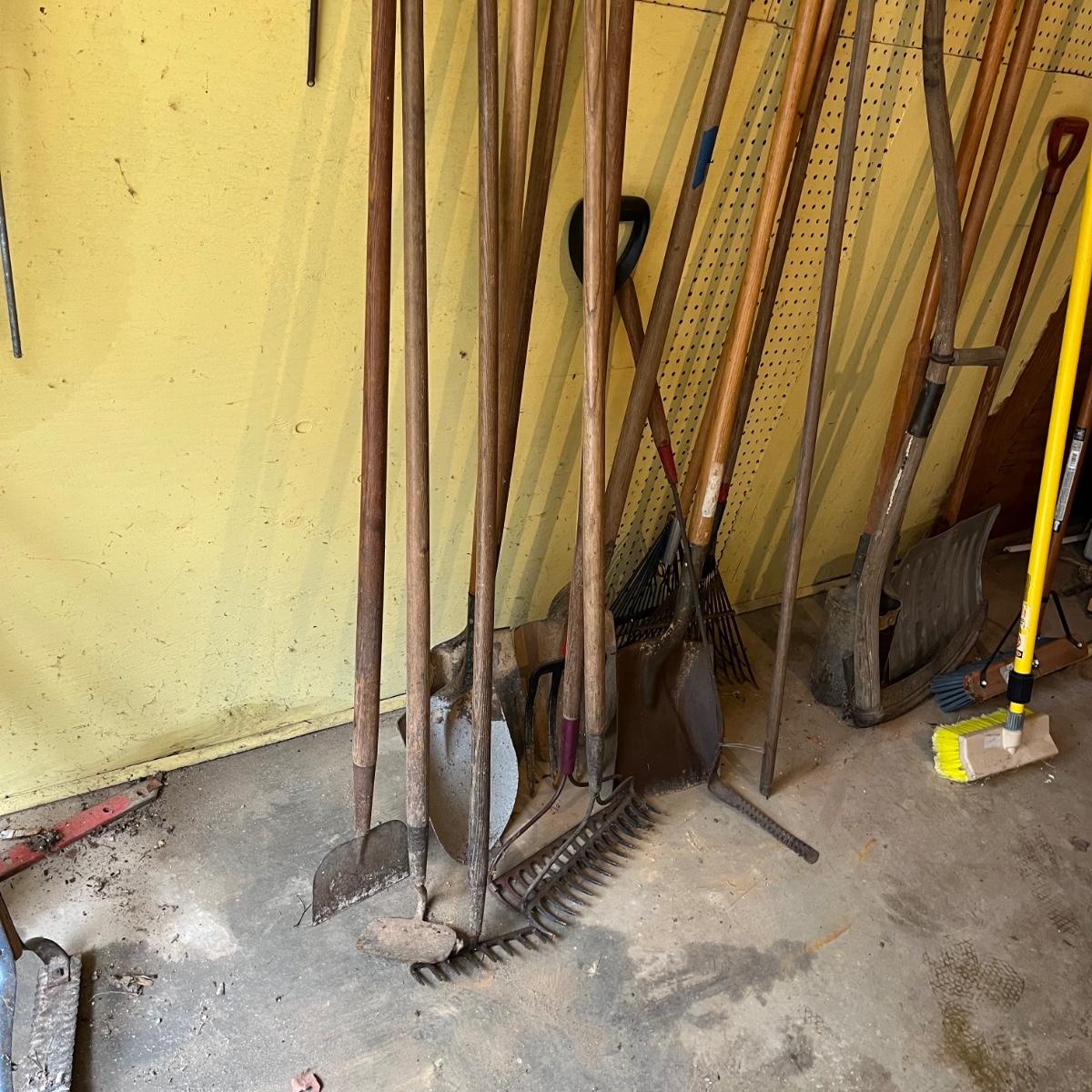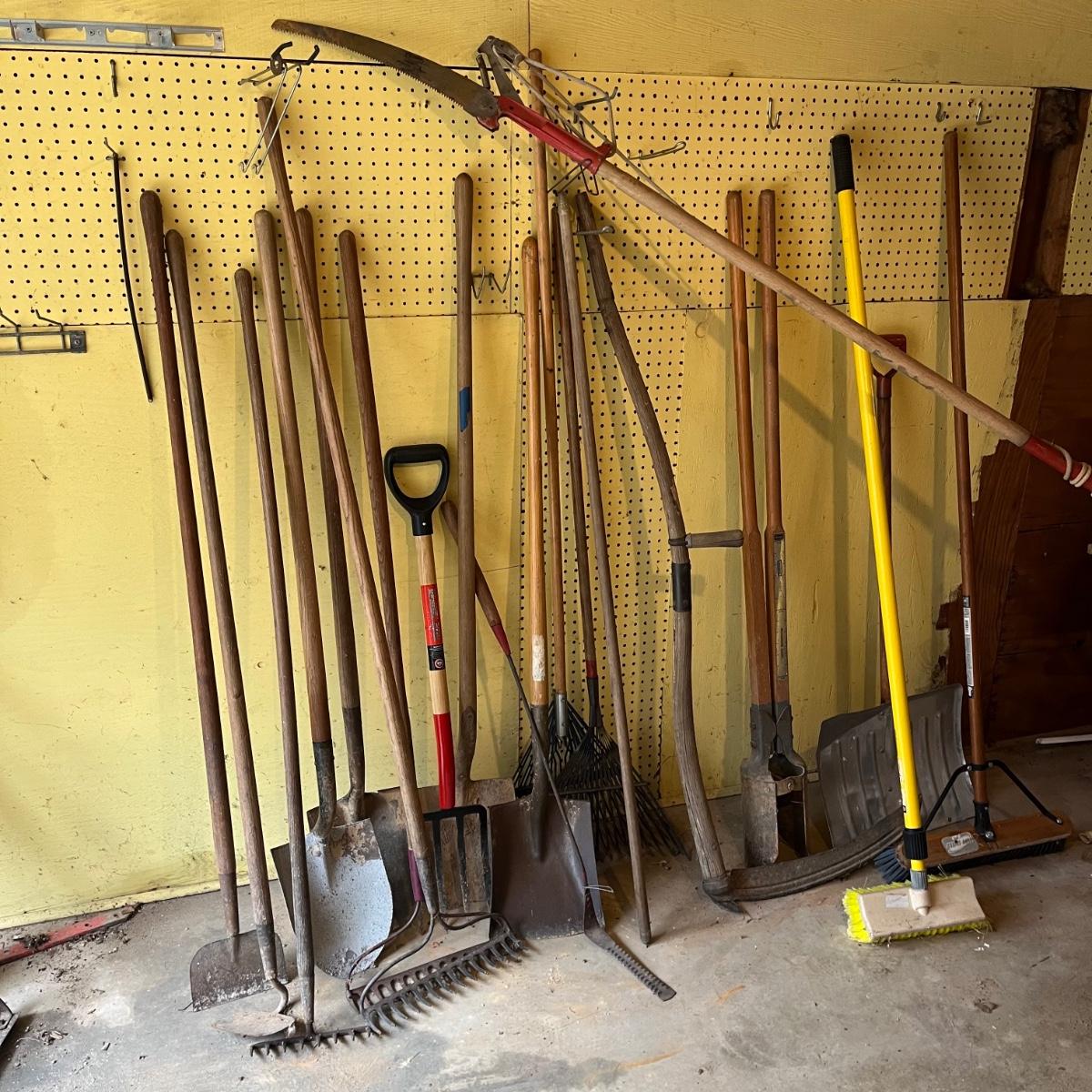 Lot includes three shovels, snow shovel, pole saw, two heavy rake, two light rakes, hoe, broom, scythe, post hole digger, potato fork and more. Pole saw measures 116” long.