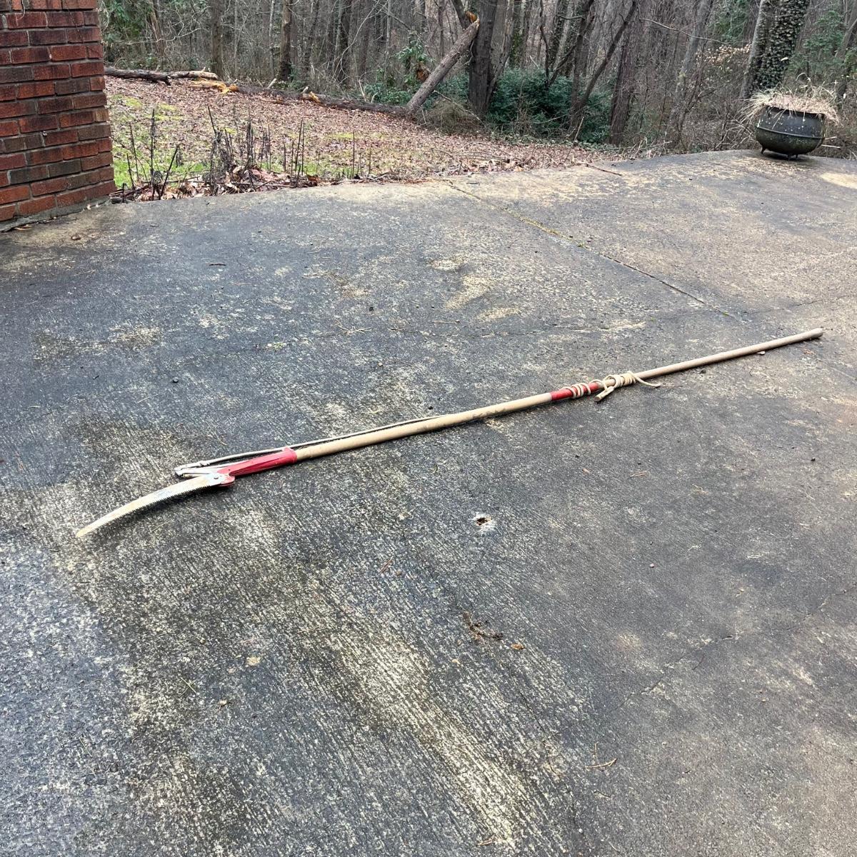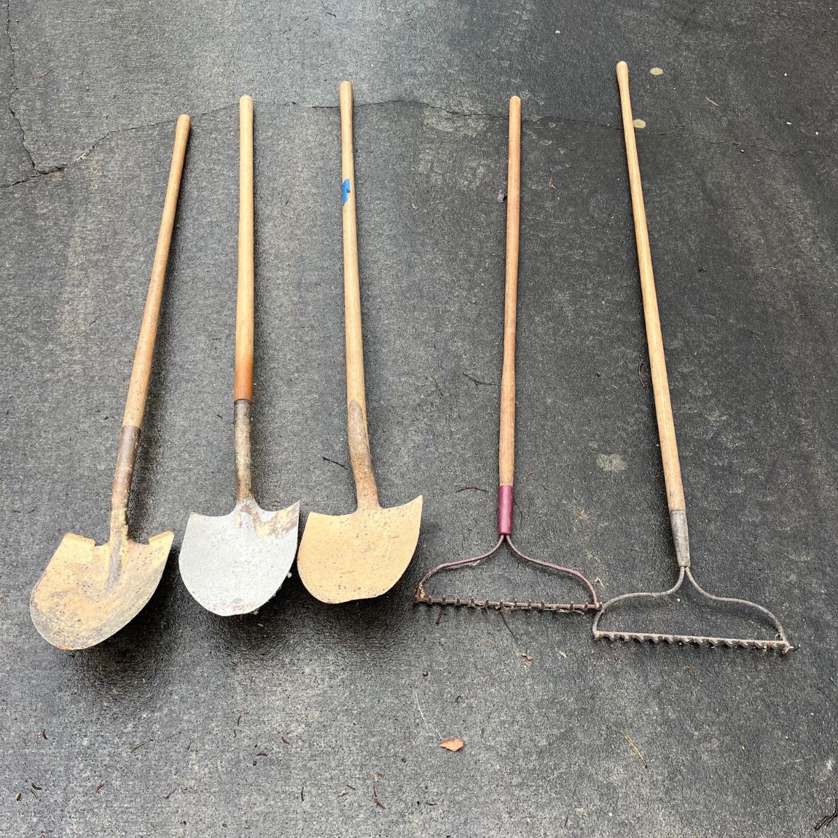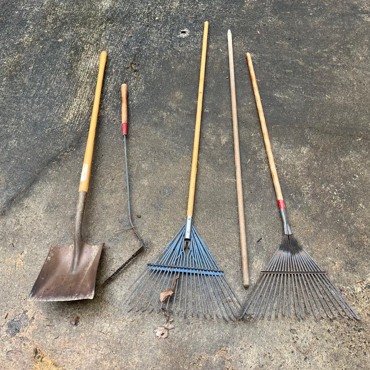 Lot includes three shovels, snow shovel, pole saw, two heavy rake, two light rakes, hoe, broom, scythe, post hole digger, potato fork and more. Pole saw measures 116” long.