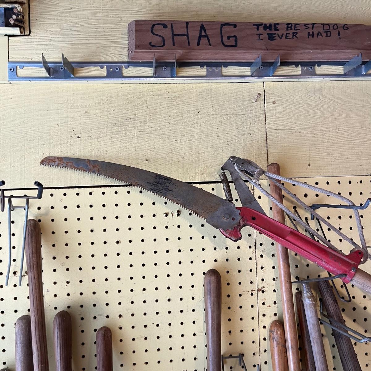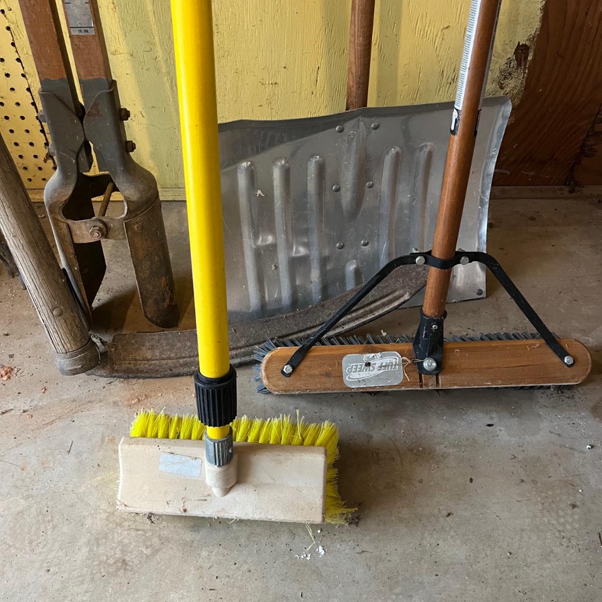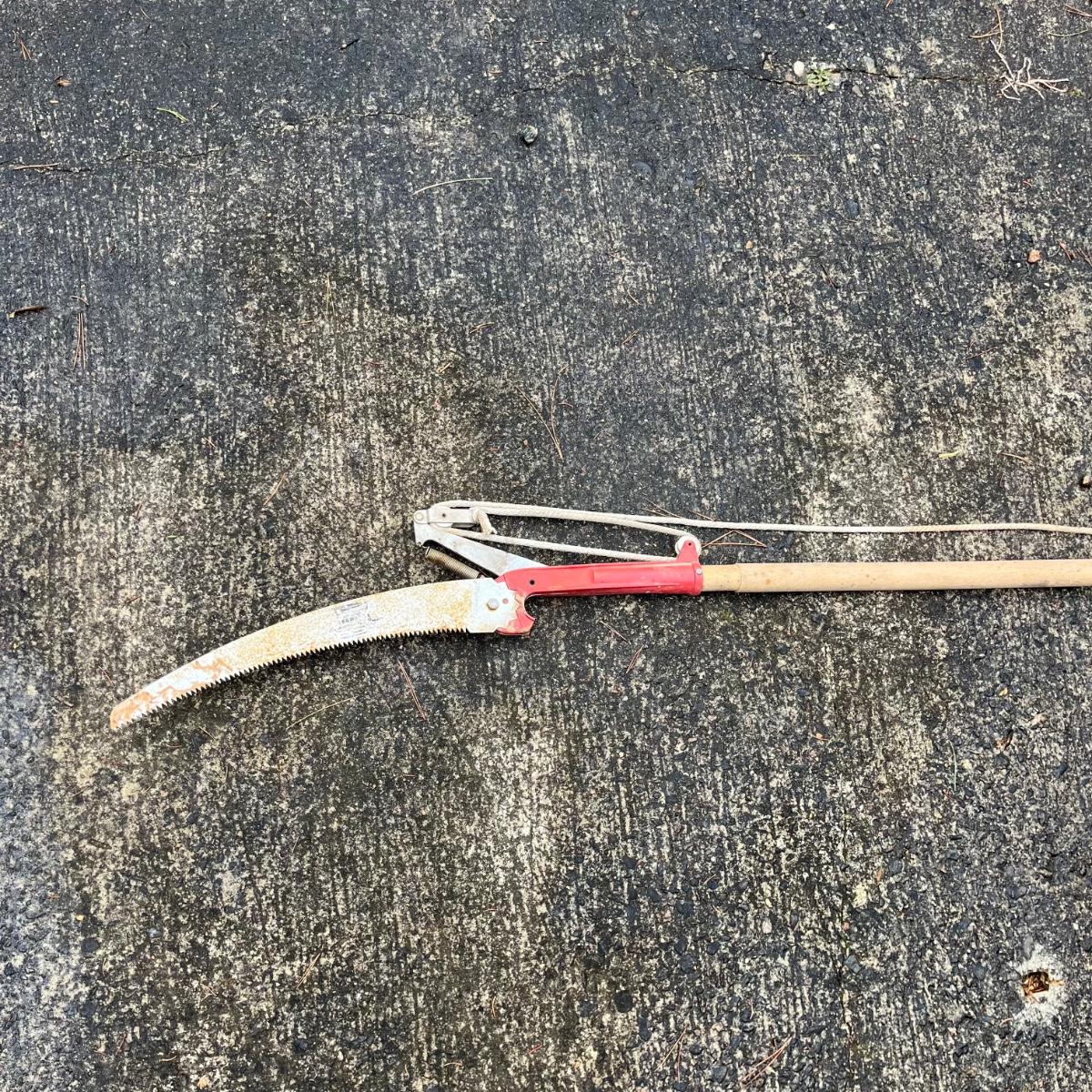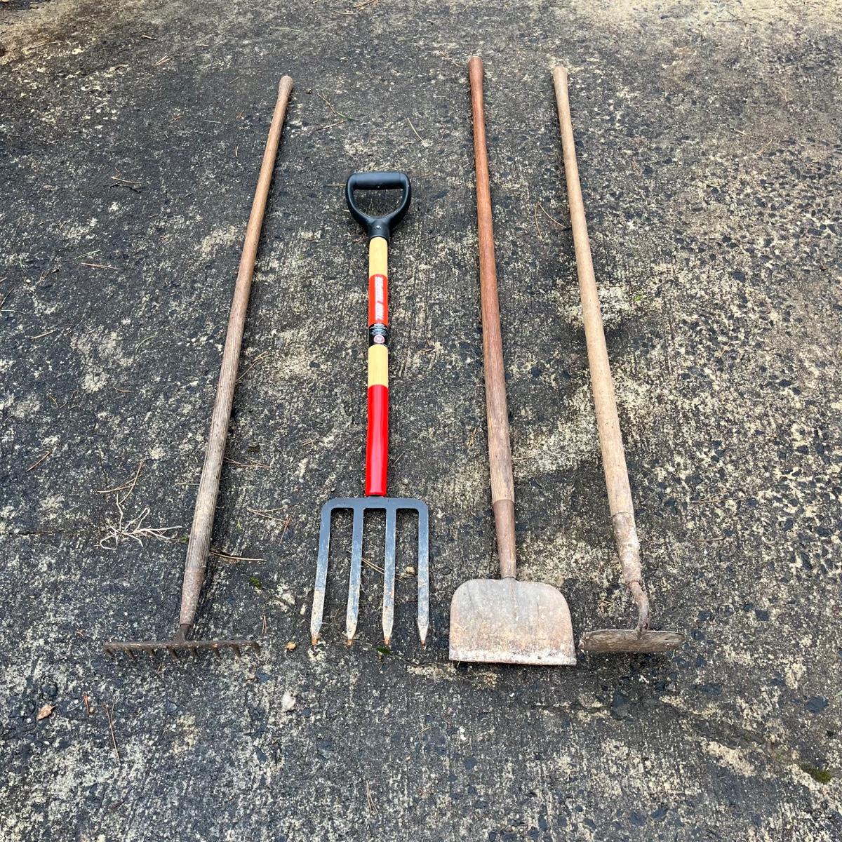 Lot includes three shovels, snow shovel, pole saw, two heavy rake, two light rakes, hoe, broom, scythe, post hole digger, potato fork and more. Pole saw measures 116” long.