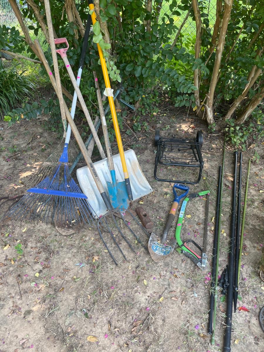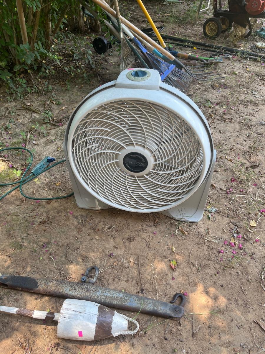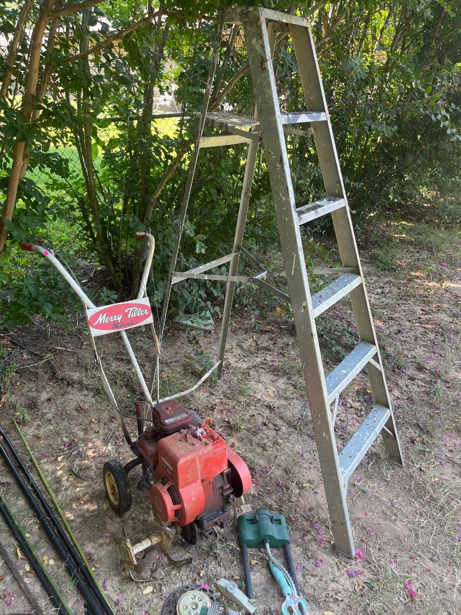 Yard tools, fan, ladder, tiller, chair, hydraulic jack