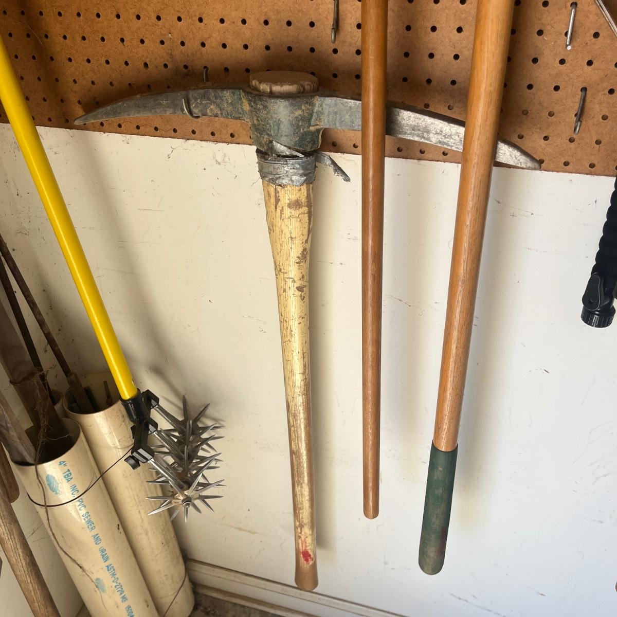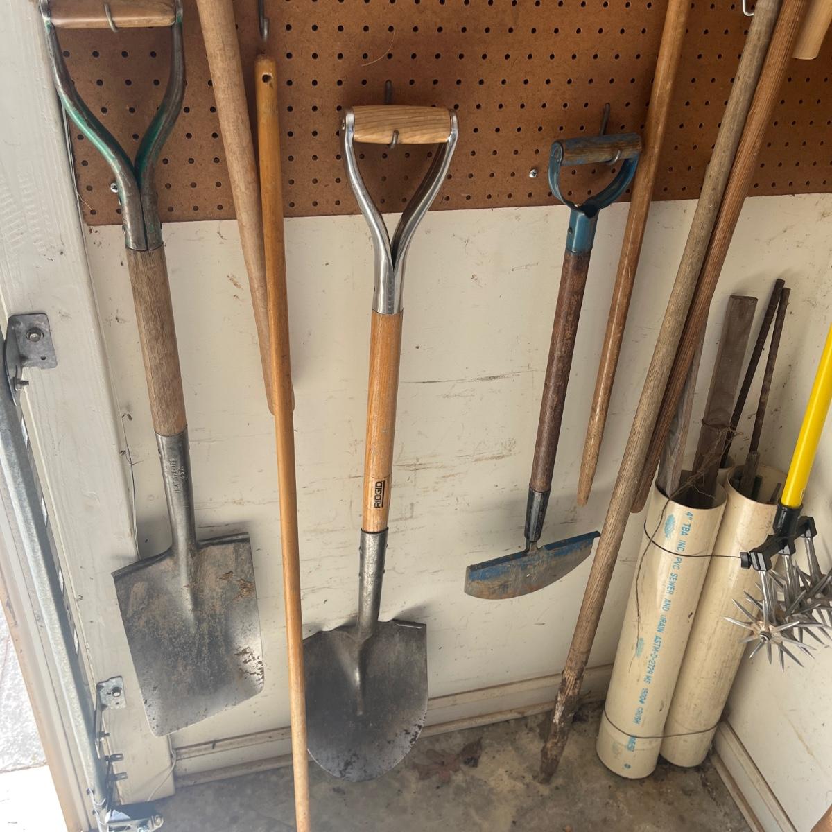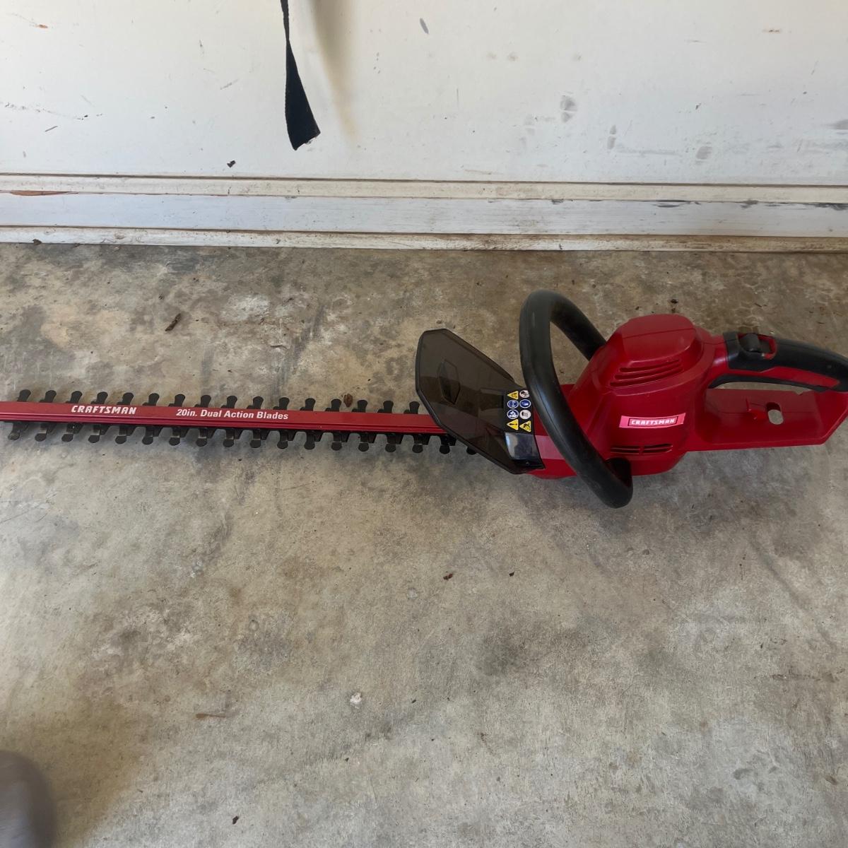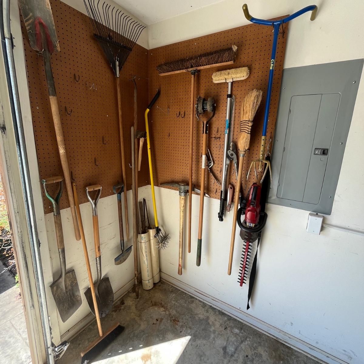 Lot includes Craftsman electric 20” hedge trimmer, pick ax, rake, shovels, broom, loppers and more.