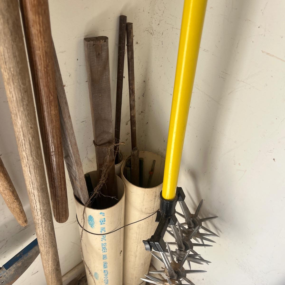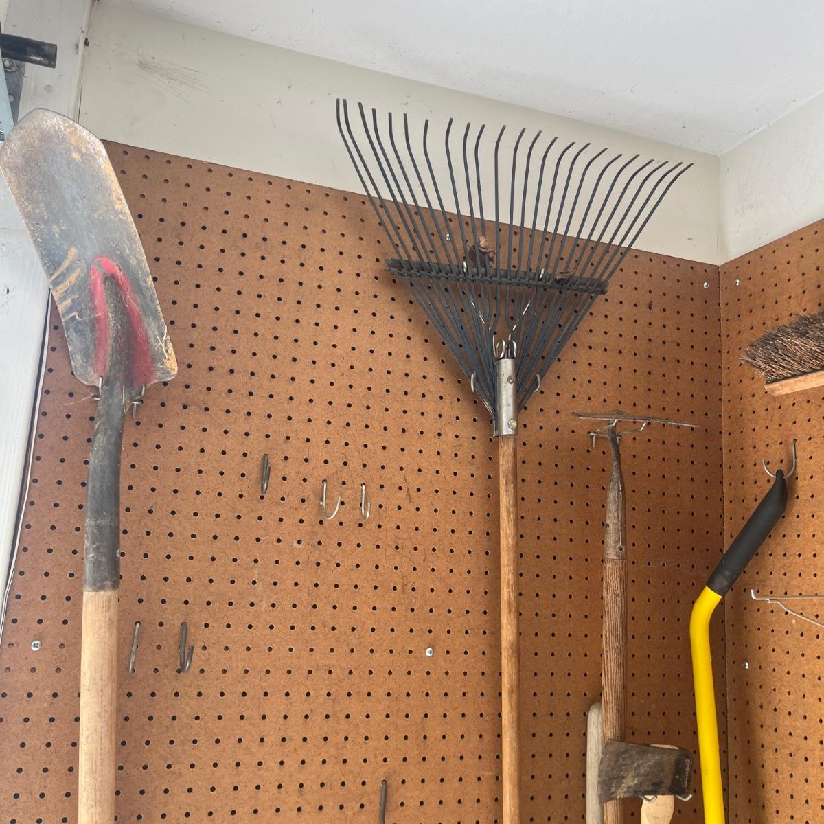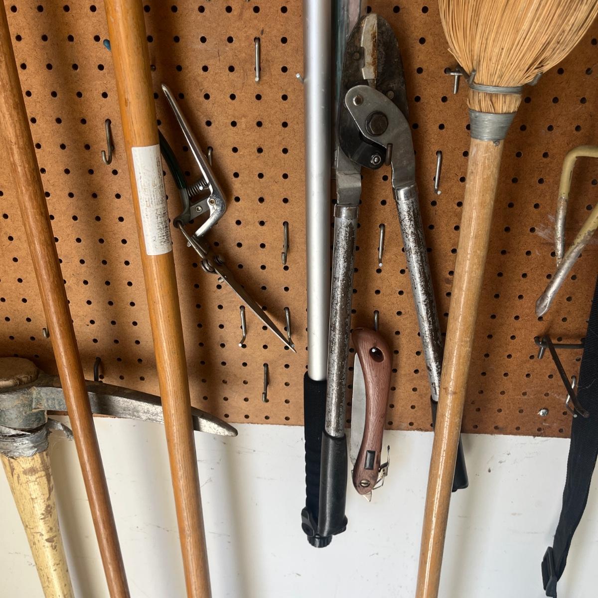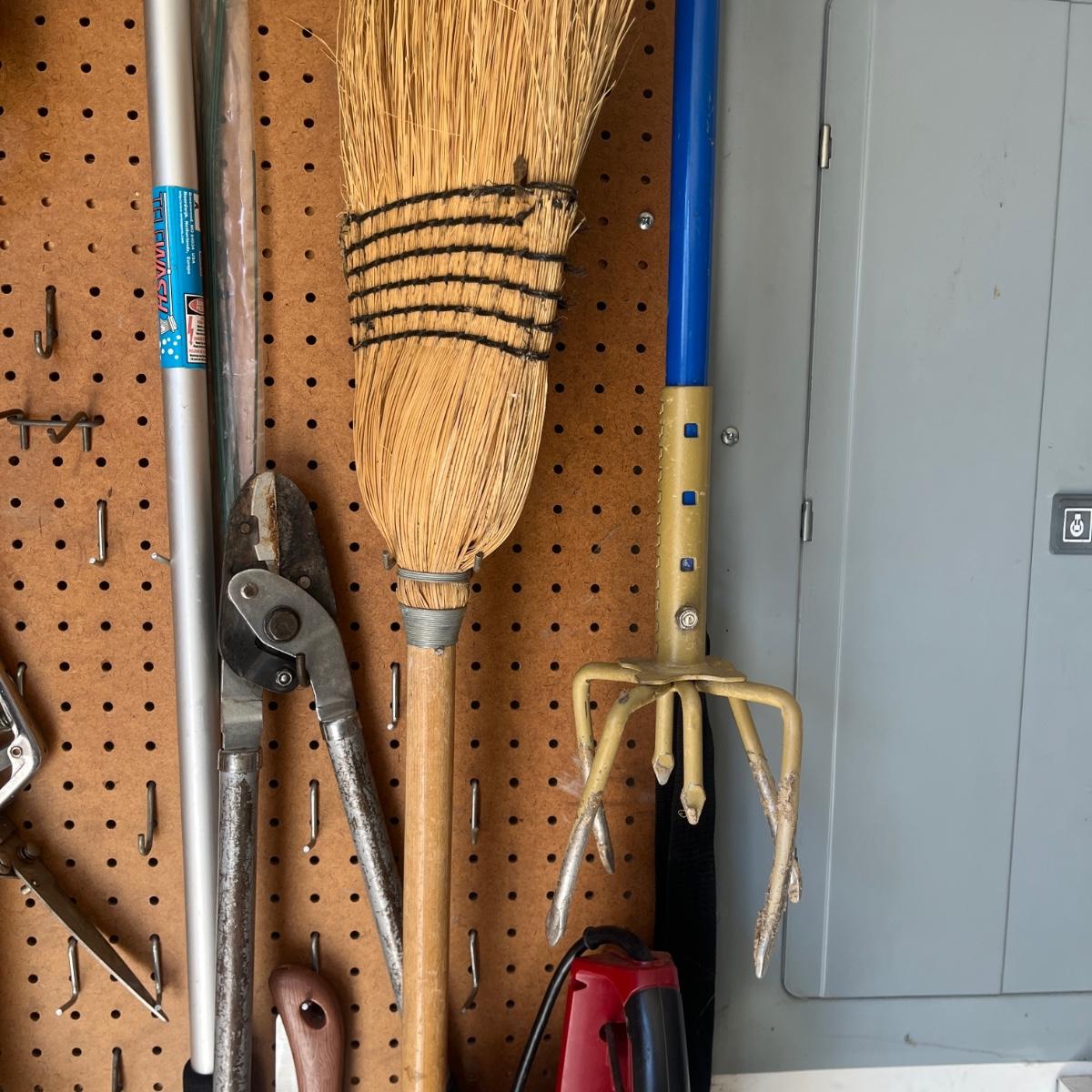 Lot includes Craftsman electric 20” hedge trimmer, pick ax, rake, shovels, broom, loppers and more.