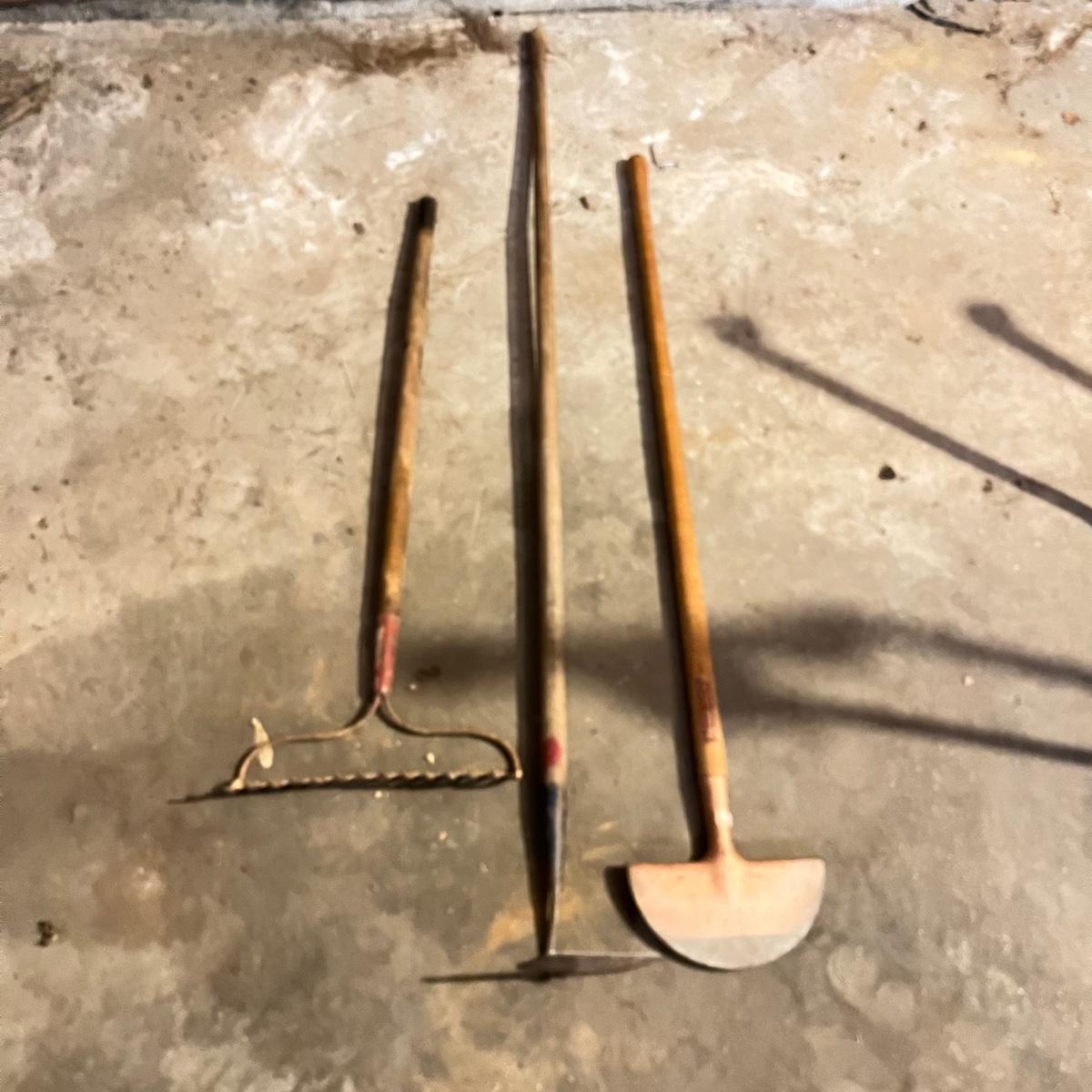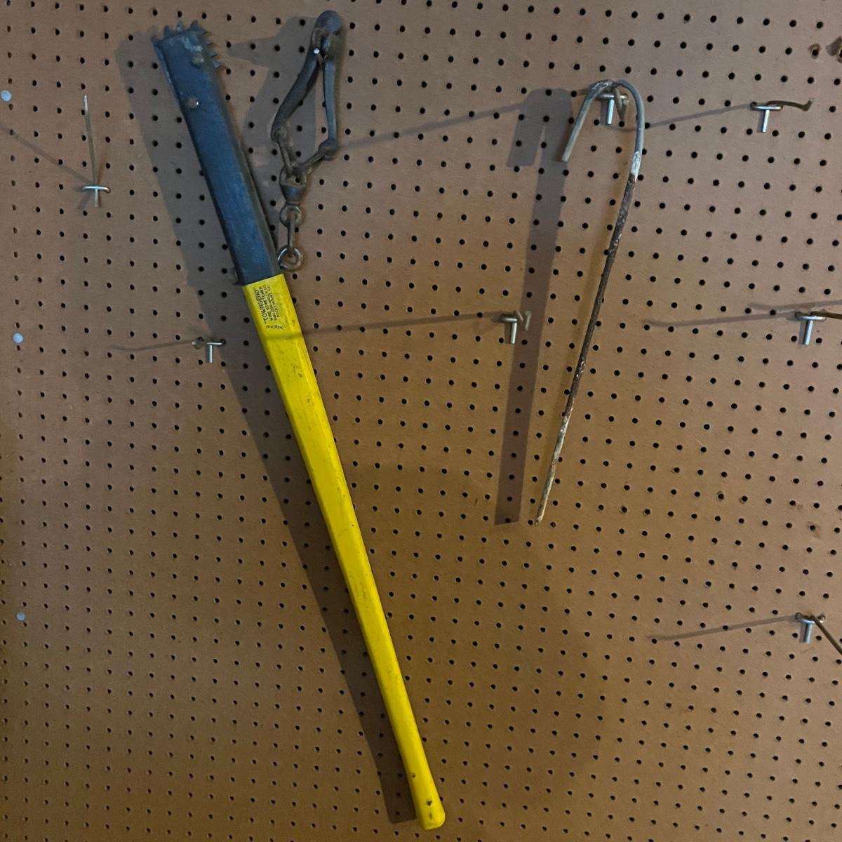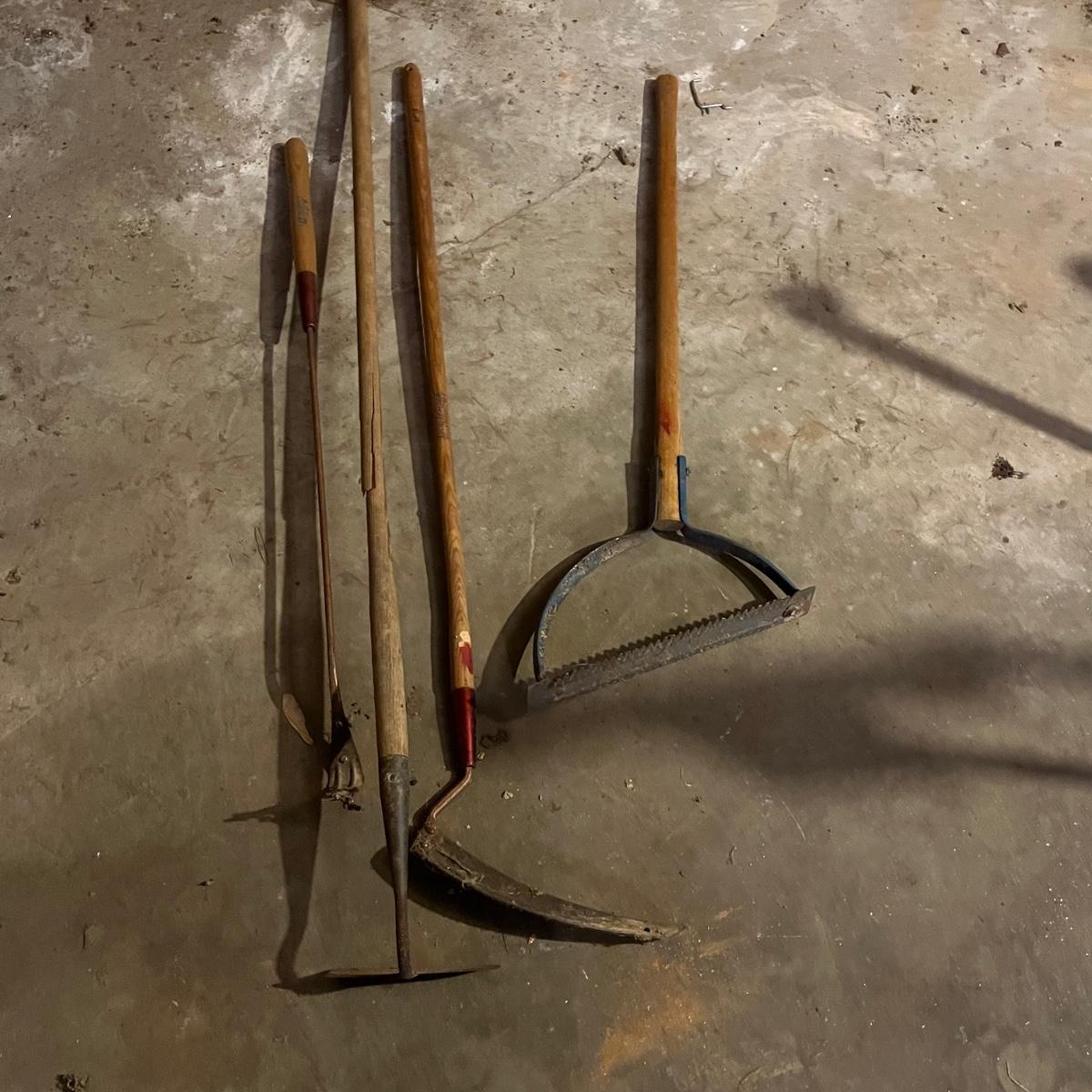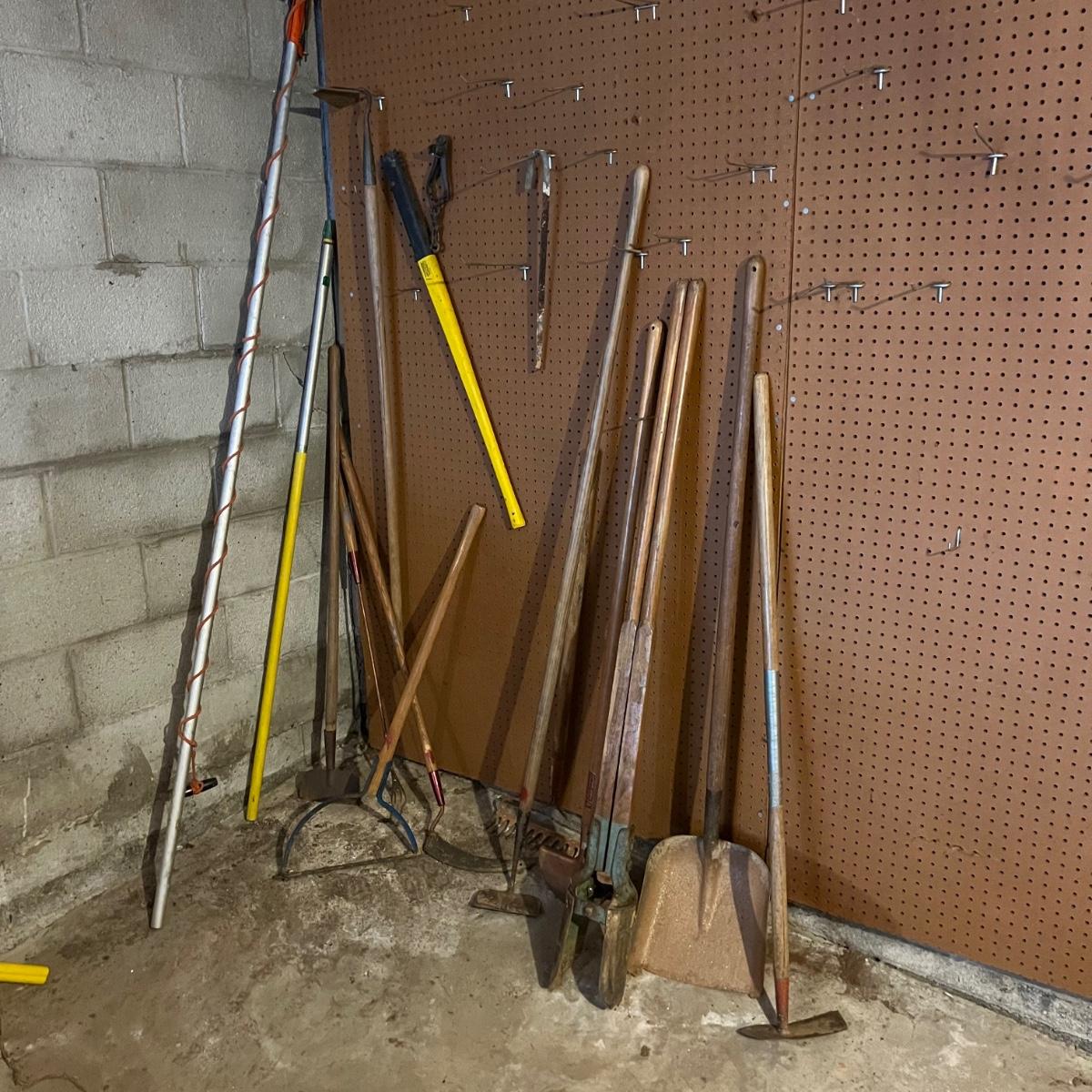 Lot contains an assortment of yard tools including pole saw, wire stretcher, heavy rake, post hole digger, scythe, hoe, shovel, and more. Pole saw measures 102” long.