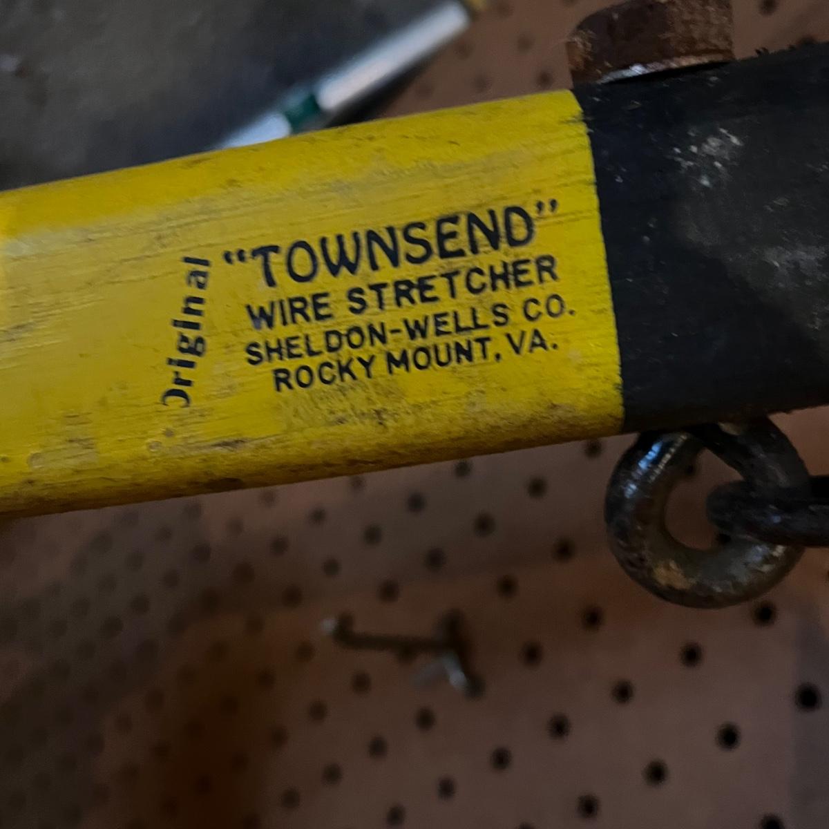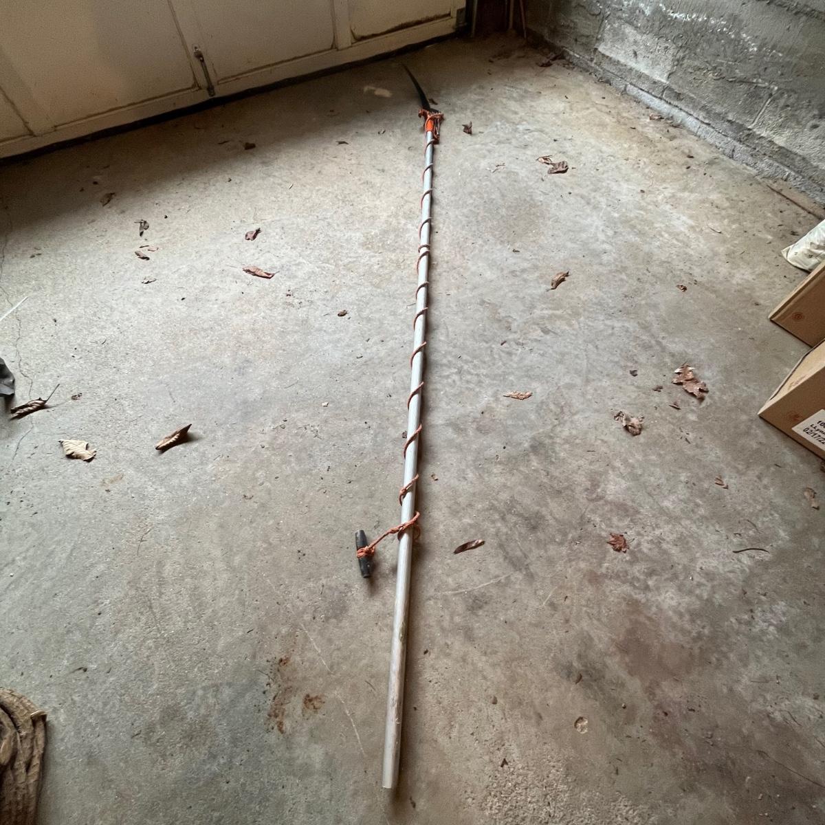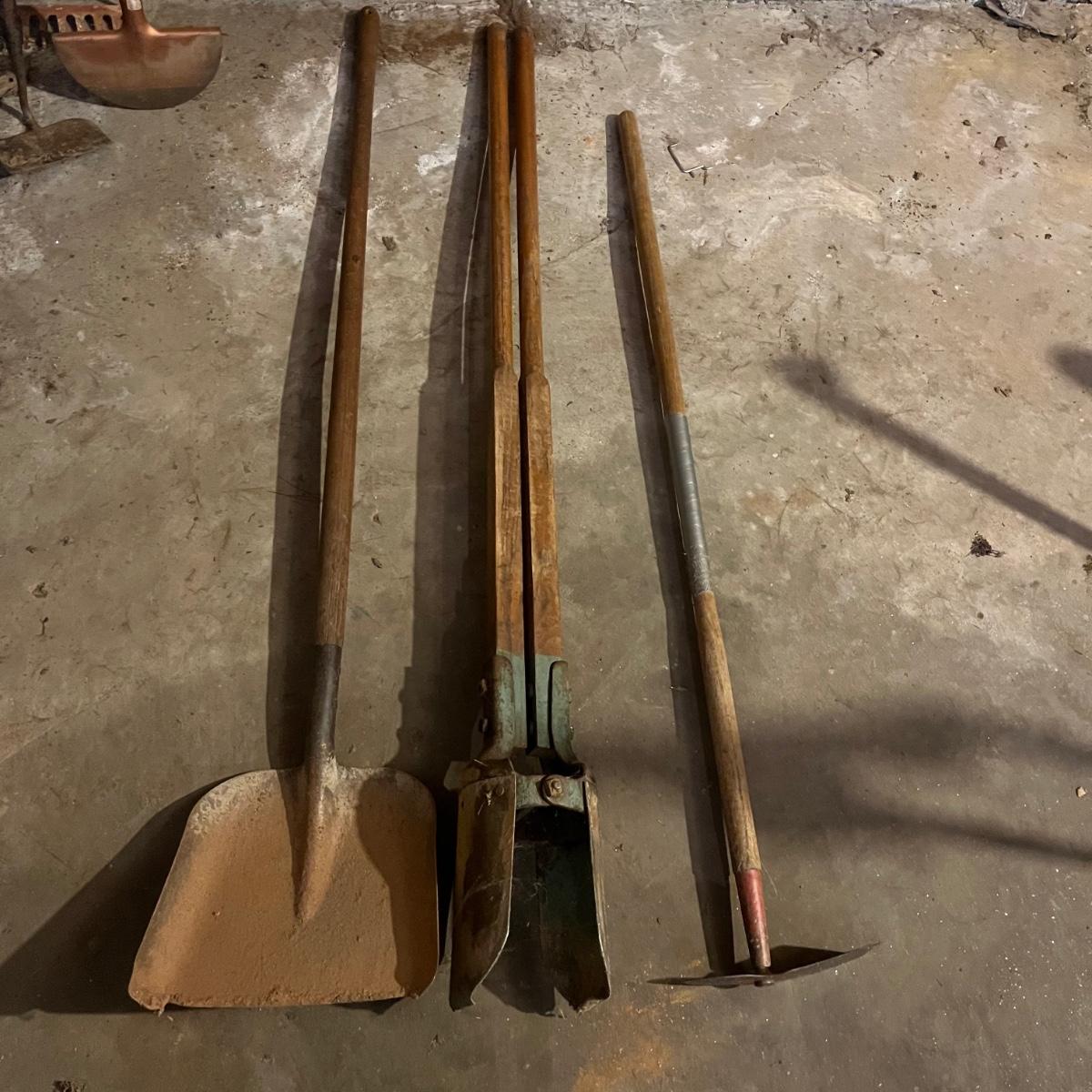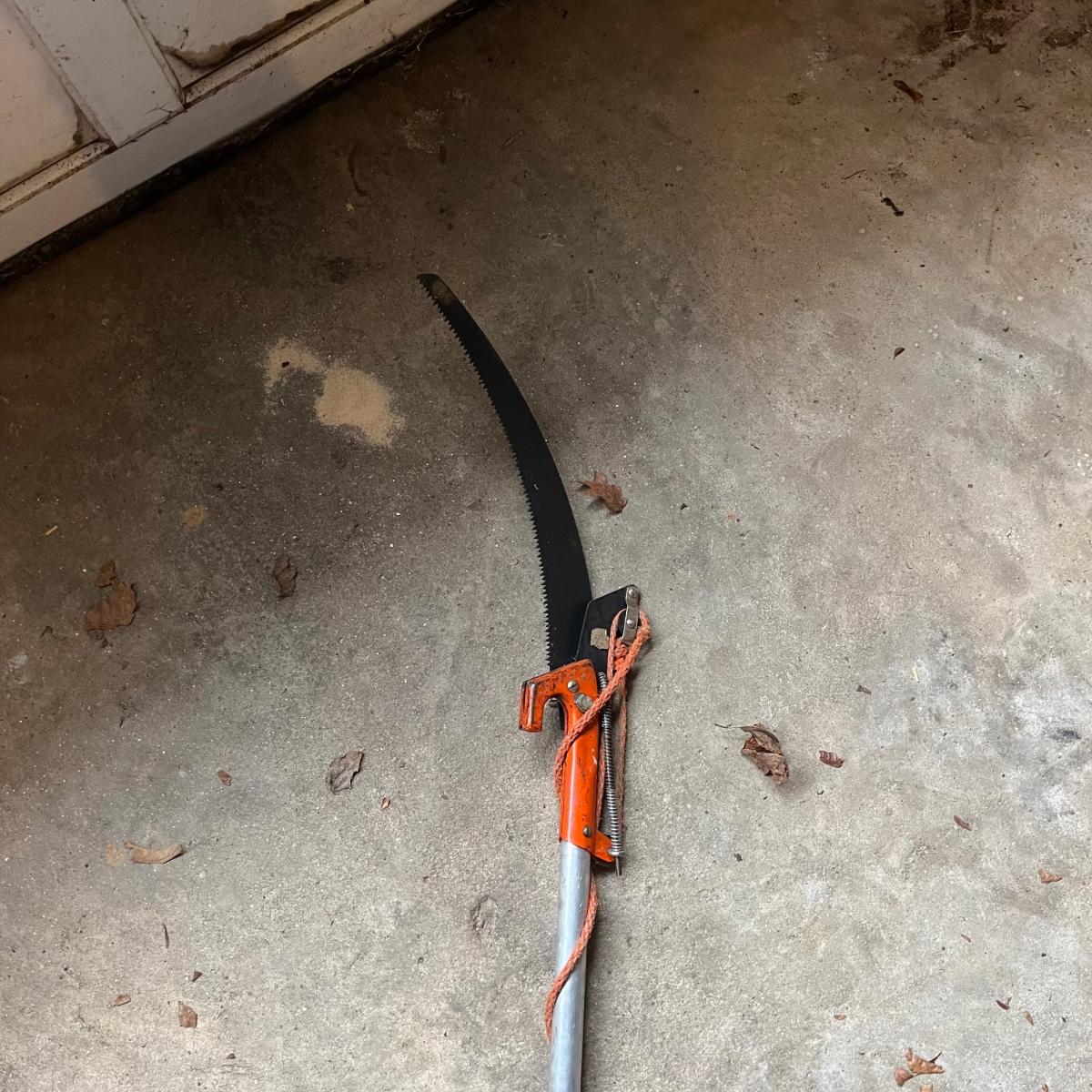 Lot contains an assortment of yard tools including pole saw, wire stretcher, heavy rake, post hole digger, scythe, hoe, shovel, and more. Pole saw measures 102” long.