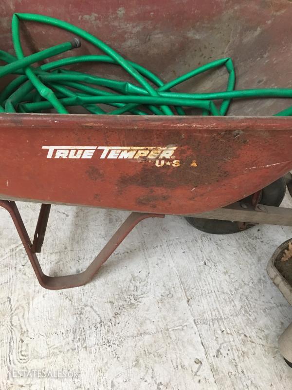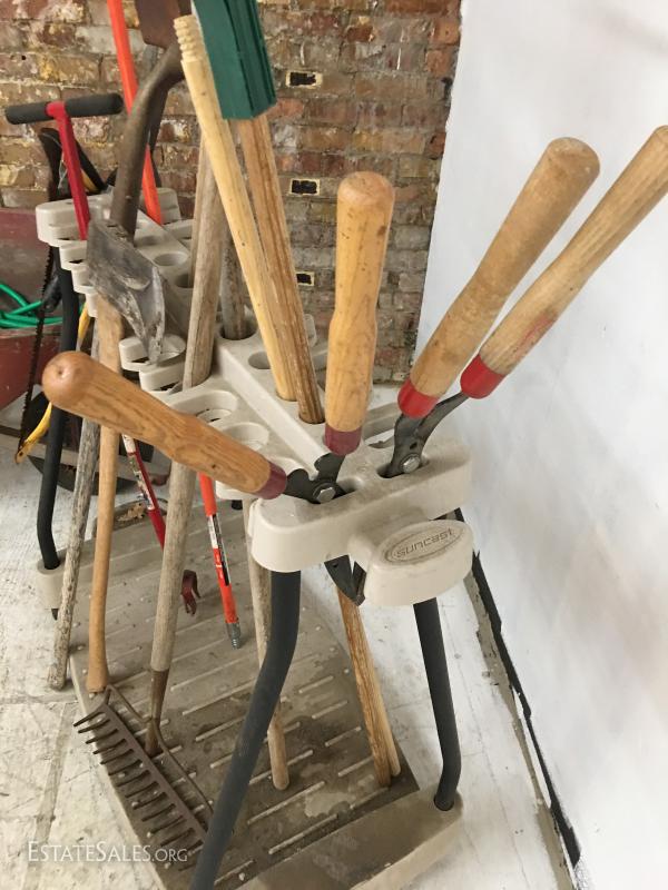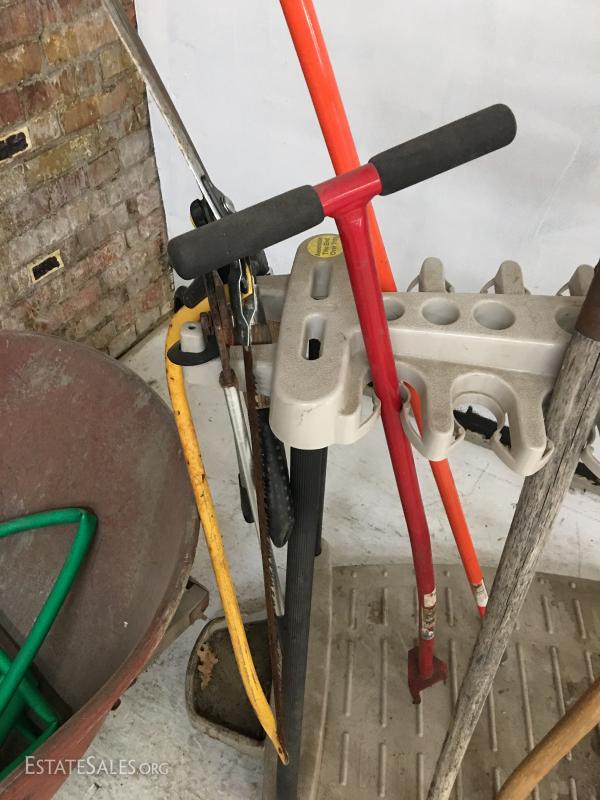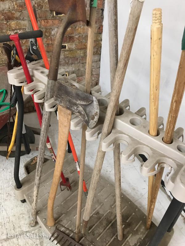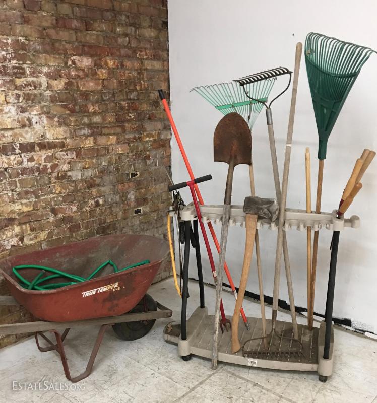 Yard Tools, Hose, Wheelbarrow, Tool Rack, Axe, Shovel...