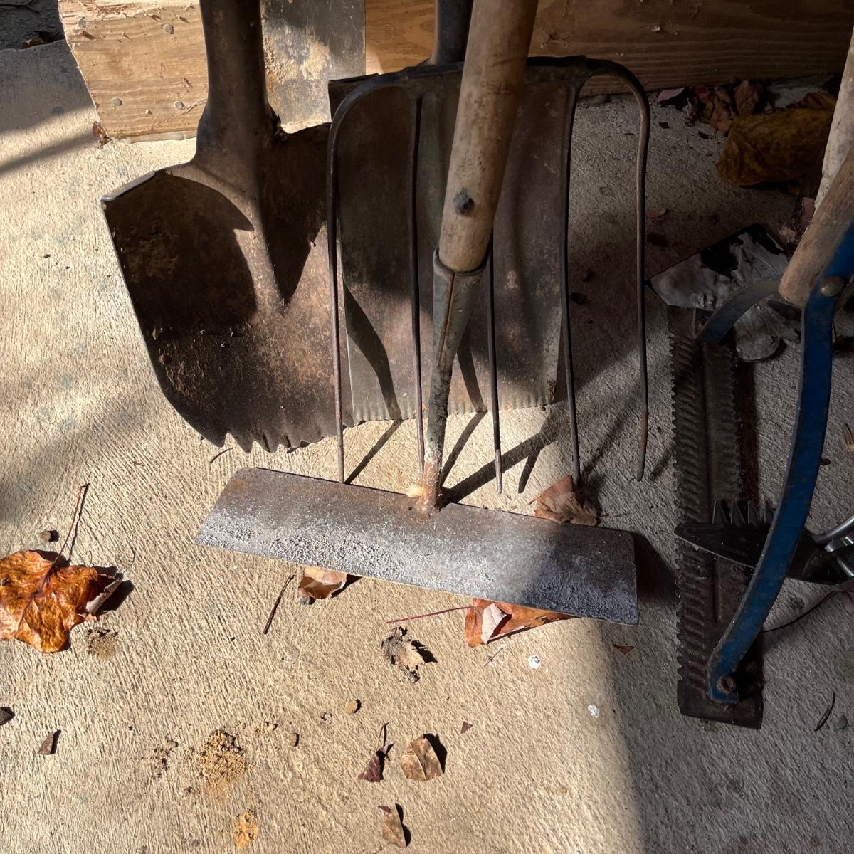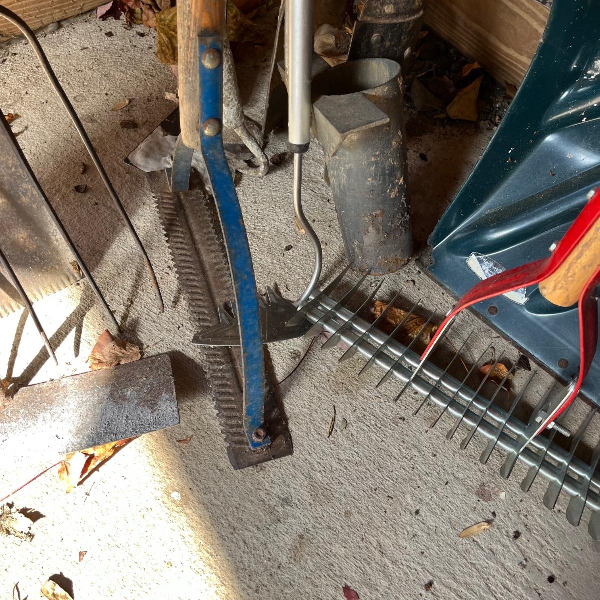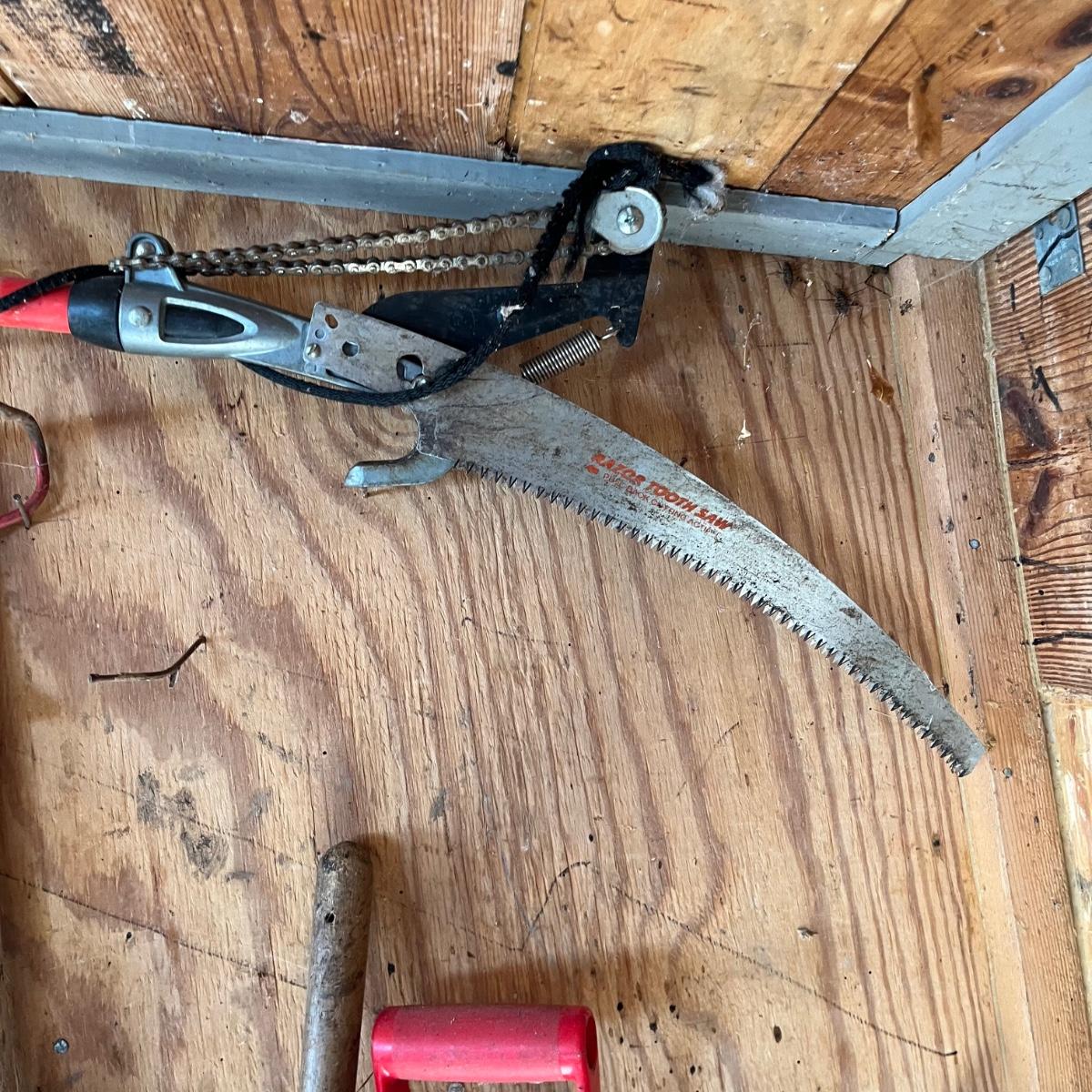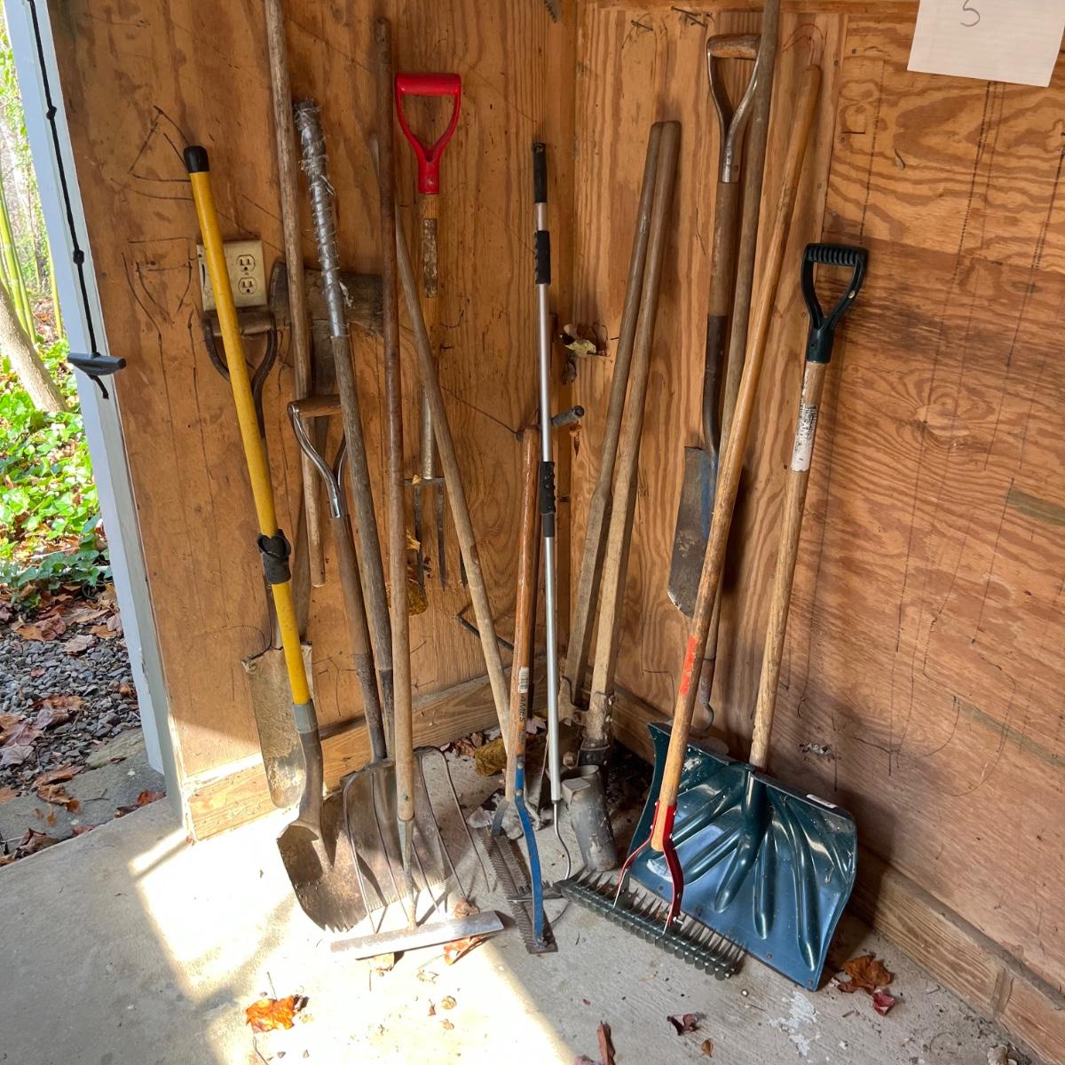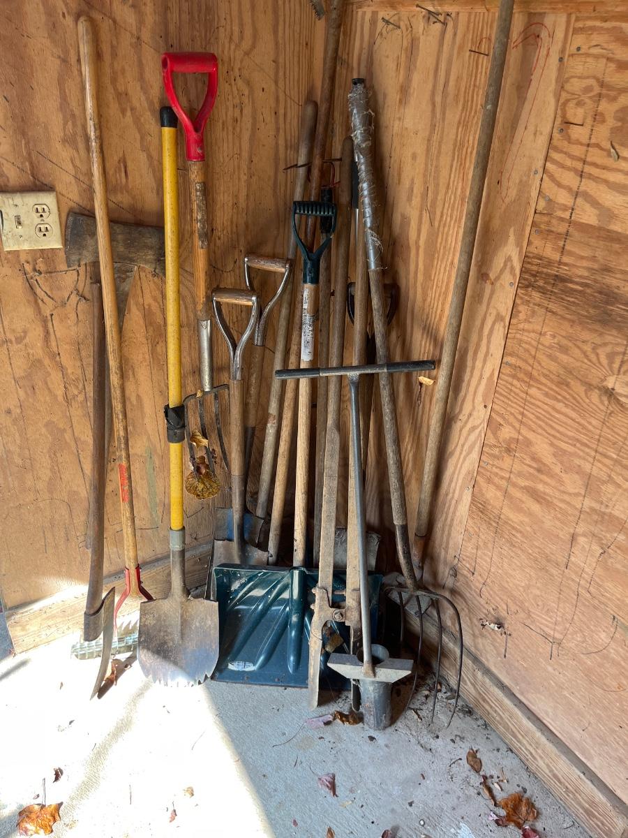 Lot includes plastic snow shovel, Razor Tooth Saw pole saw, potato fork, shovel, post hole digger, ax, pitchfork, hoe, and more.
