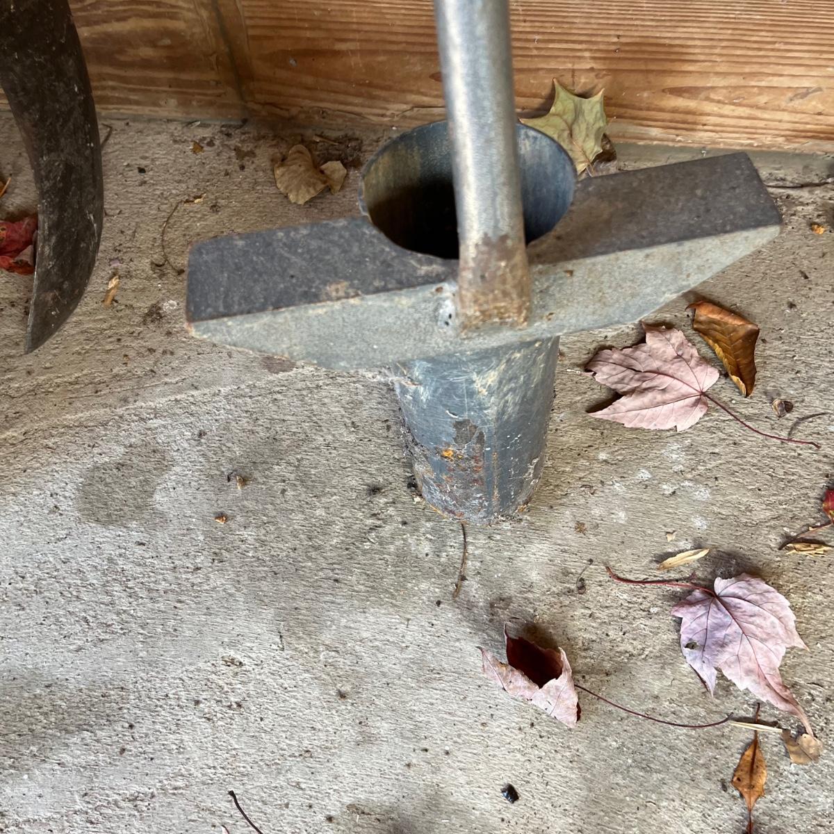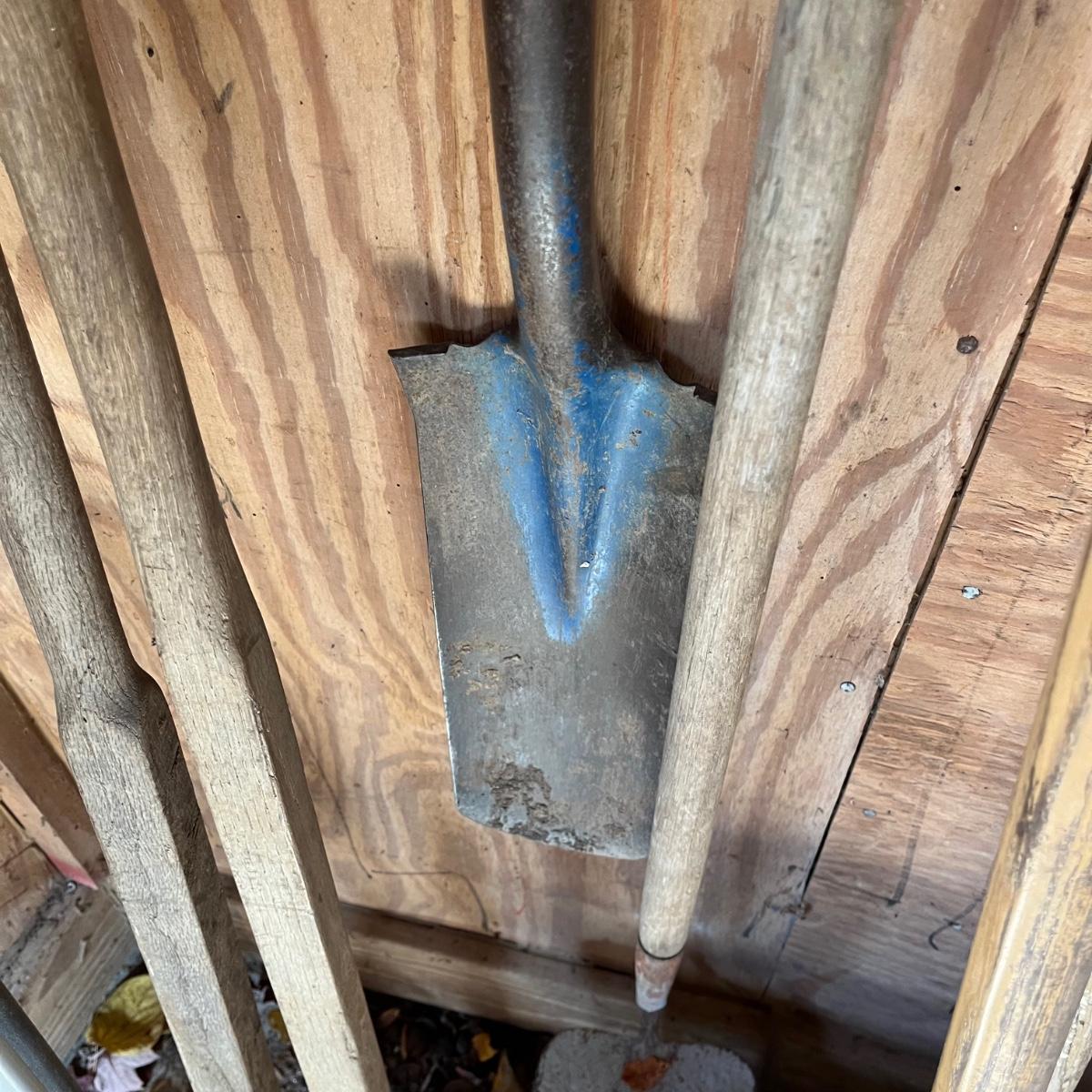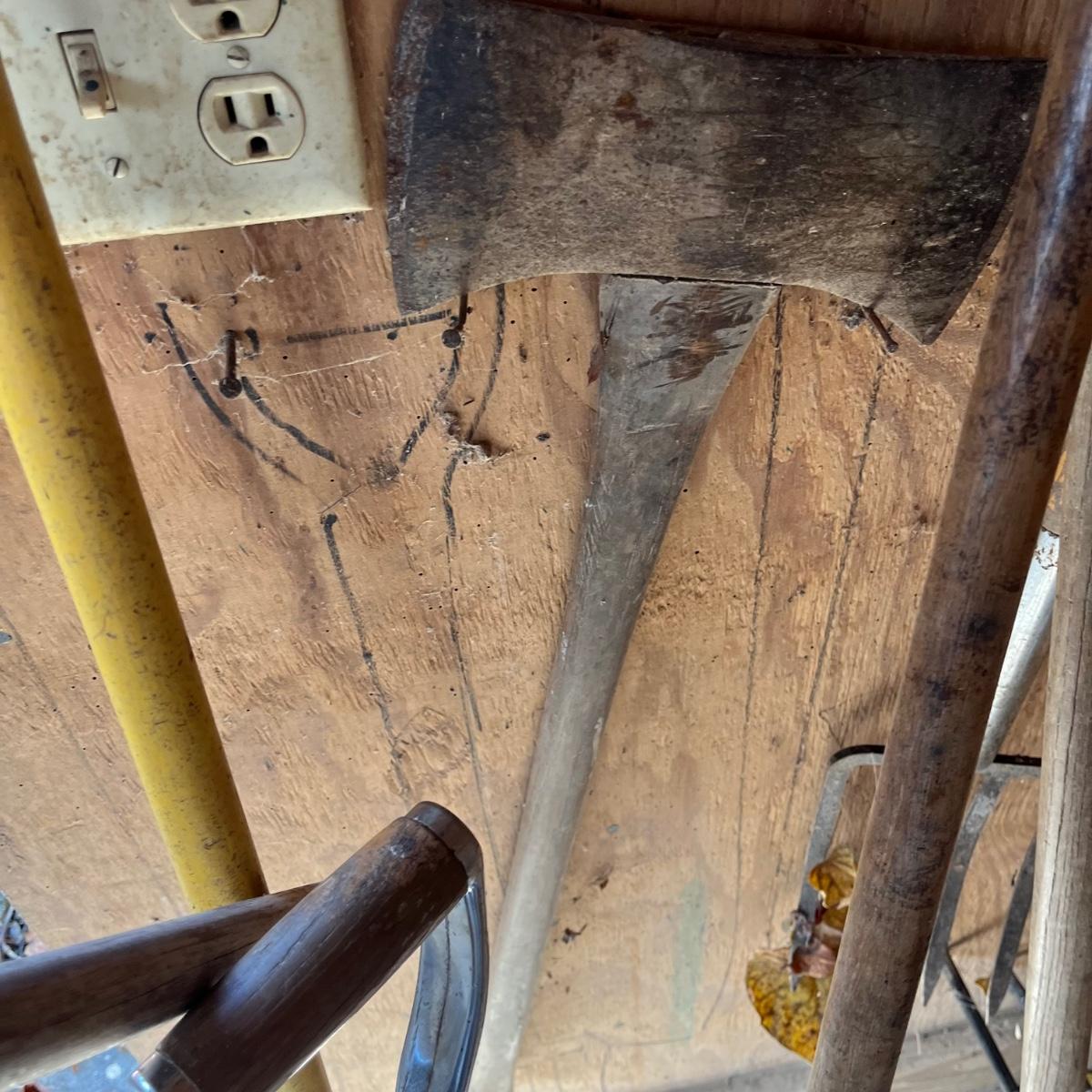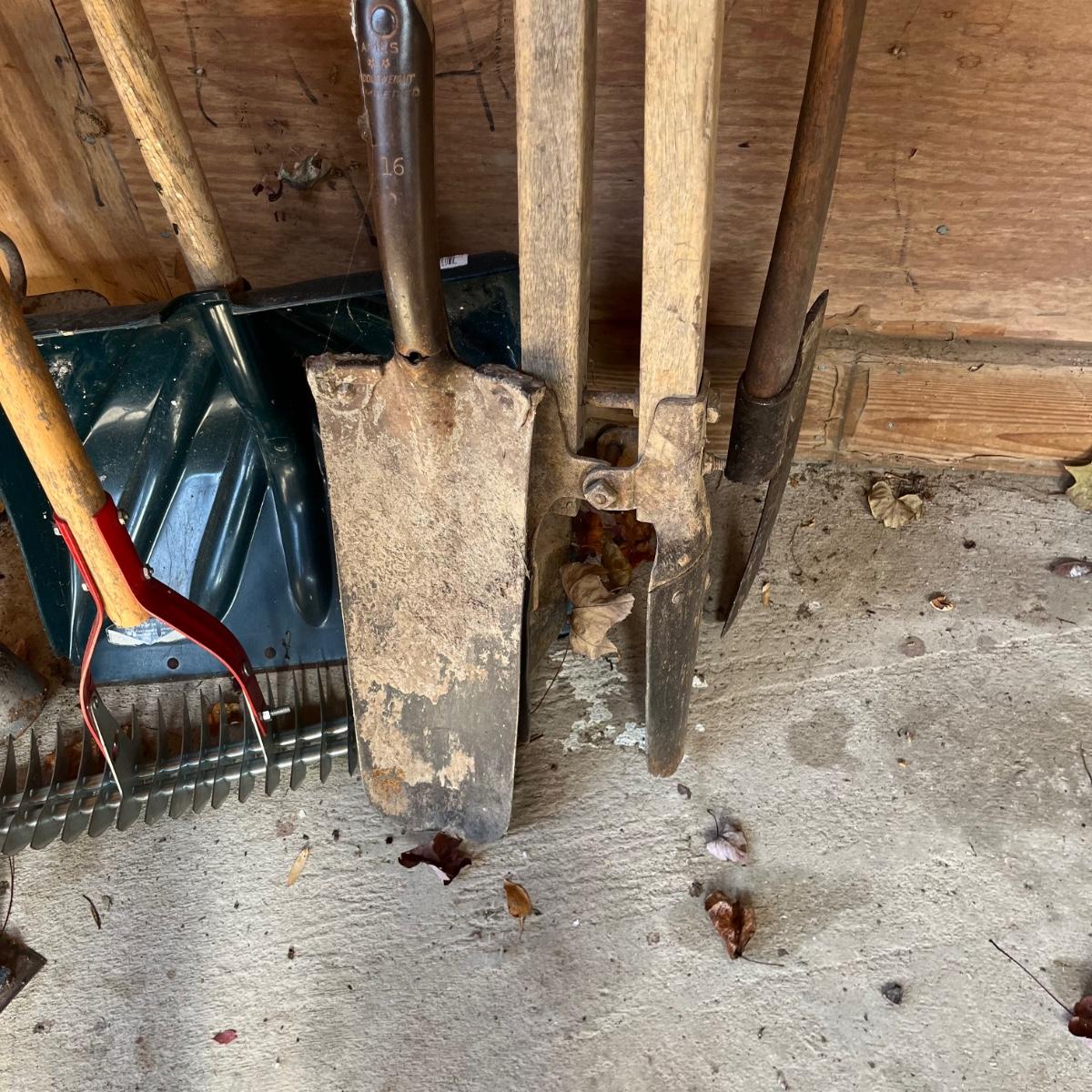 Lot includes plastic snow shovel, Razor Tooth Saw pole saw, potato fork, shovel, post hole digger, ax, pitchfork, hoe, and more.