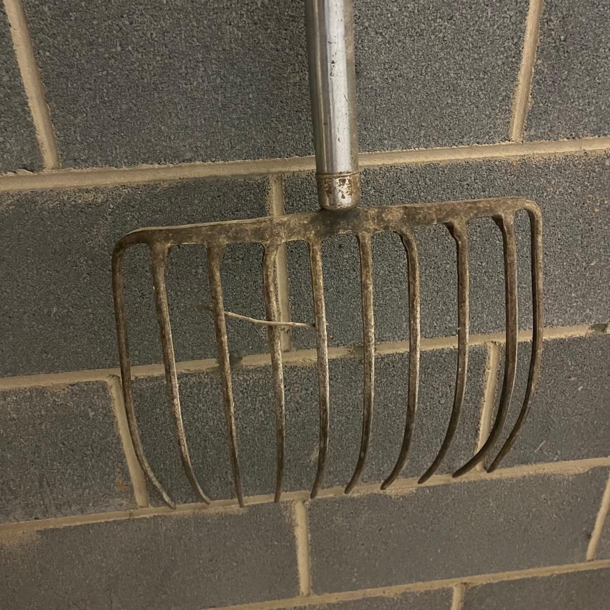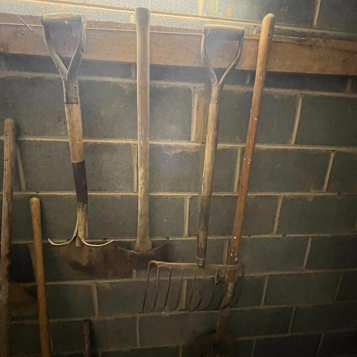 Lot includes grain shovel, pitchforks, heavy rake, hoe, post hole digger, flat shovel, snow shovel and more.