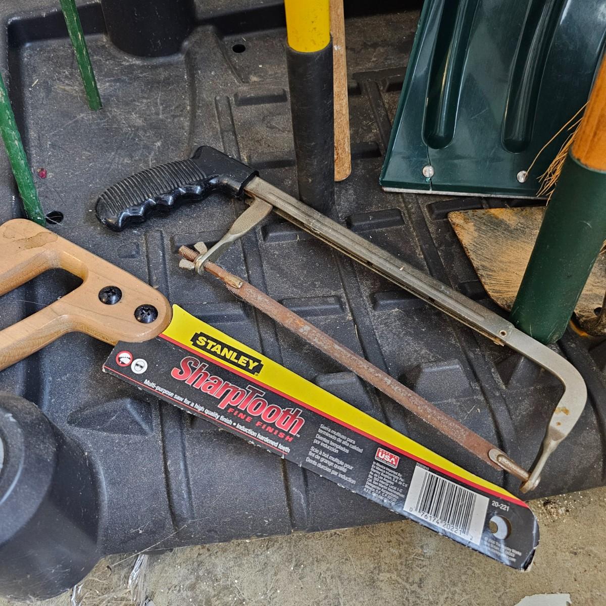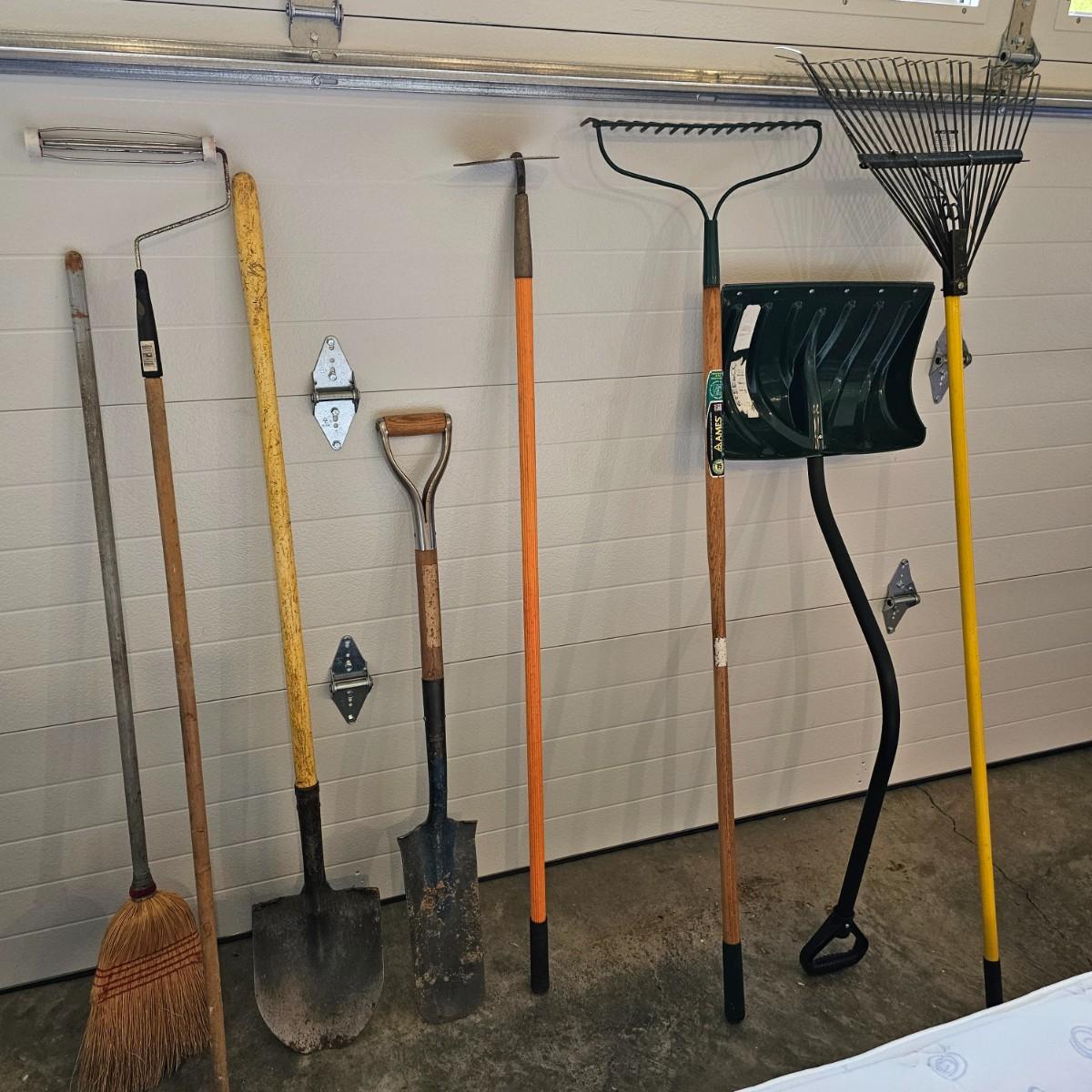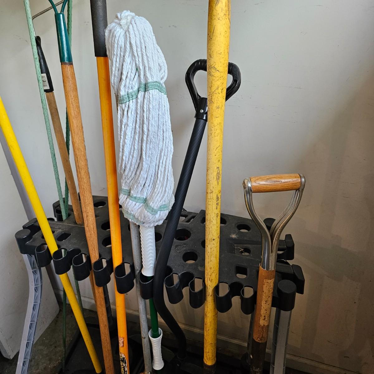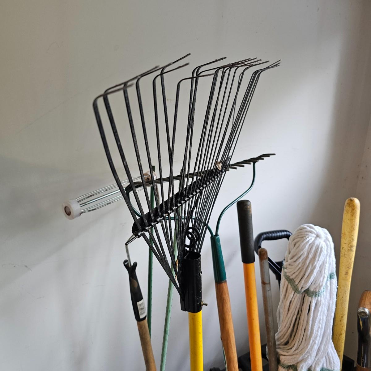 Black and grey plastic tool stand with casters, and assorted yard tools. Stand measures 37" x 21" x 34"H. Tools include shovels, rakes, broom, paint roller, hand saws. Largest leaf rake is 68" long. See photos for details. Local pickup only.