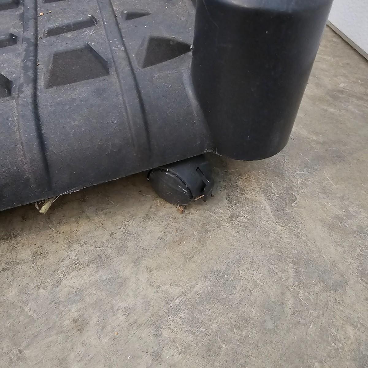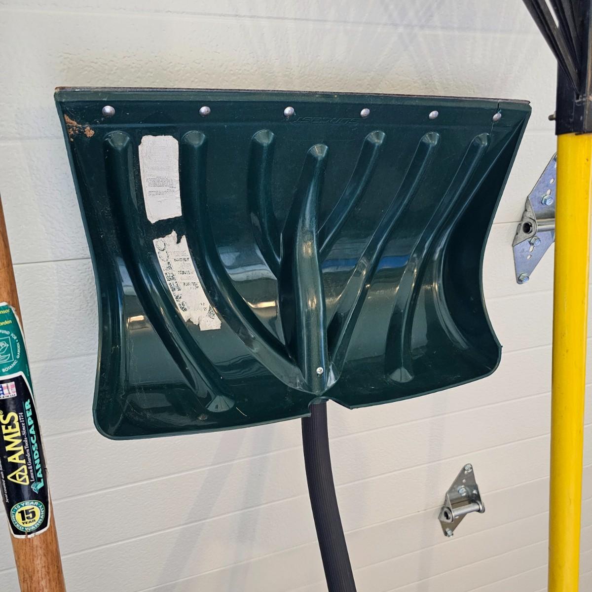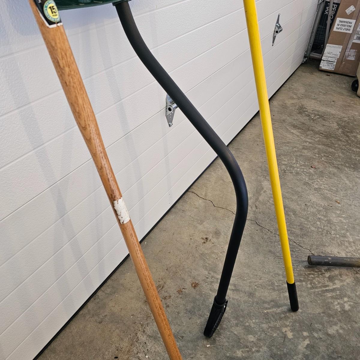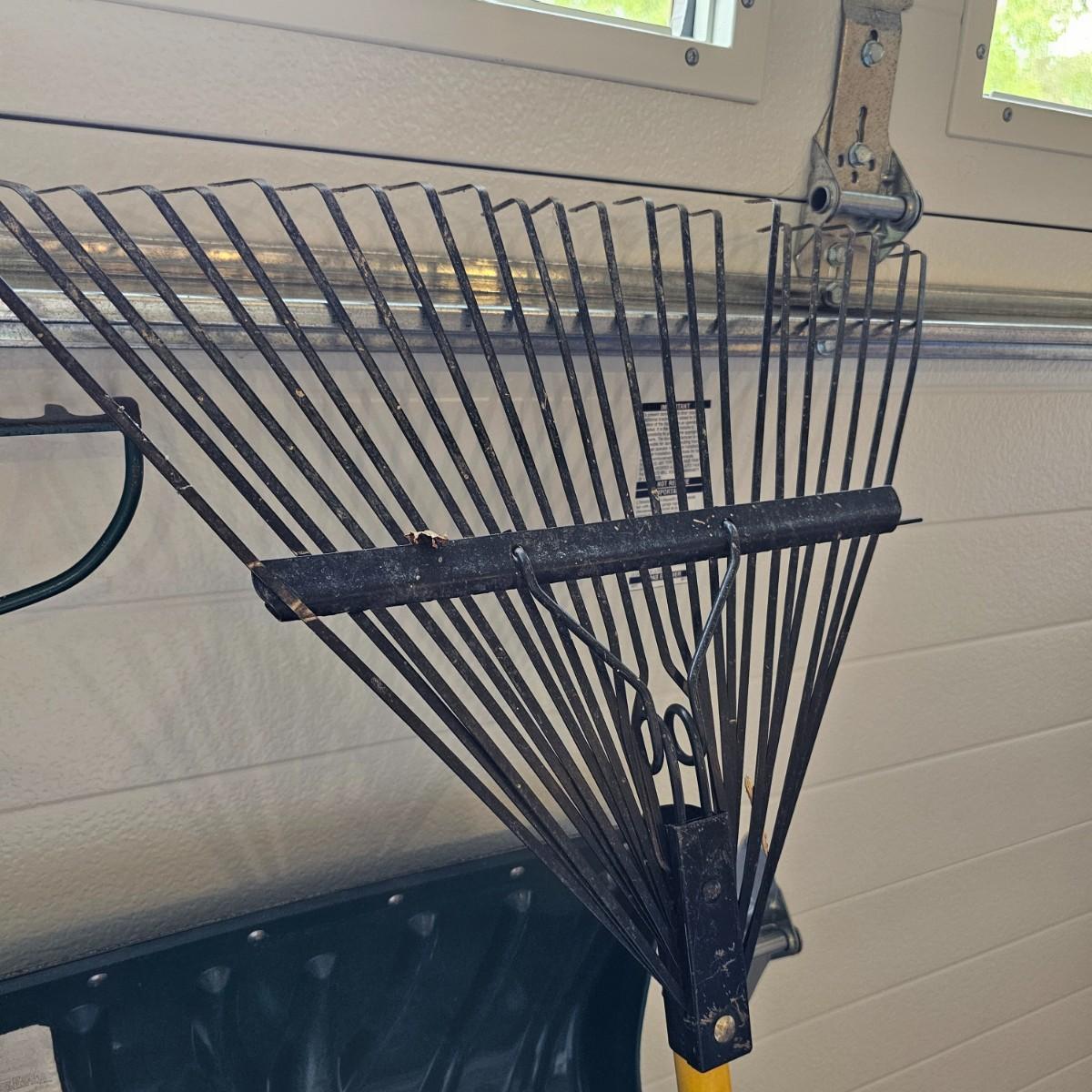 Black and grey plastic tool stand with casters, and assorted yard tools. Stand measures 37" x 21" x 34"H. Tools include shovels, rakes, broom, paint roller, hand saws. Largest leaf rake is 68" long. See photos for details. Local pickup only.