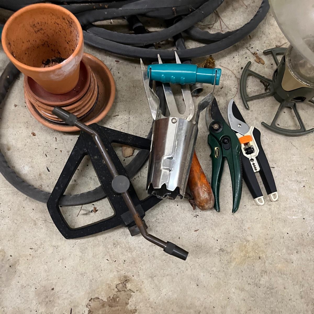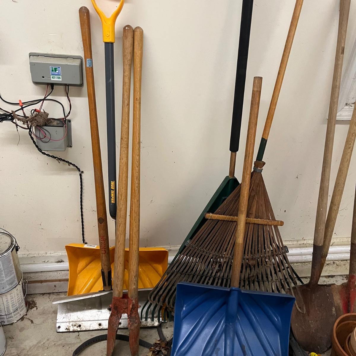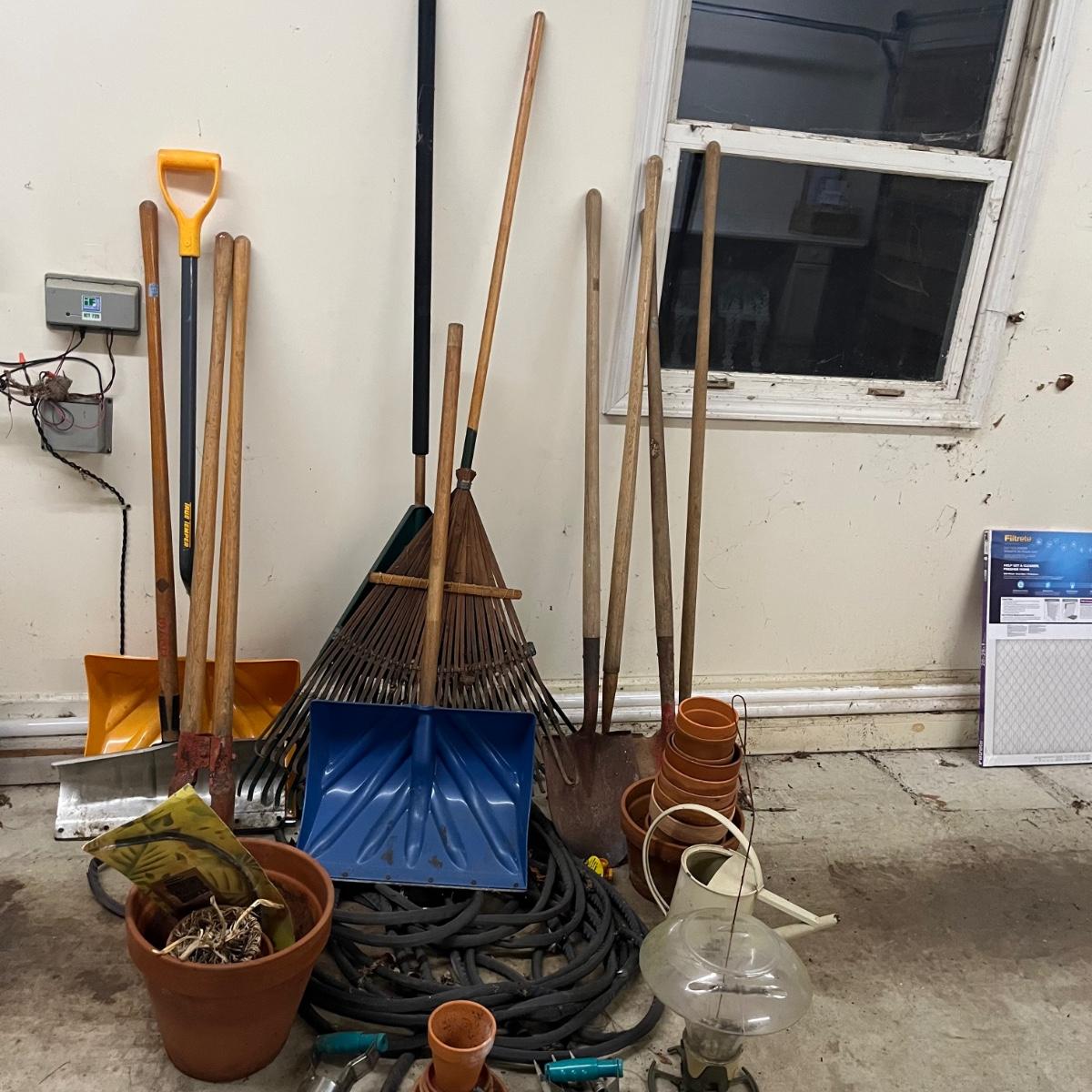Lot includes snow shovels, shovels, heavy rake, leaf rakes, hose, loppers, hedge trimmers, bird feeder, terra cotta pots and more.