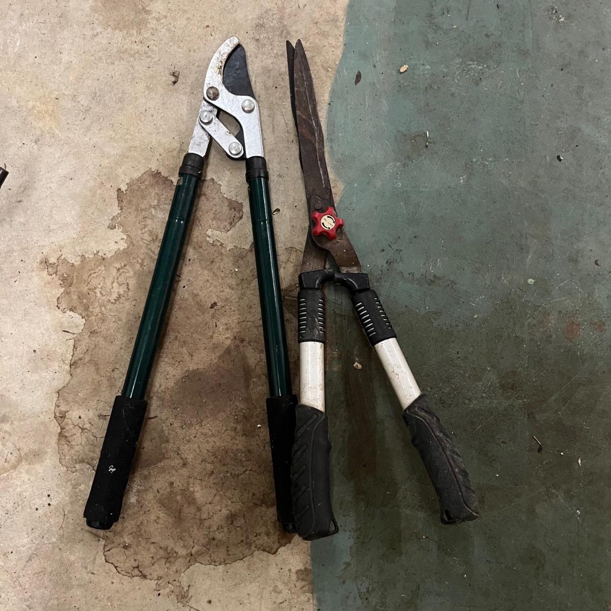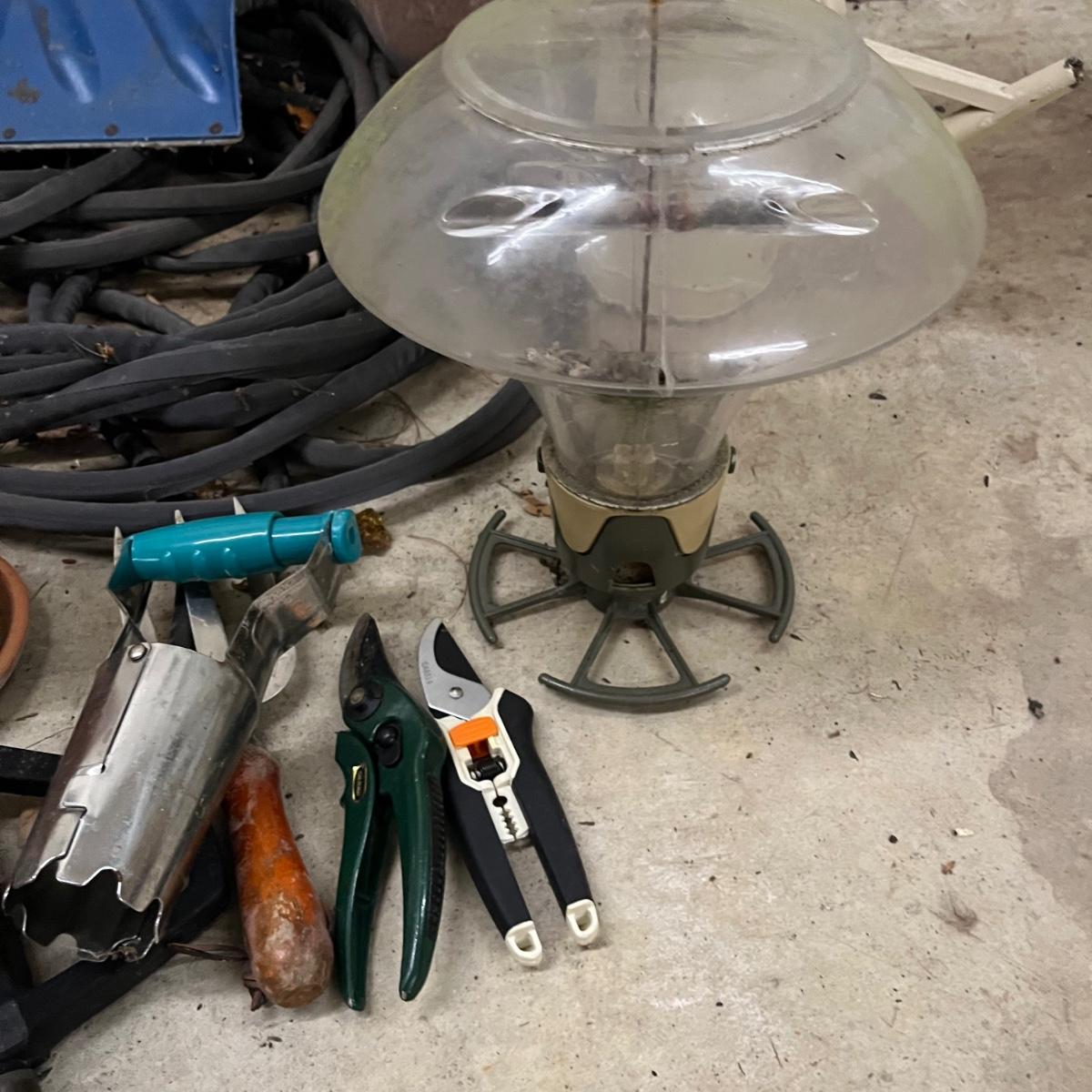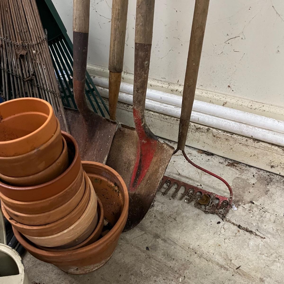 Lot includes snow shovels, shovels, heavy rake, leaf rakes, hose, loppers, hedge trimmers, bird feeder, terra cotta pots and more.