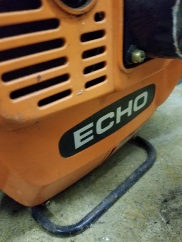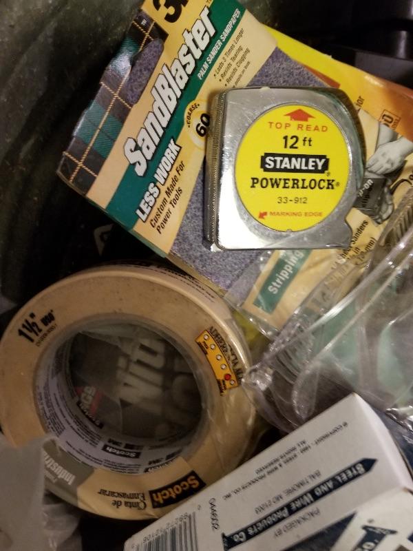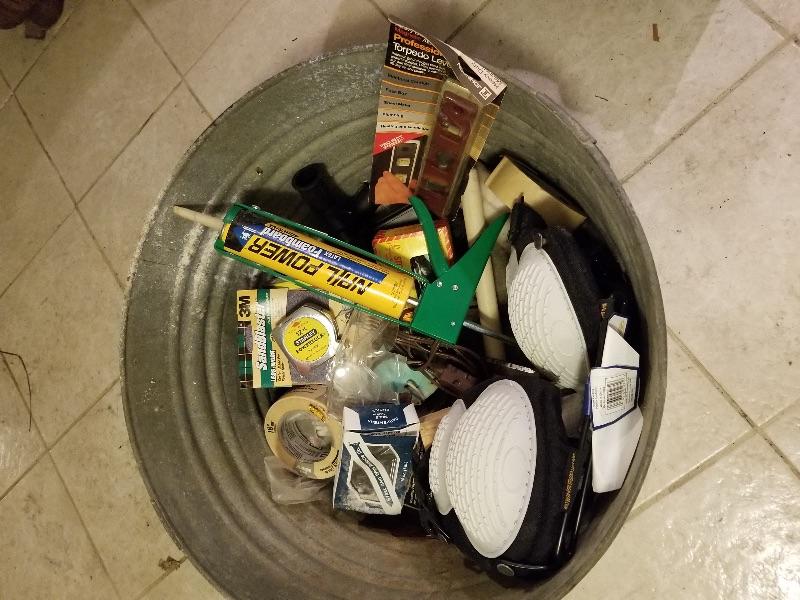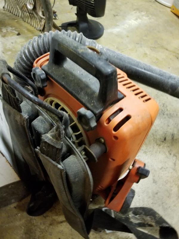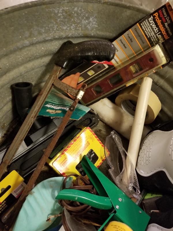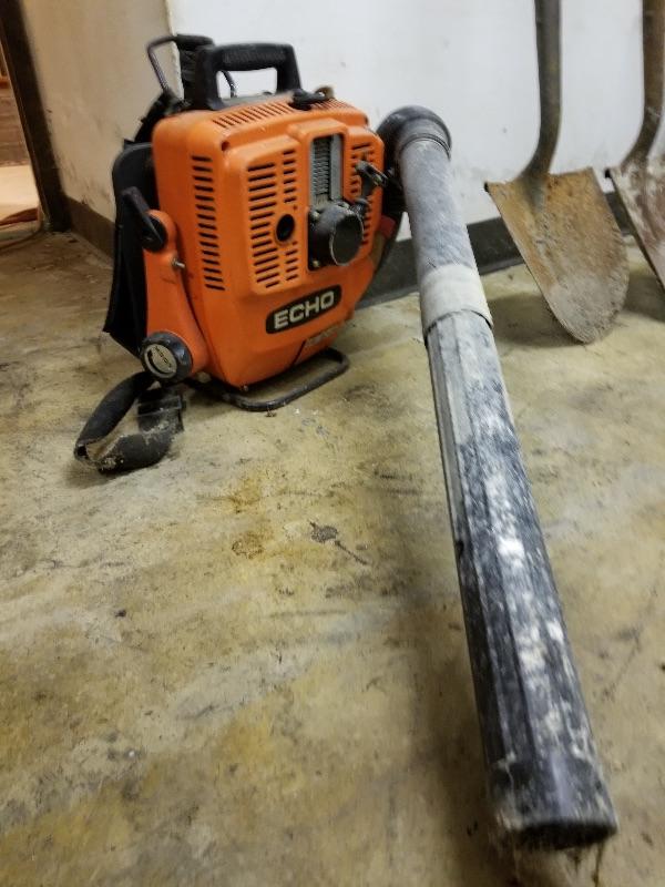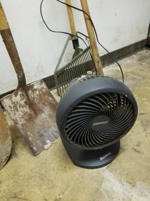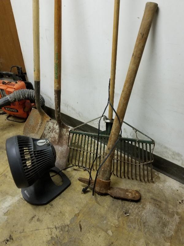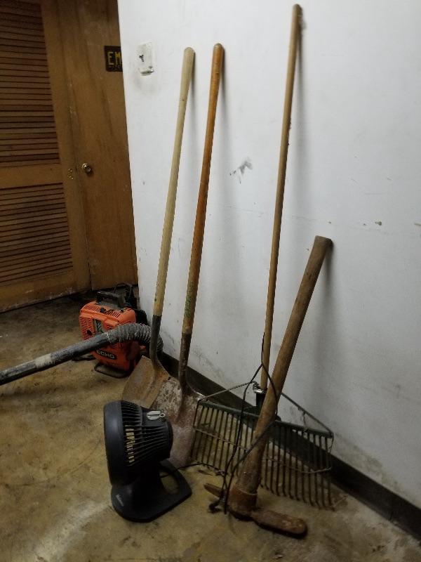 Garden & yard tools, Echo blower, portable fan, metal bin of misc garage items/supplies, etc