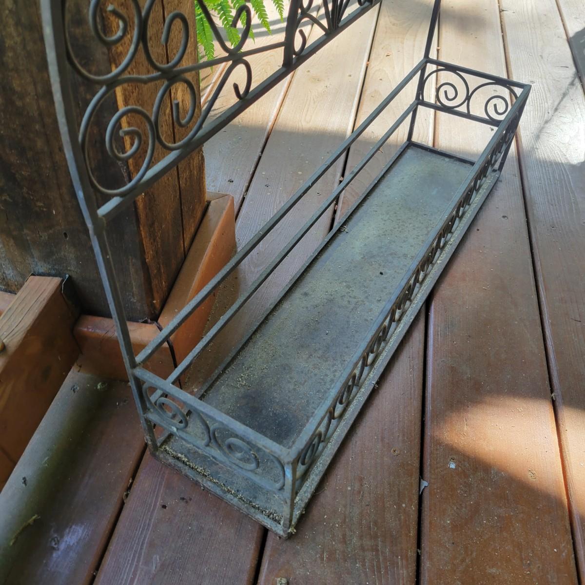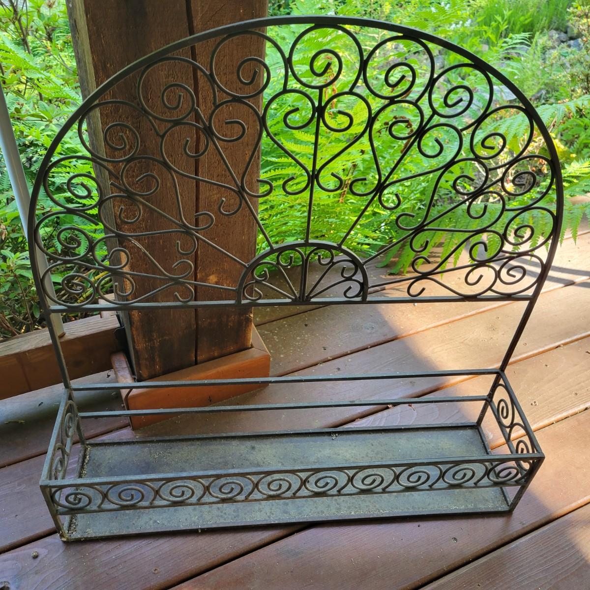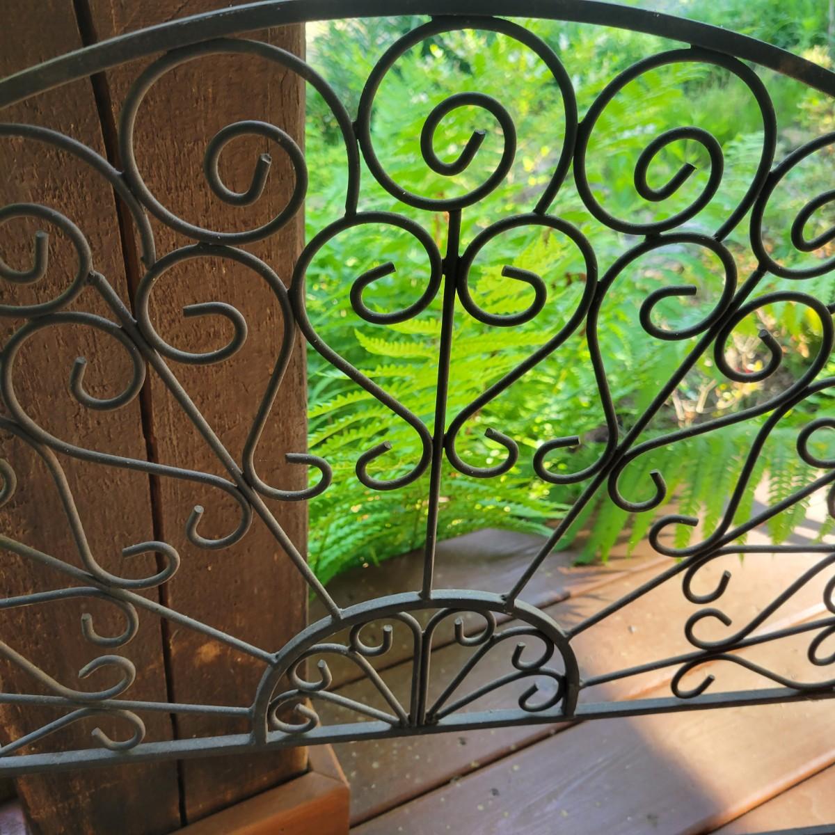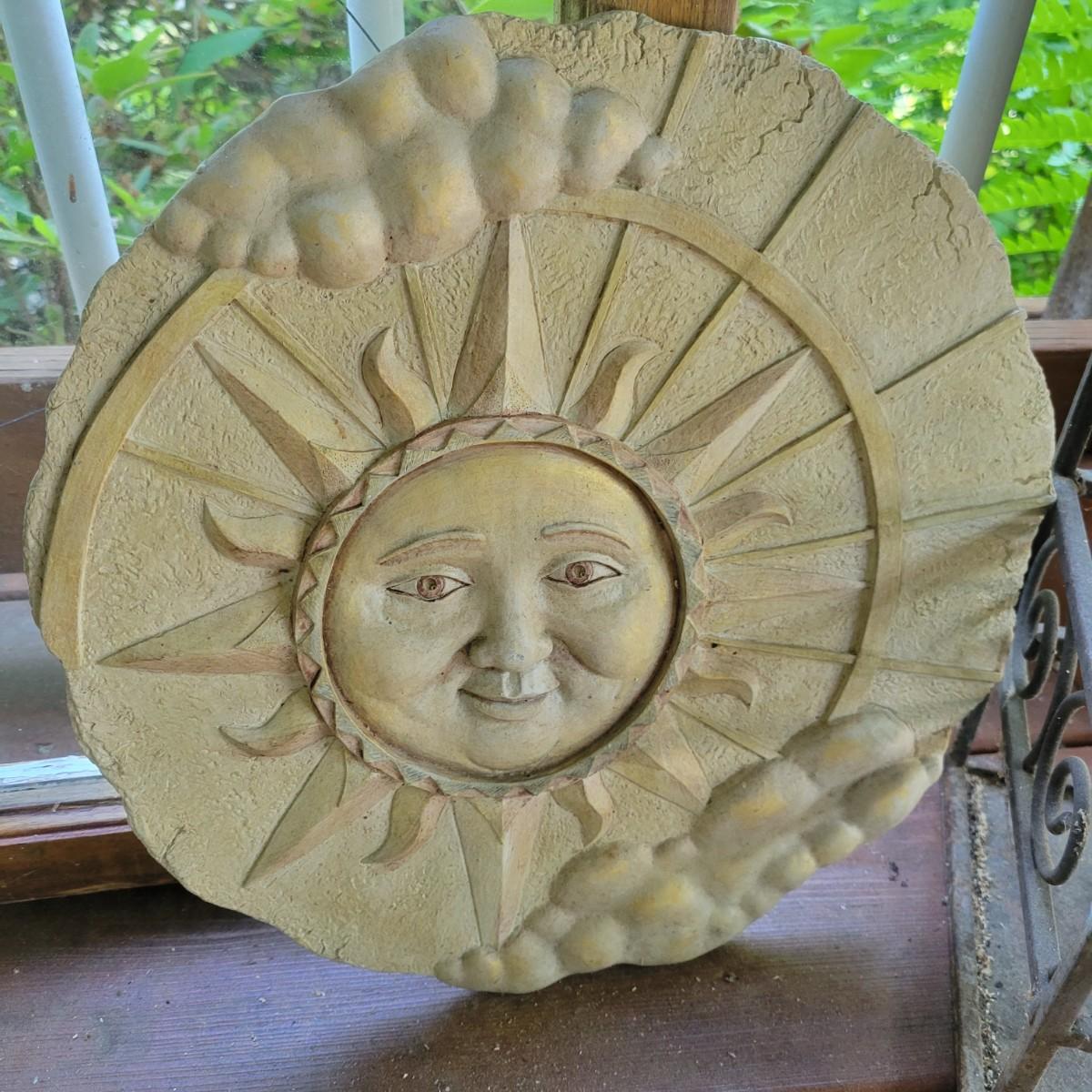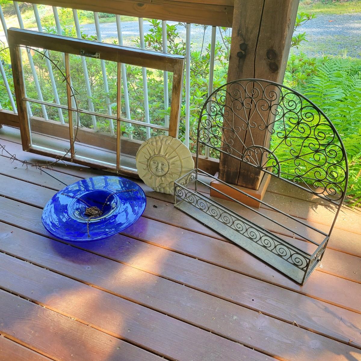 An assortment of items to decorate a deck or patio. Included is an older window pane with hanging hardware that measures approximately 36" x 1.5 x 26"H. A metal wreath form that is 24"D, a blue glass hanging bird feeder, a plaster sun fresco and a decorative metal shelf that measures approximately 27" x 6.5" x 26.5". Local pickup only