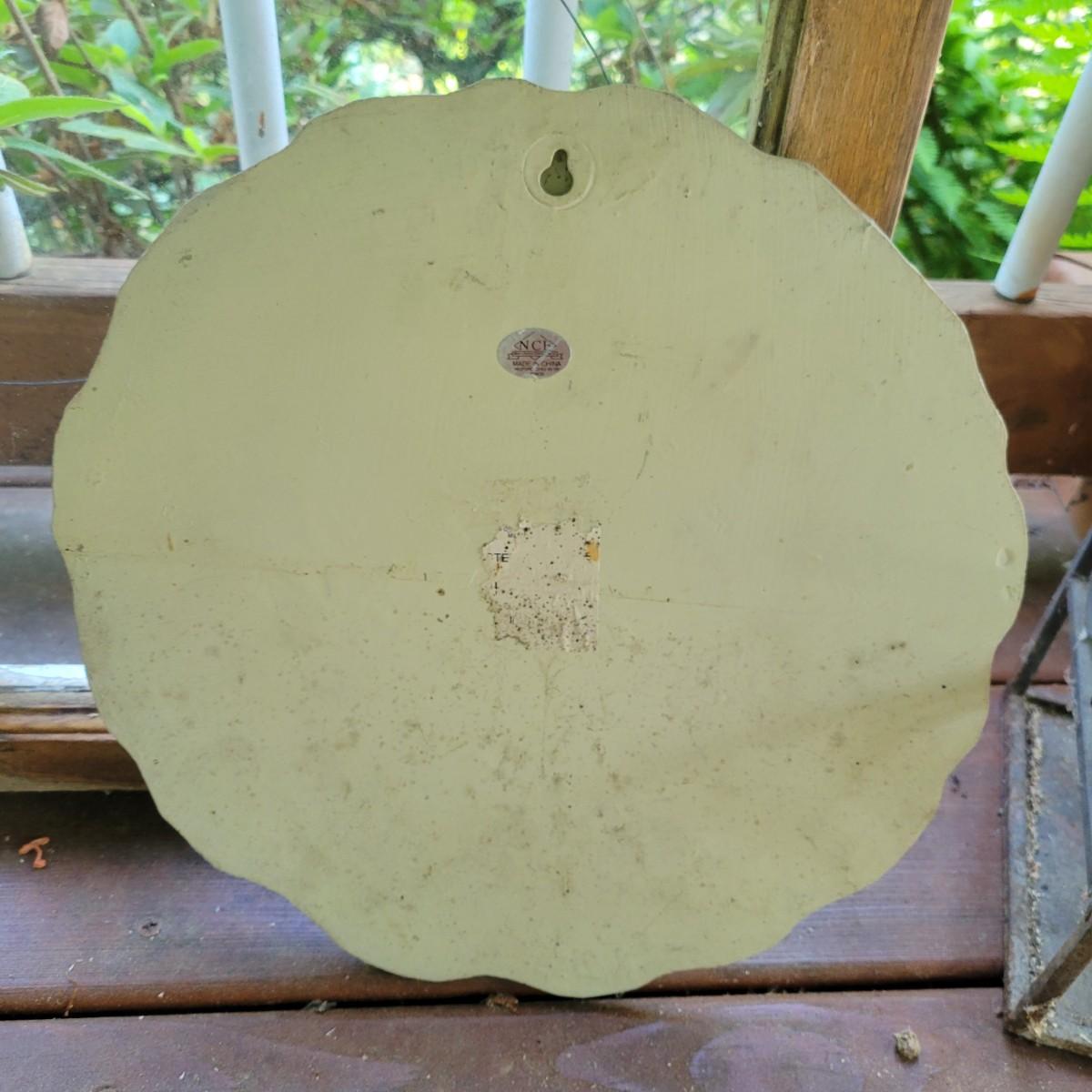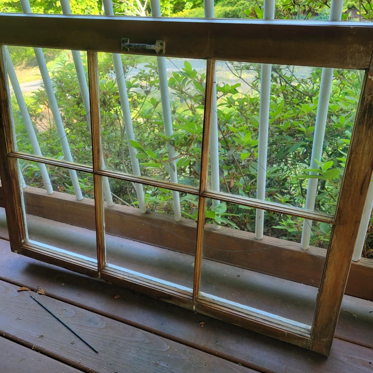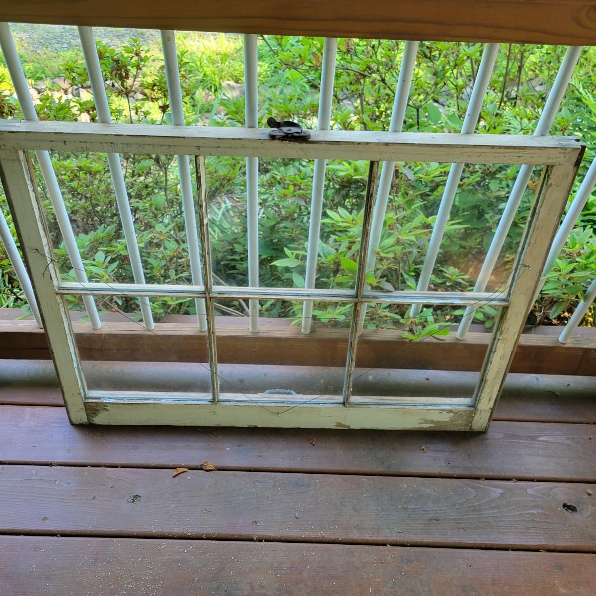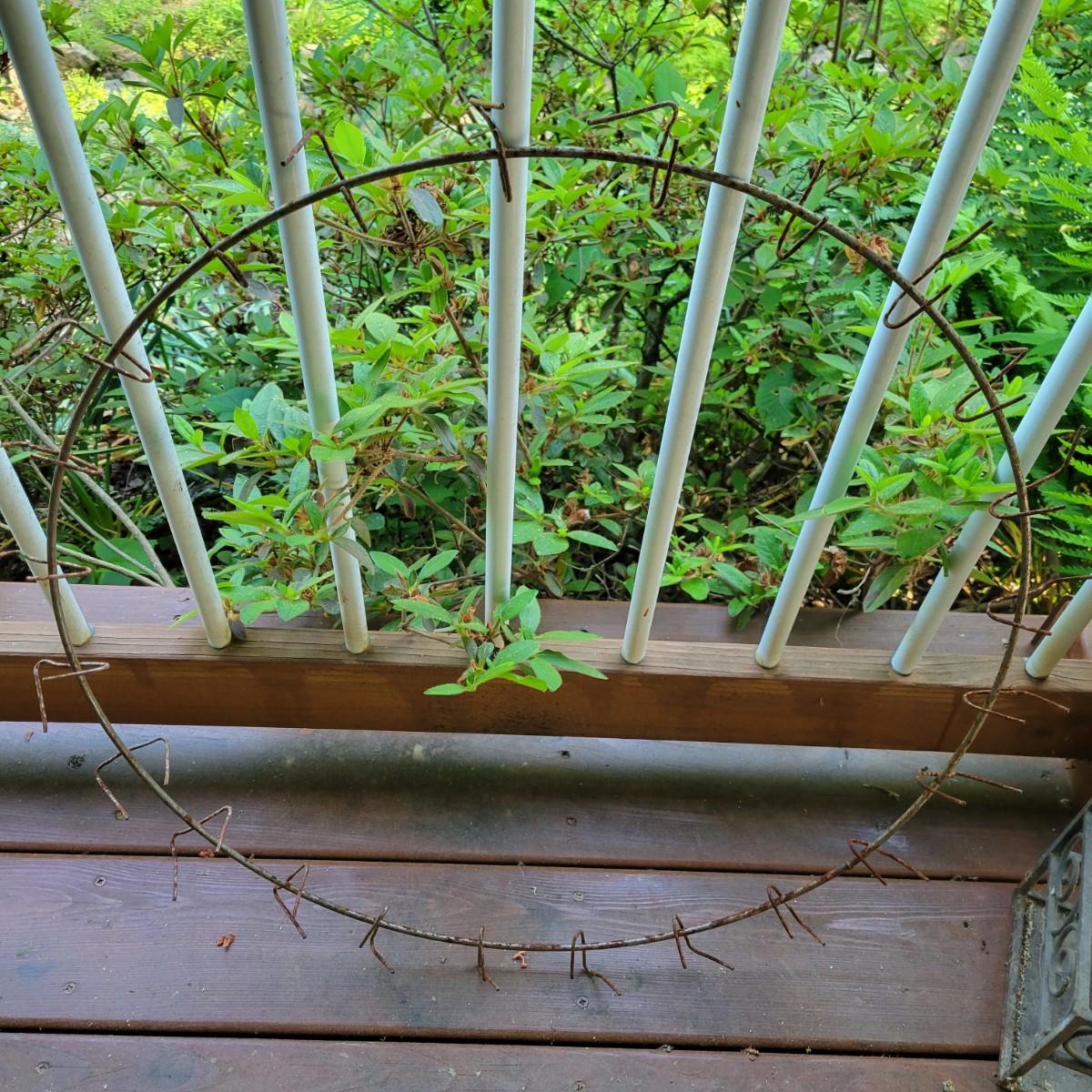 An assortment of items to decorate a deck or patio. Included is an older window pane with hanging hardware that measures approximately 36" x 1.5 x 26"H. A metal wreath form that is 24"D, a blue glass hanging bird feeder, a plaster sun fresco and a decorative metal shelf that measures approximately 27" x 6.5" x 26.5". Local pickup only