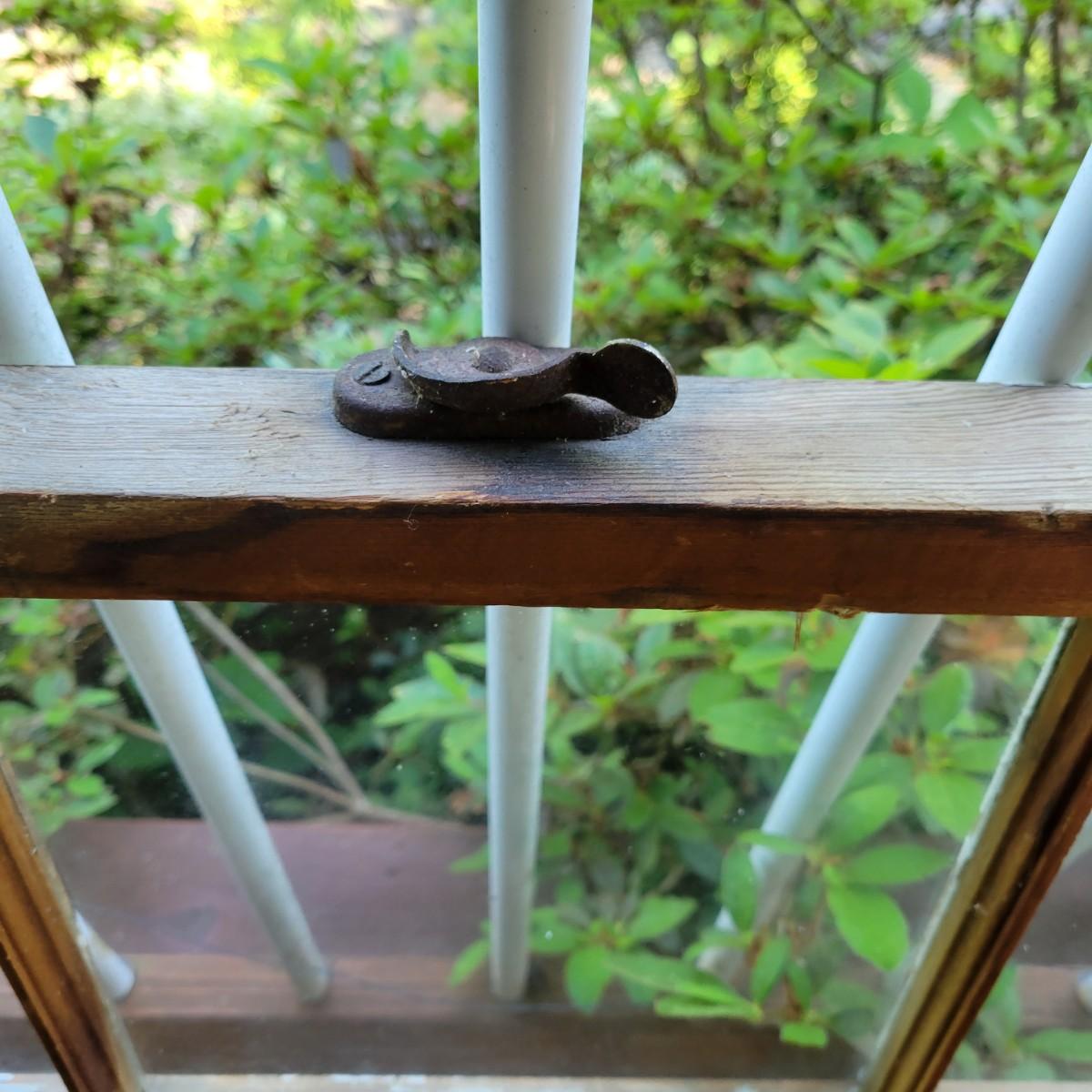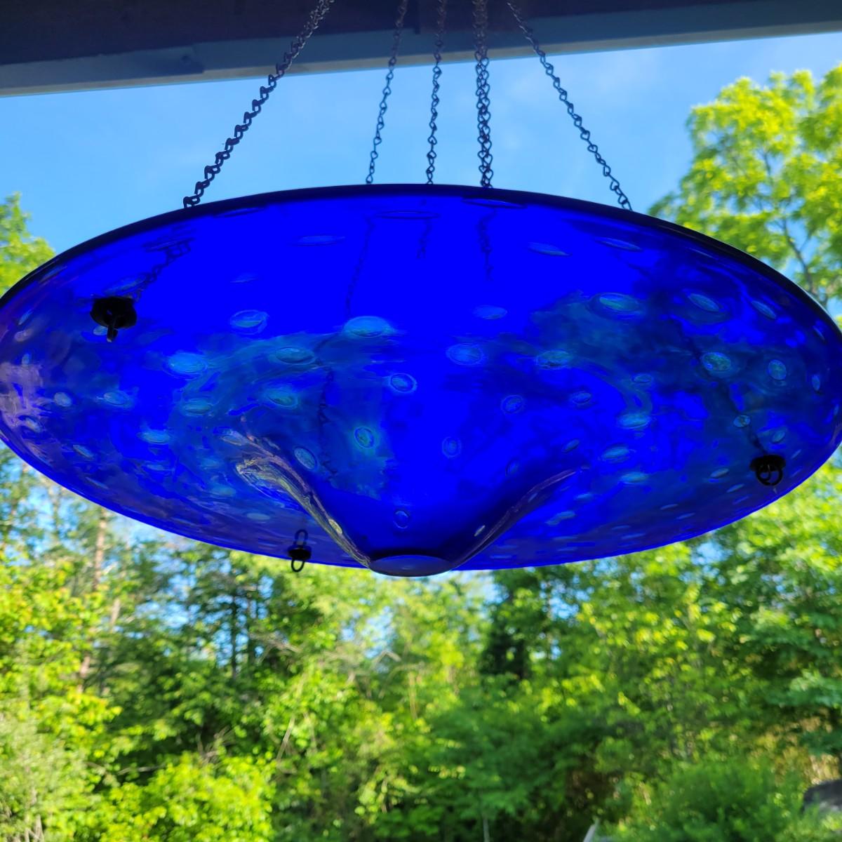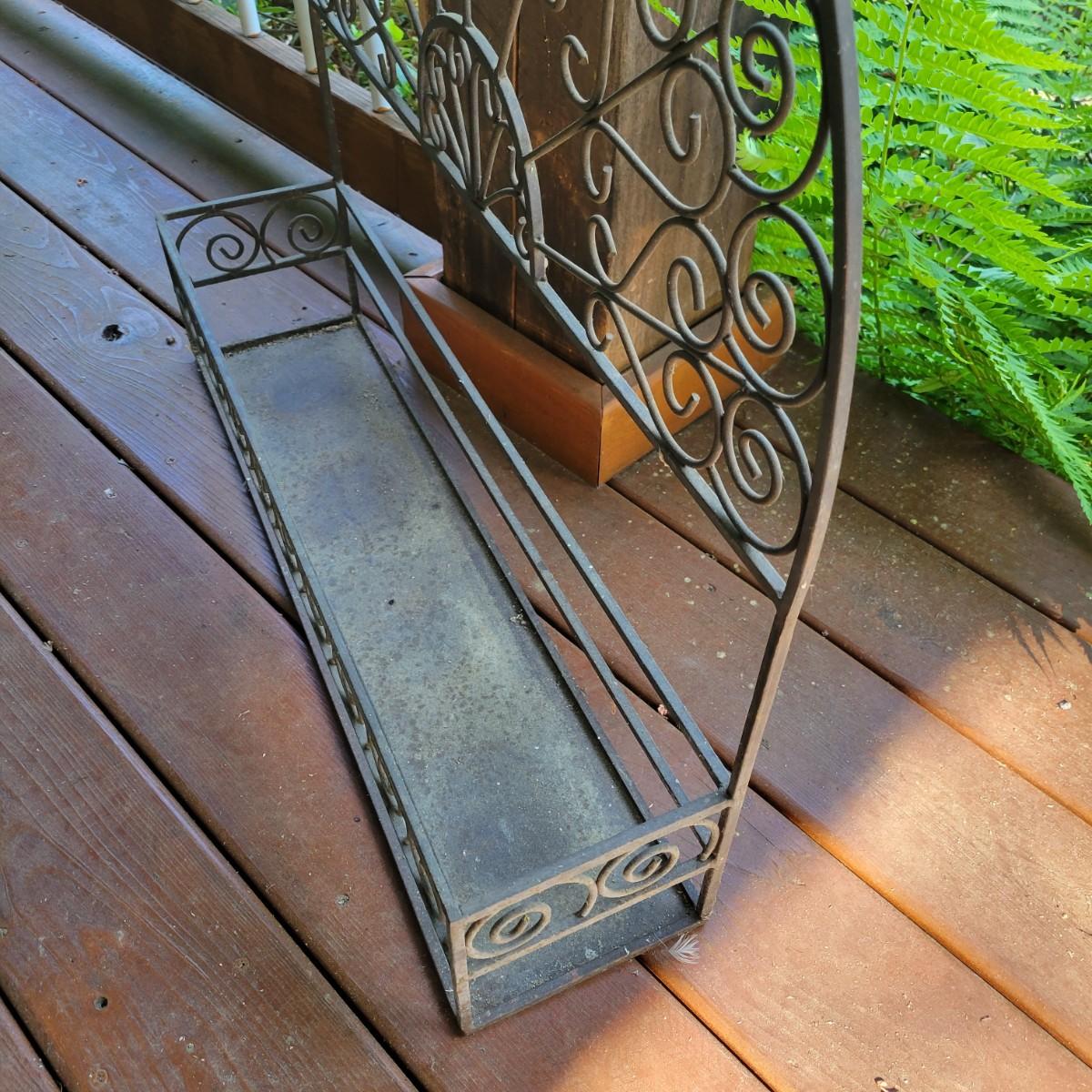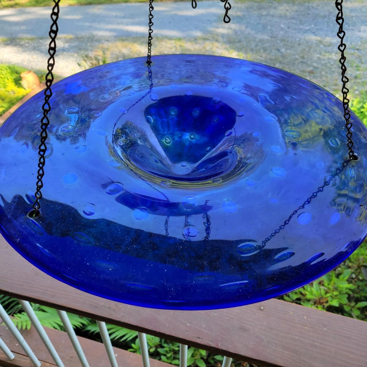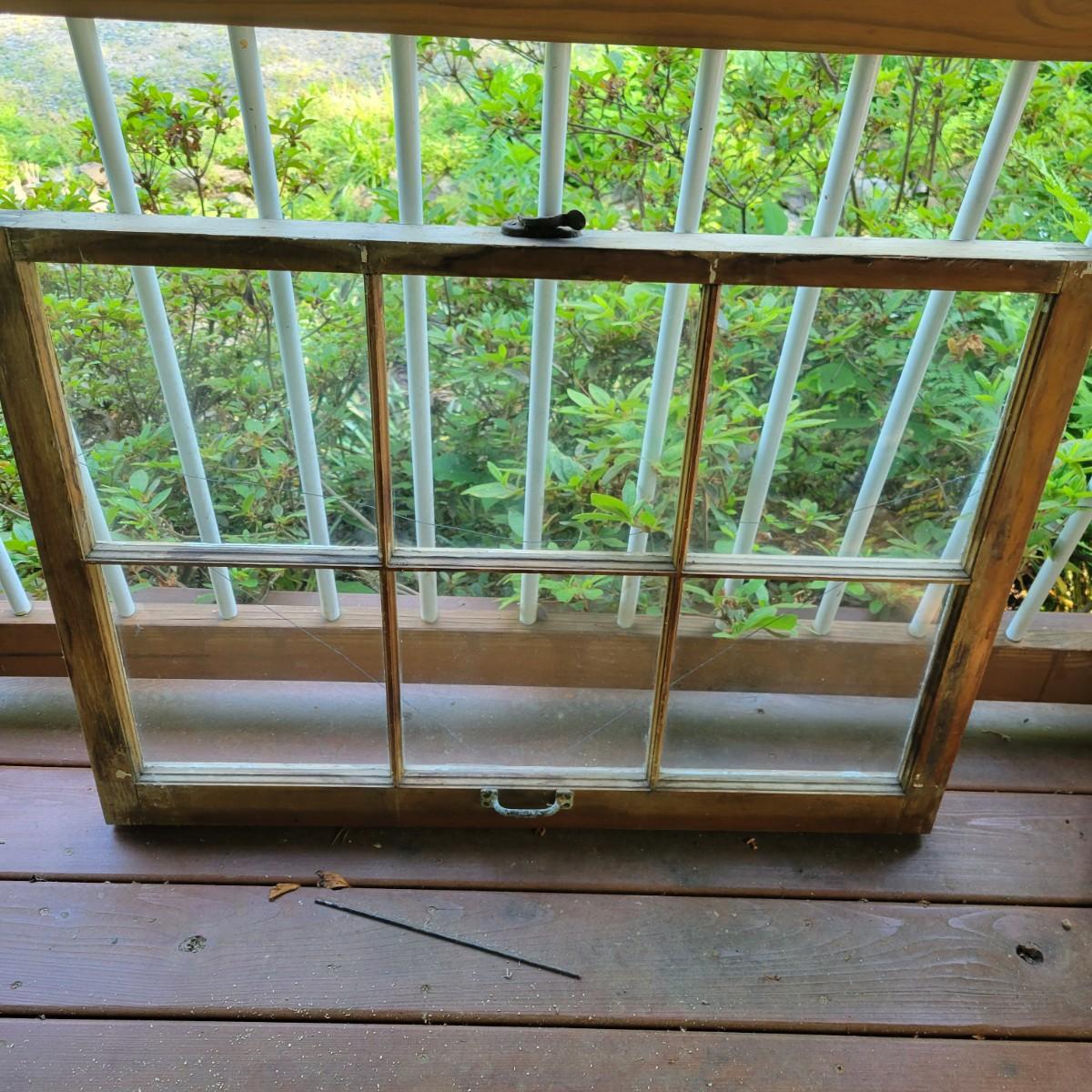 An assortment of items to decorate a deck or patio. Included is an older window pane with hanging hardware that measures approximately 36" x 1.5 x 26"H. A metal wreath form that is 24"D, a blue glass hanging bird feeder, a plaster sun fresco and a decorative metal shelf that measures approximately 27" x 6.5" x 26.5". Local pickup only