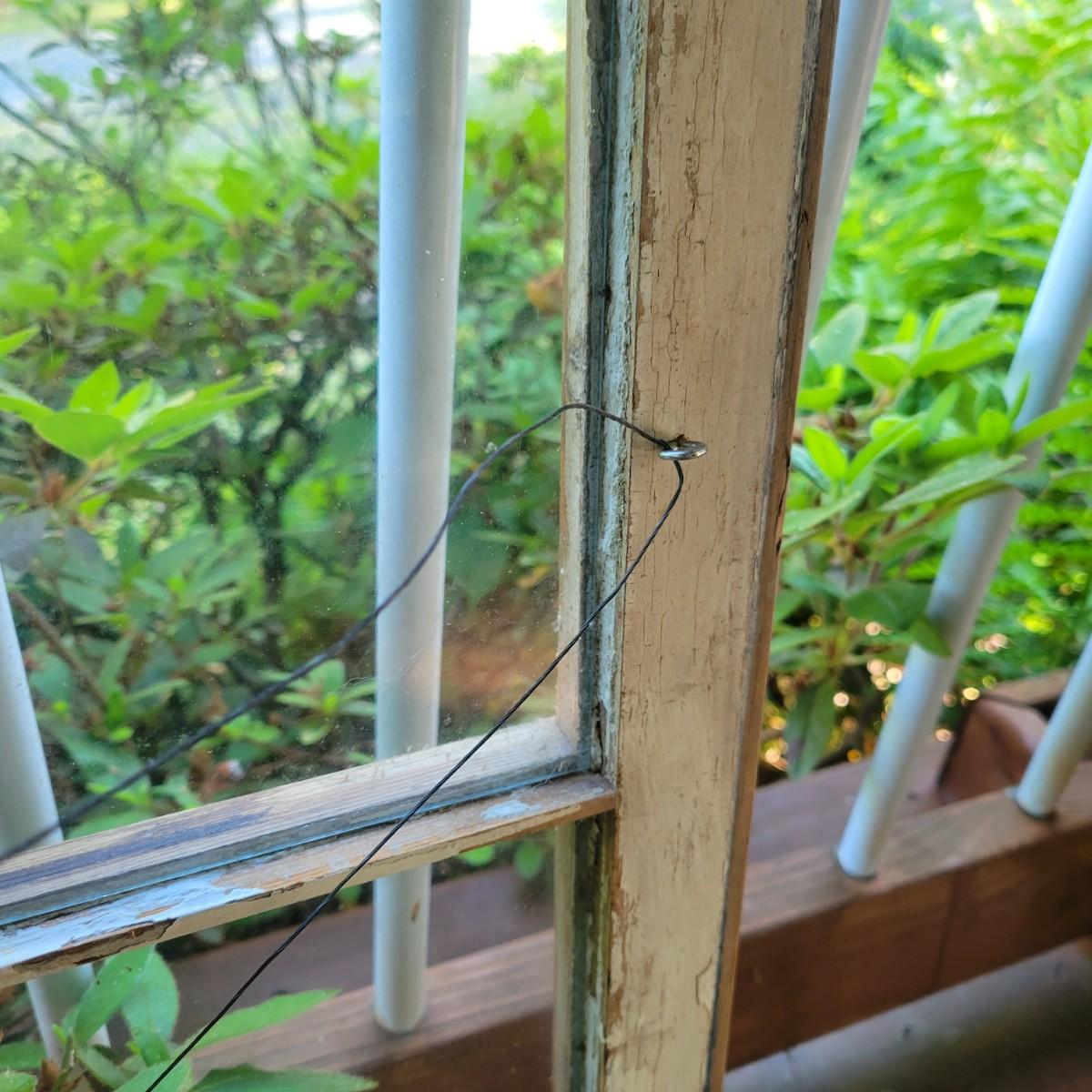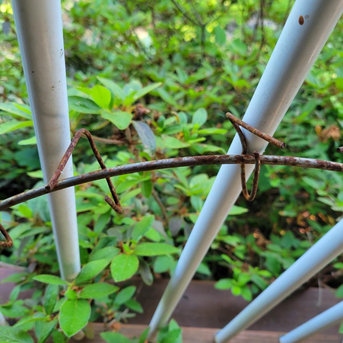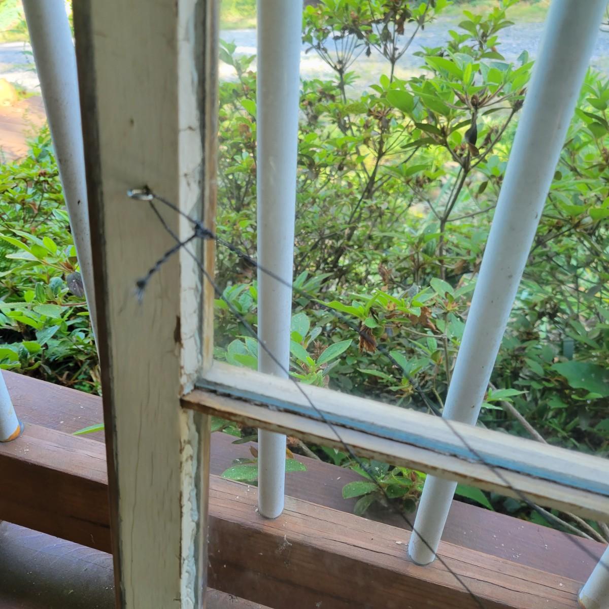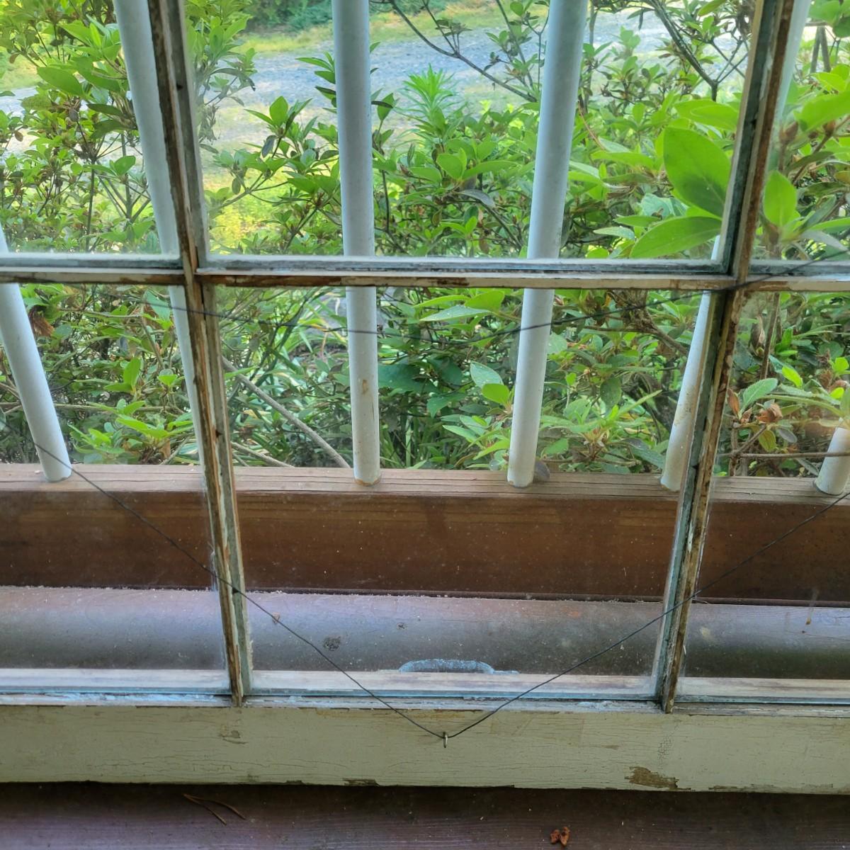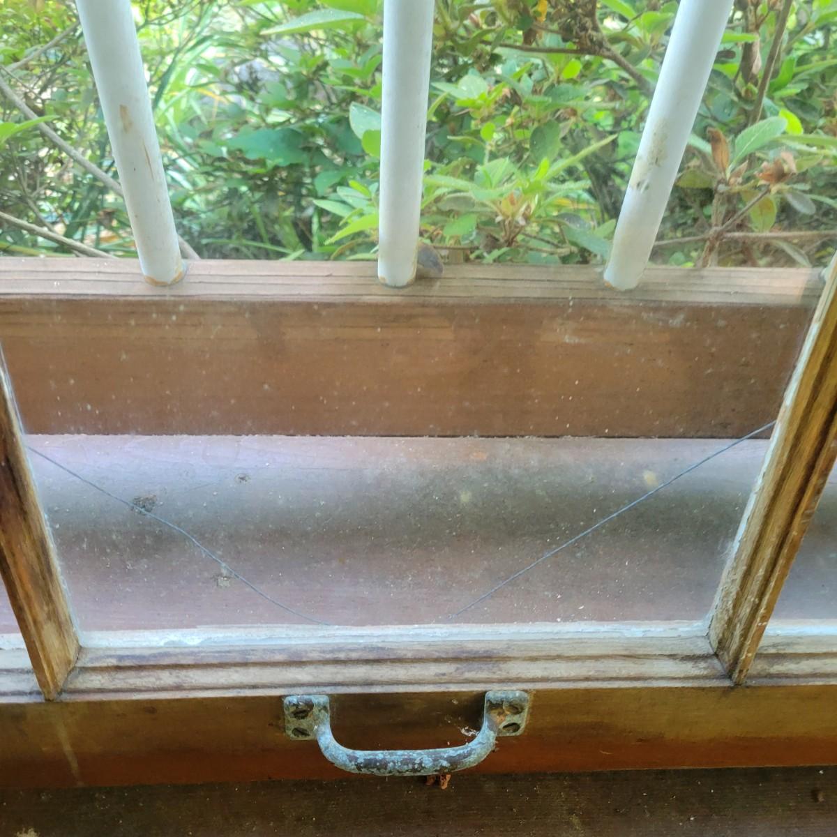 An assortment of items to decorate a deck or patio. Included is an older window pane with hanging hardware that measures approximately 36" x 1.5 x 26"H. A metal wreath form that is 24"D, a blue glass hanging bird feeder, a plaster sun fresco and a decorative metal shelf that measures approximately 27" x 6.5" x 26.5". Local pickup only