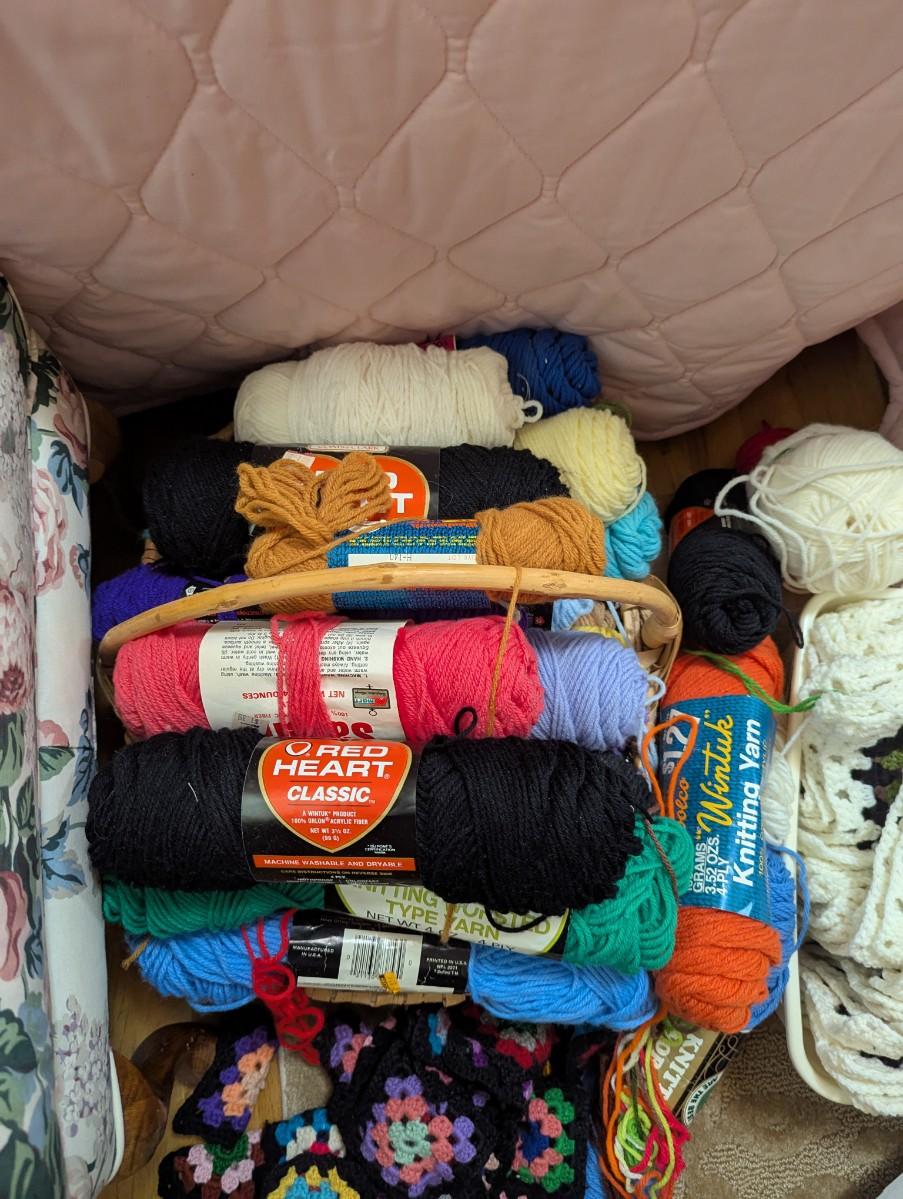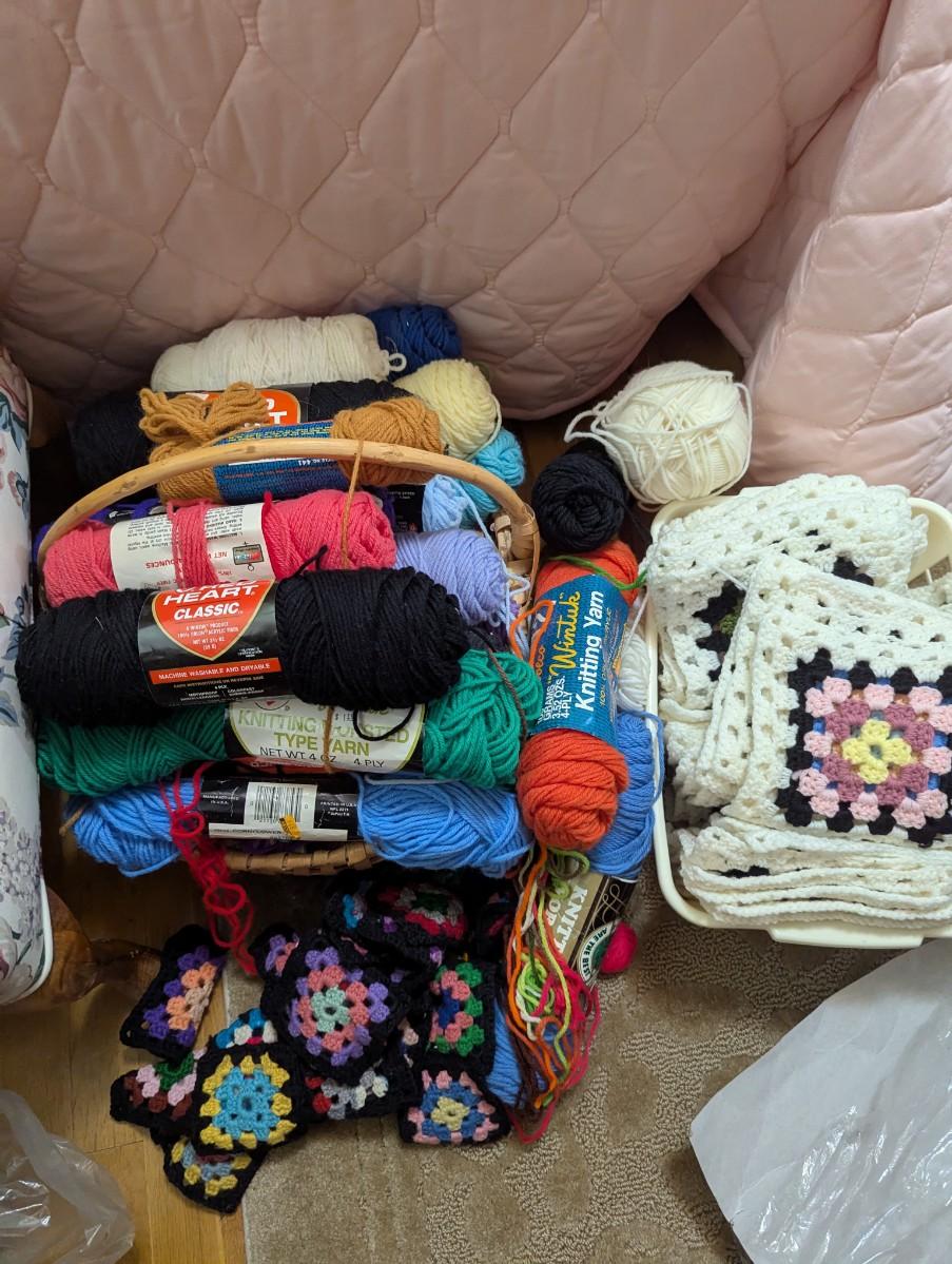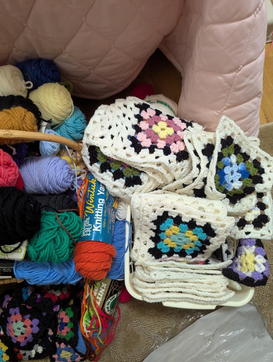 Multiple scanes of yarn, squares to make an afghan, and some knitting needles.