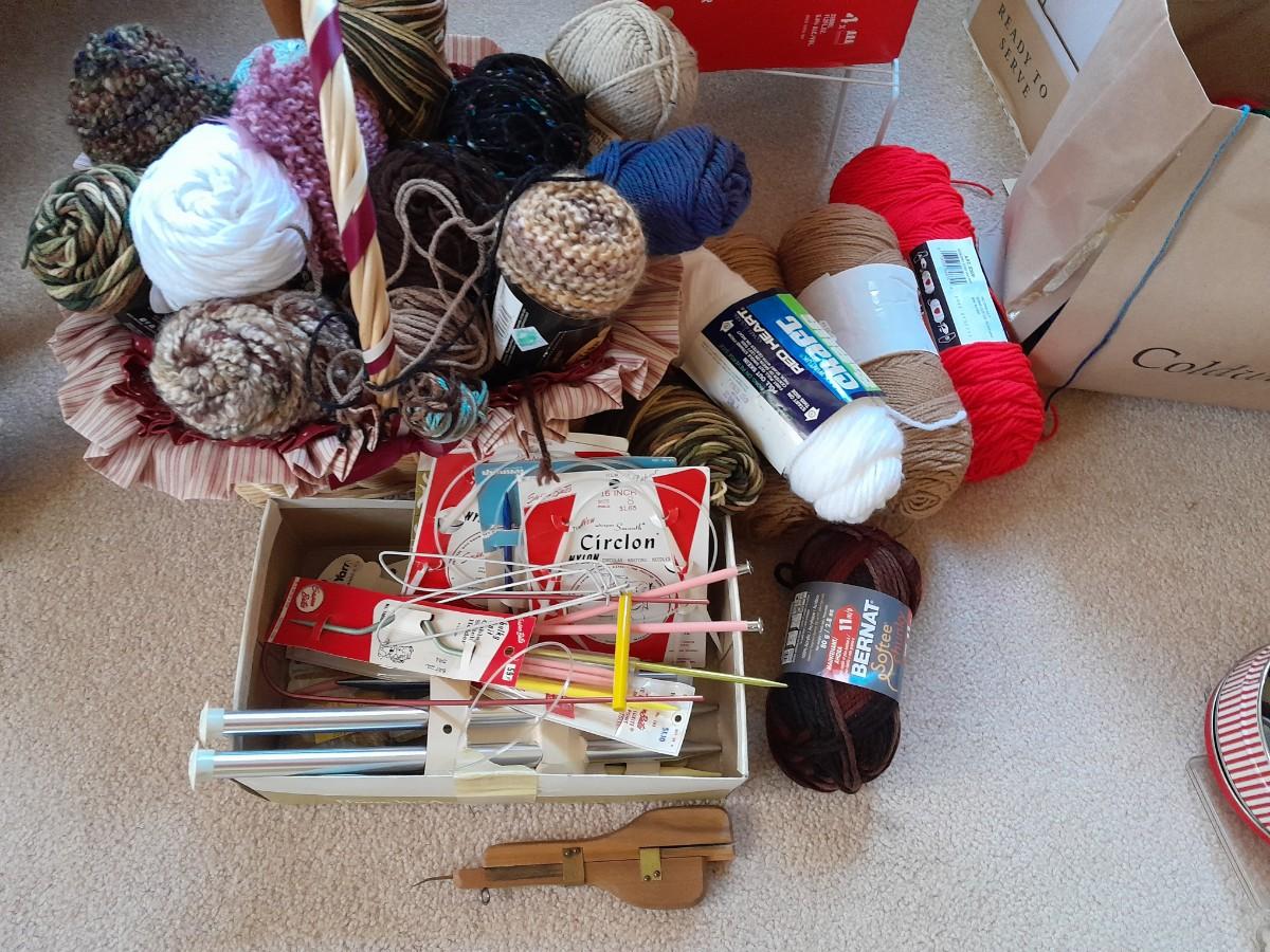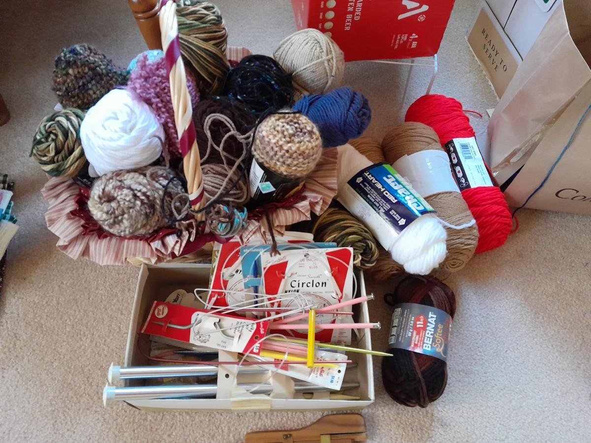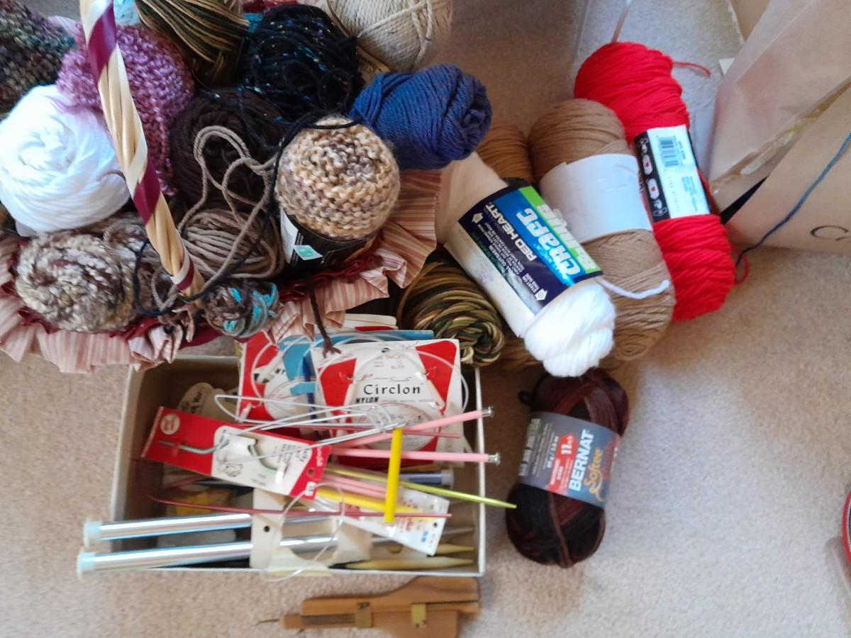 LOTS OF YARN WITH KNITTING NEEDLES, AND OTHER YARN CRAFTING ITEMS
