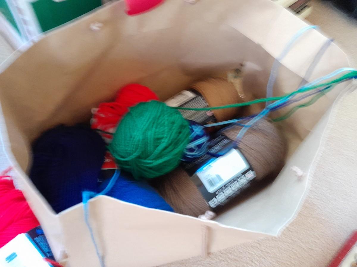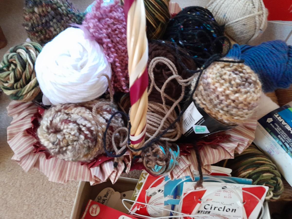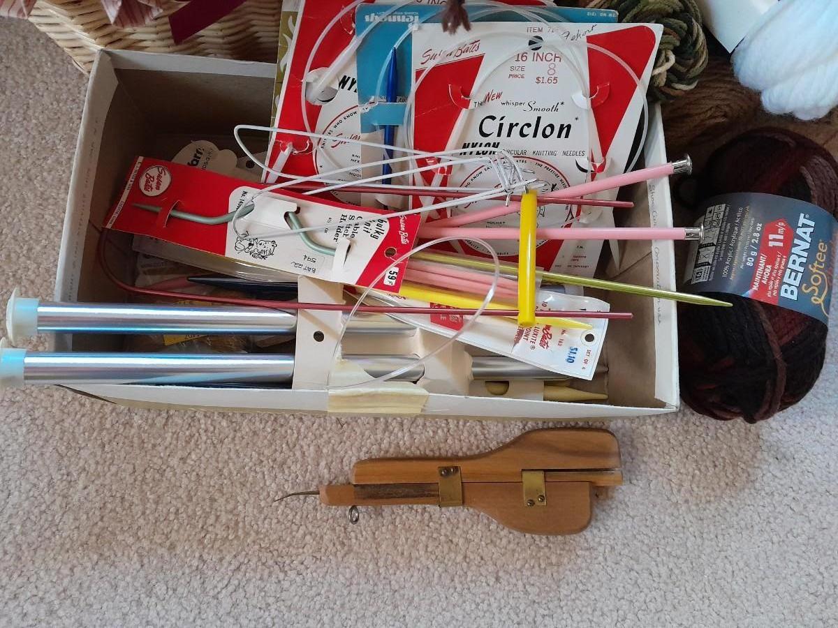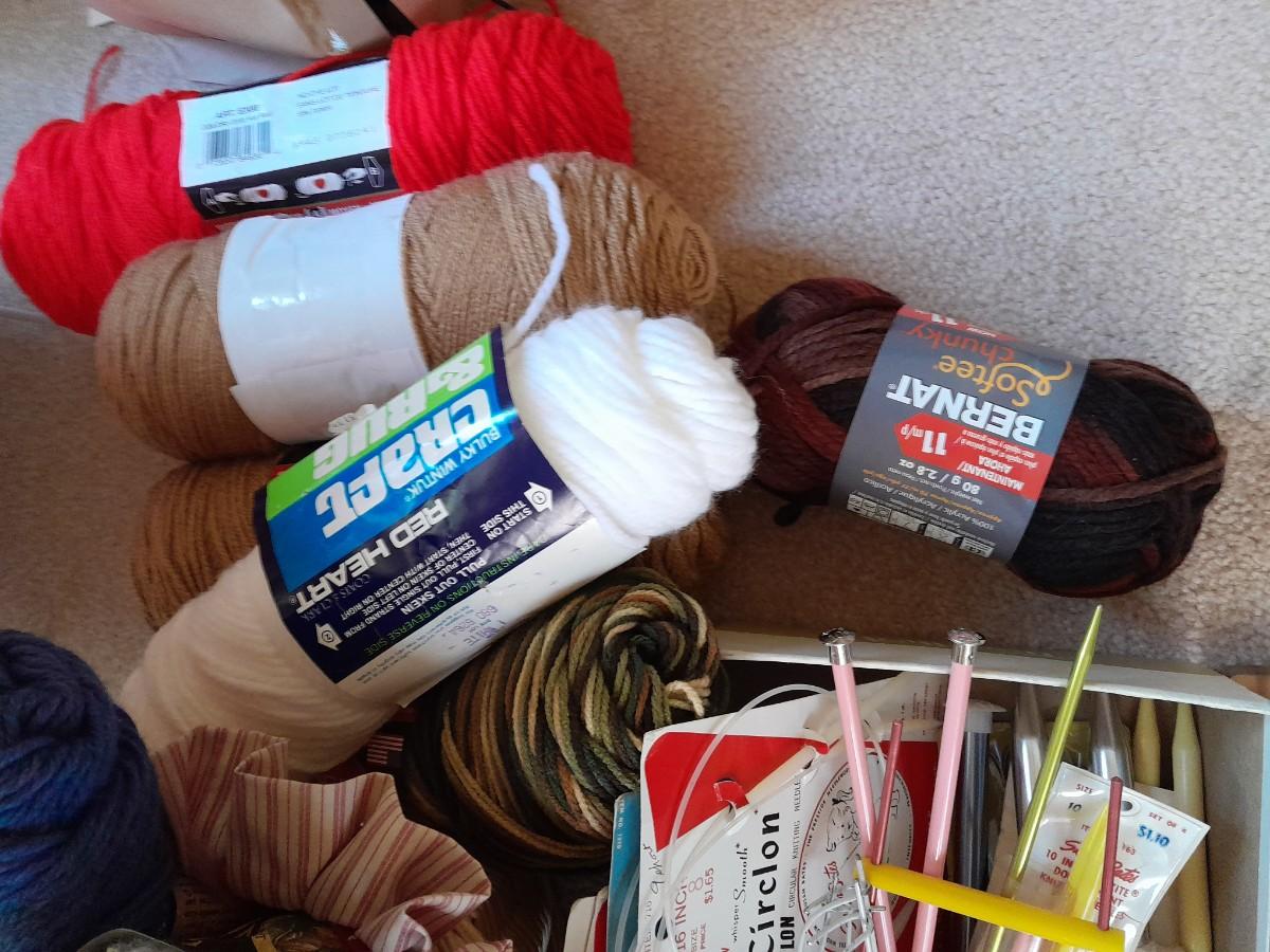 LOTS OF YARN WITH KNITTING NEEDLES, AND OTHER YARN CRAFTING ITEMS