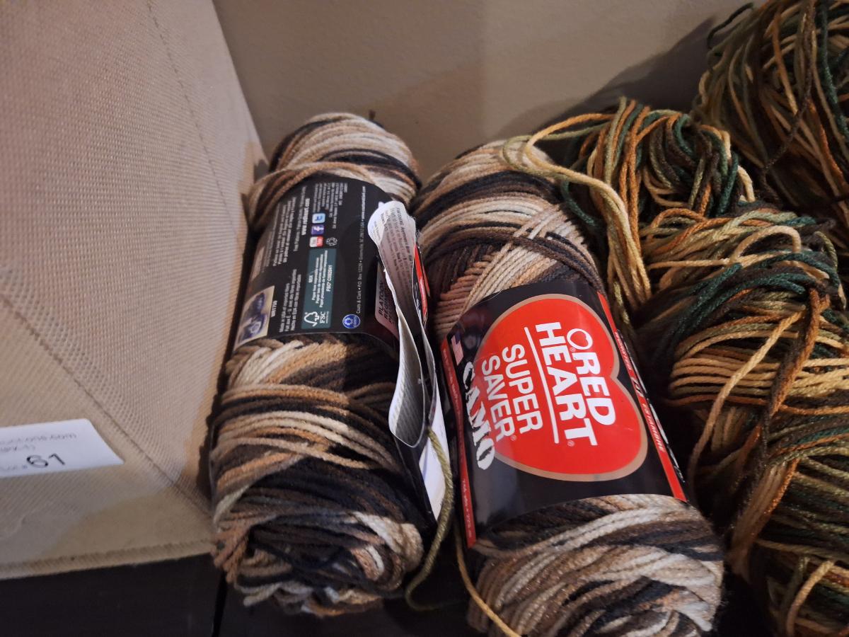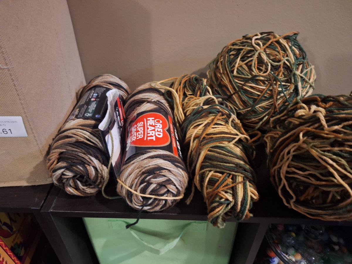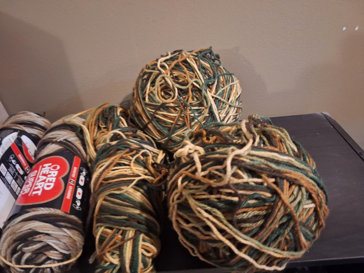 Yarn bundle, camo colors, 2 skeins are browns the rest has greens.
