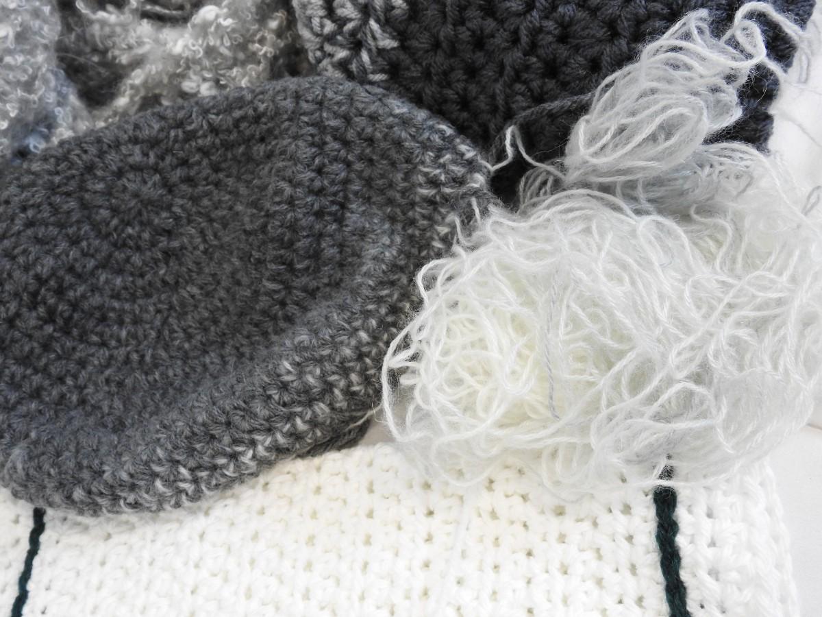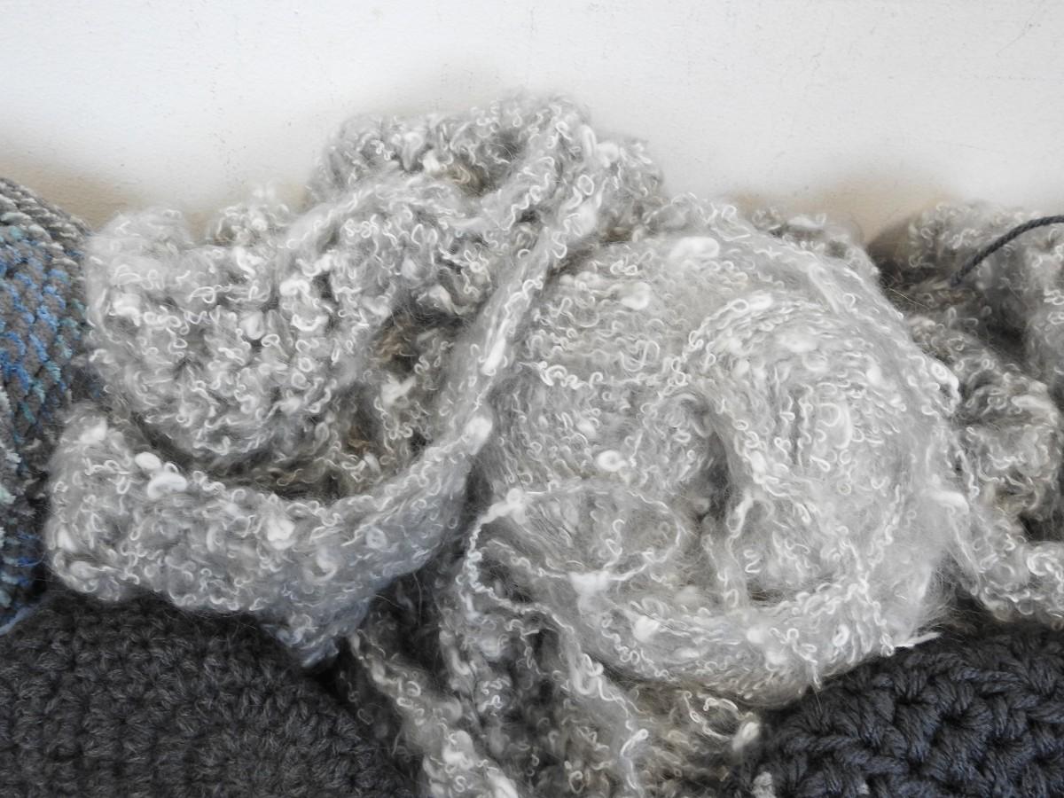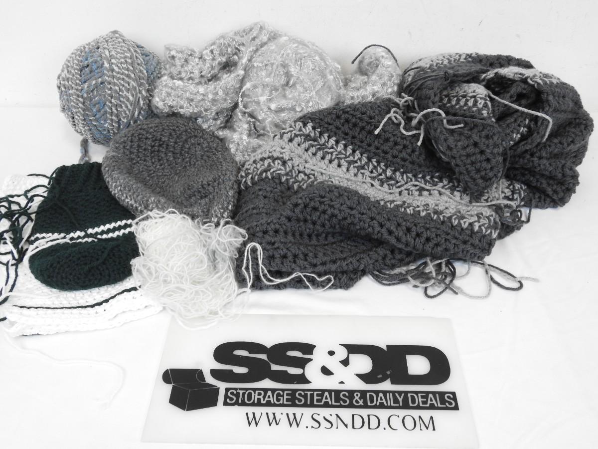 Yarn & Partially Completed Projects. Gray, Blue, Green, & White