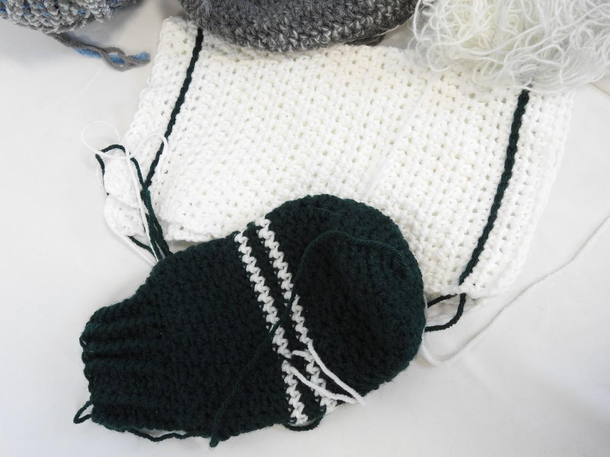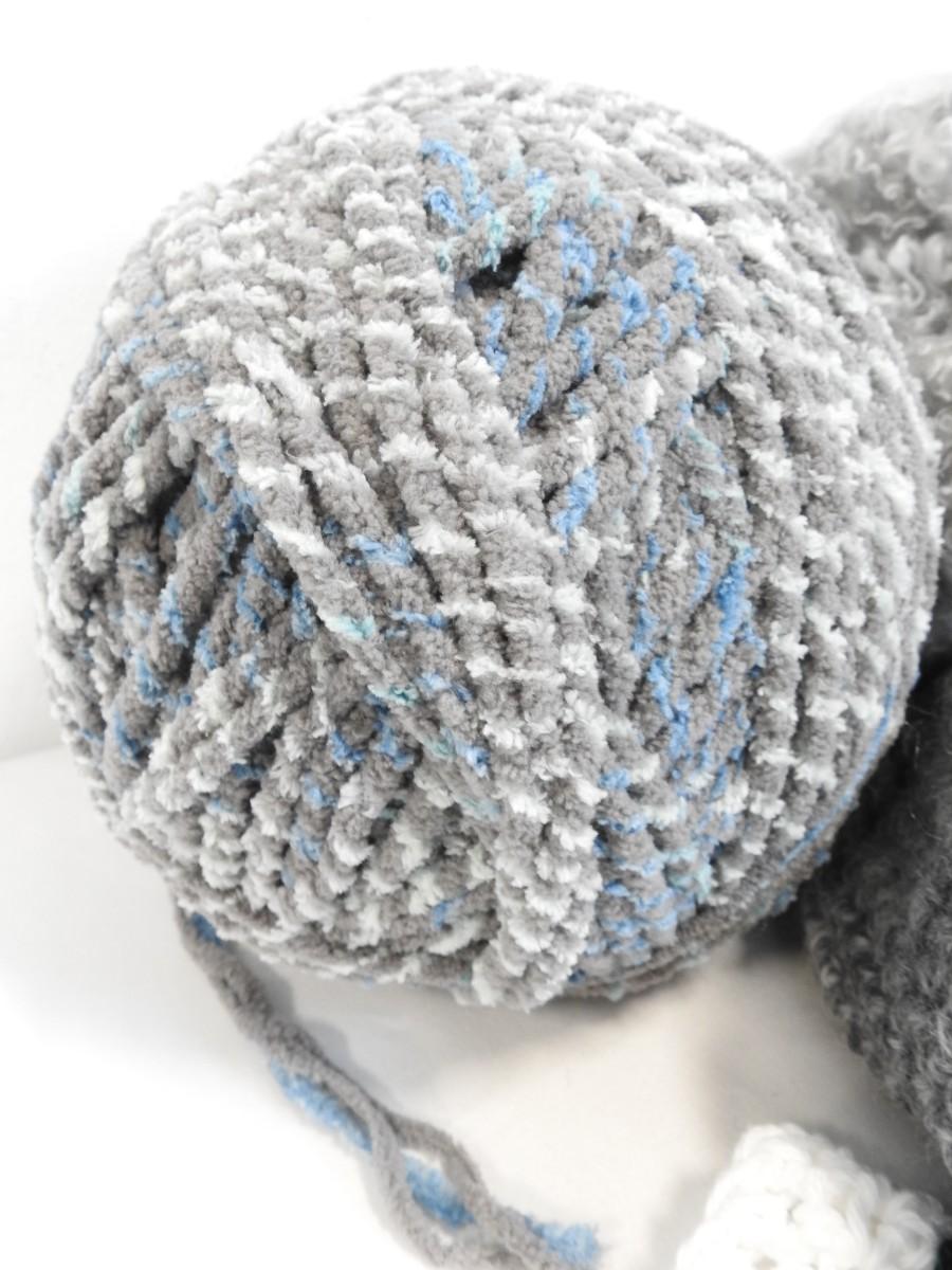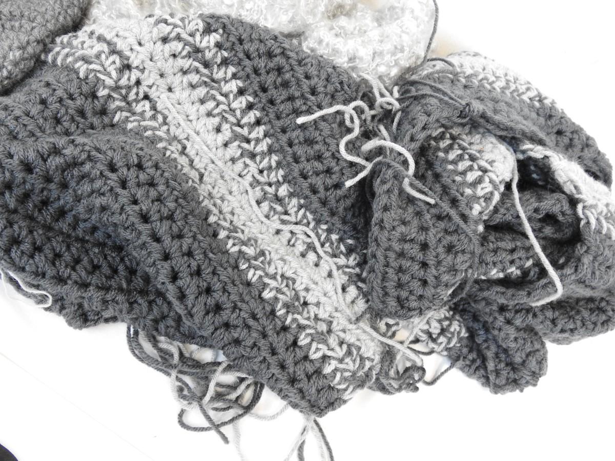 Yarn & Partially Completed Projects. Gray, Blue, Green, & White