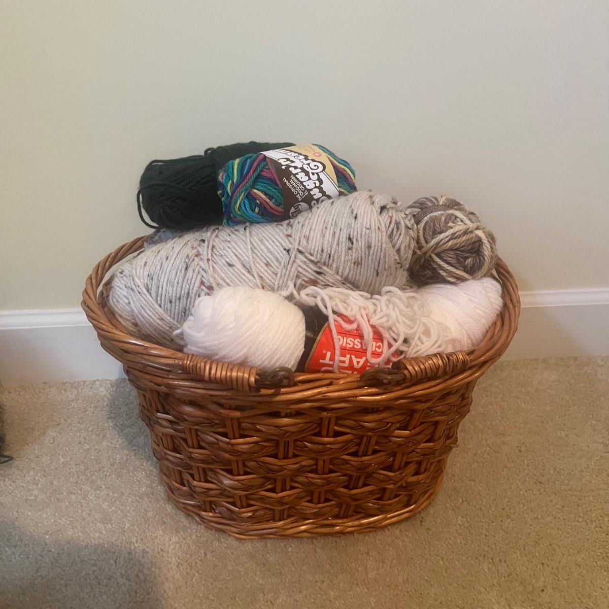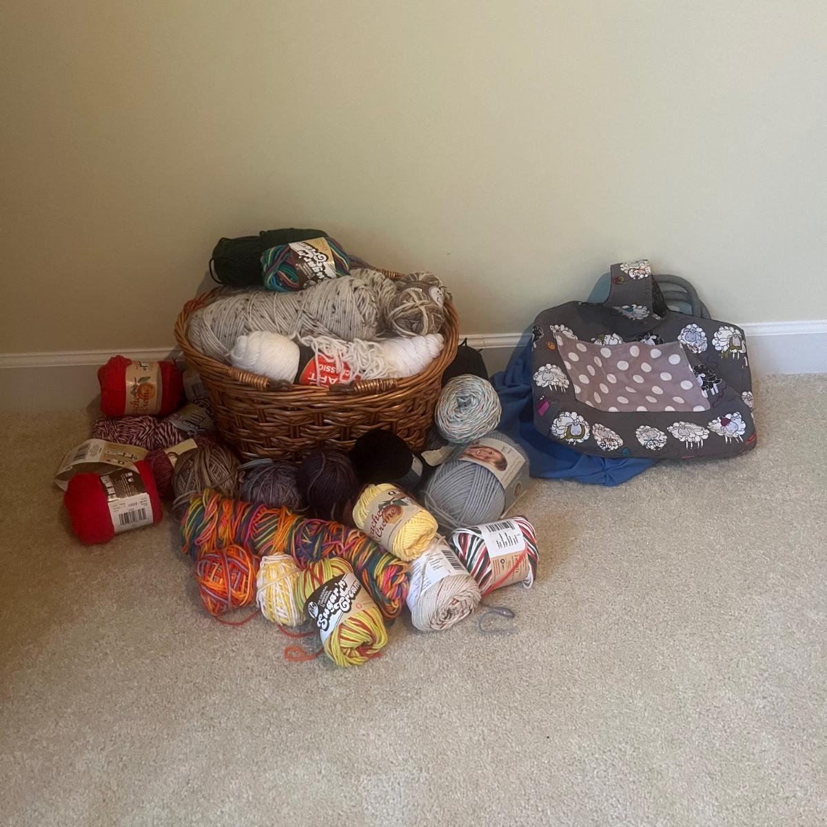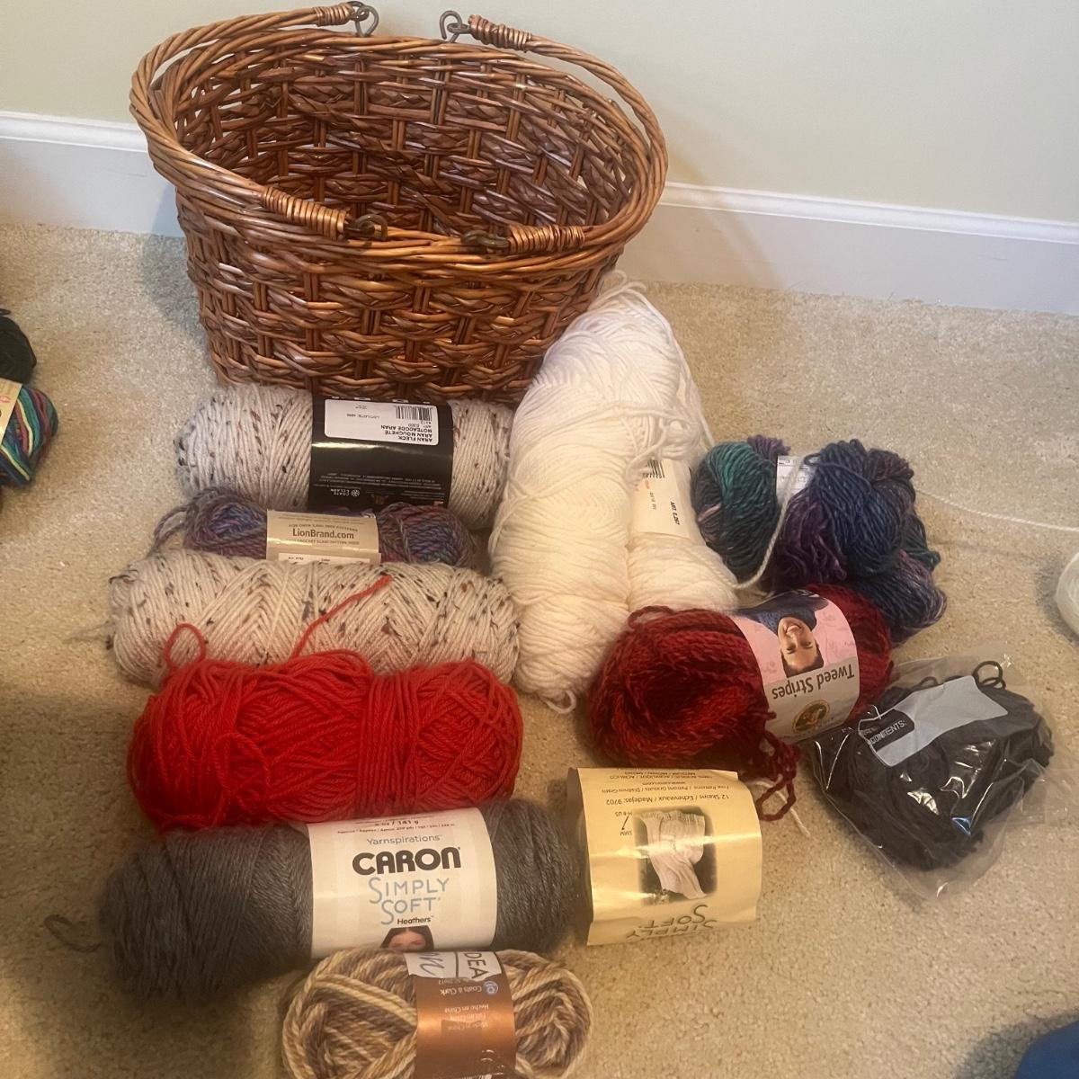 Lot includes a woven wooden basket with handles and two small bags filled with over thirty rolls of yarn in a variety of colors. Basket measures 13” x 14” x 10”H.