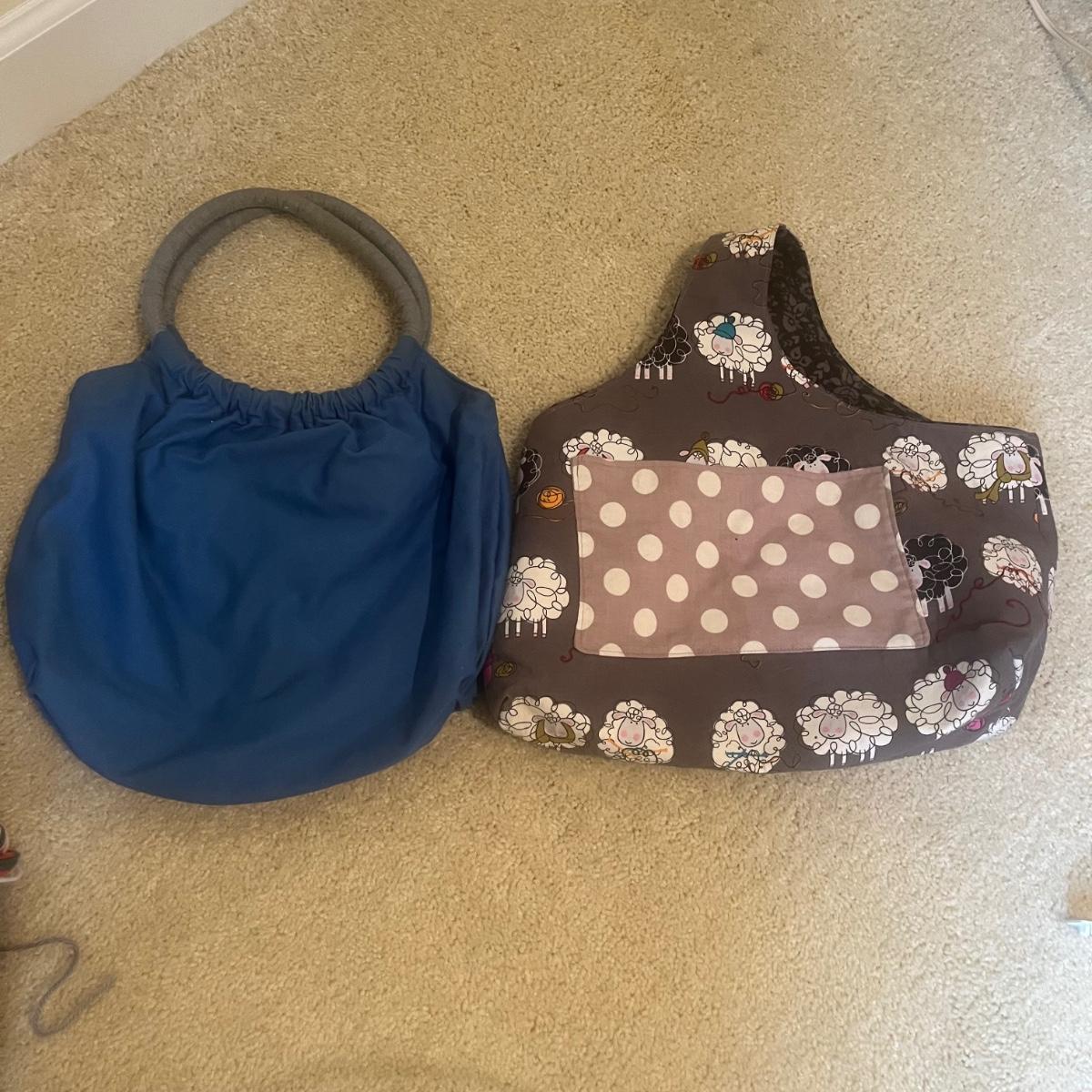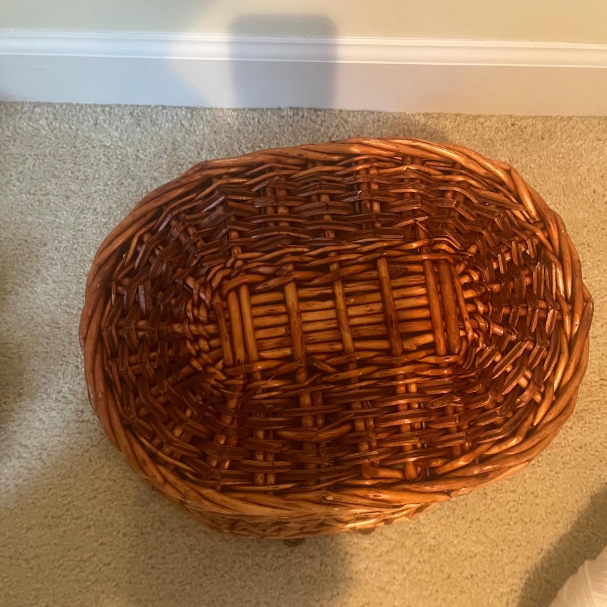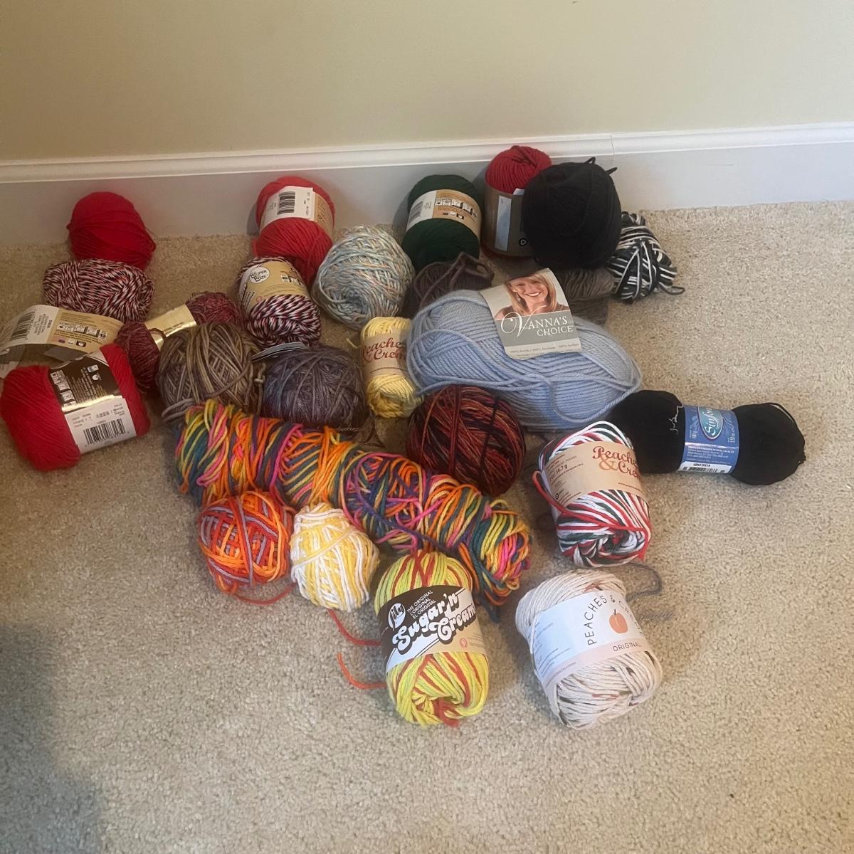 Lot includes a woven wooden basket with handles and two small bags filled with over thirty rolls of yarn in a variety of colors. Basket measures 13” x 14” x 10”H.