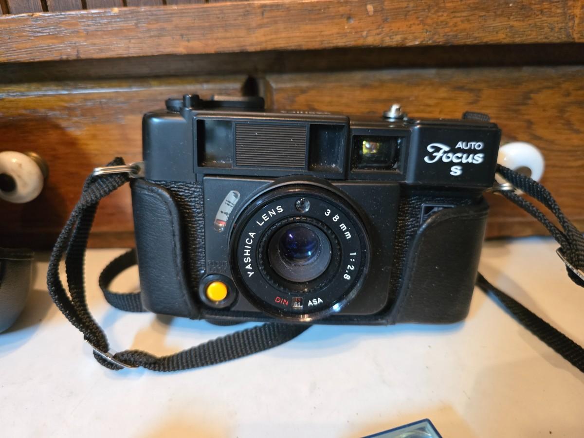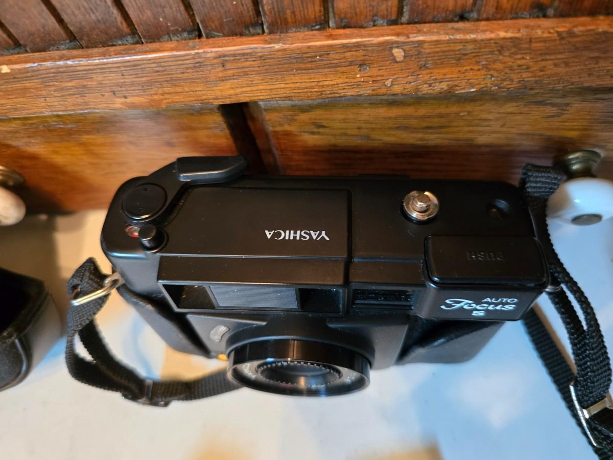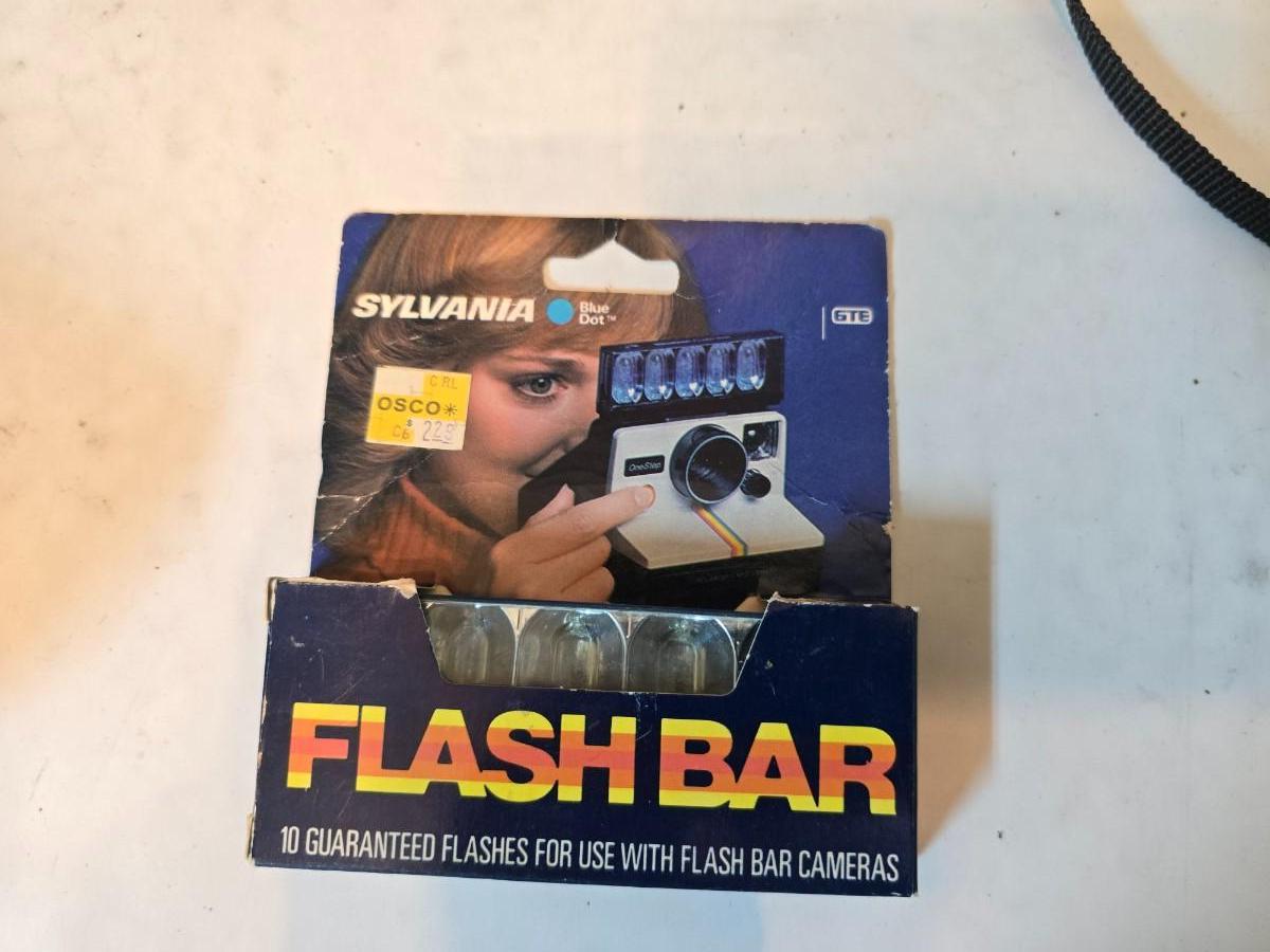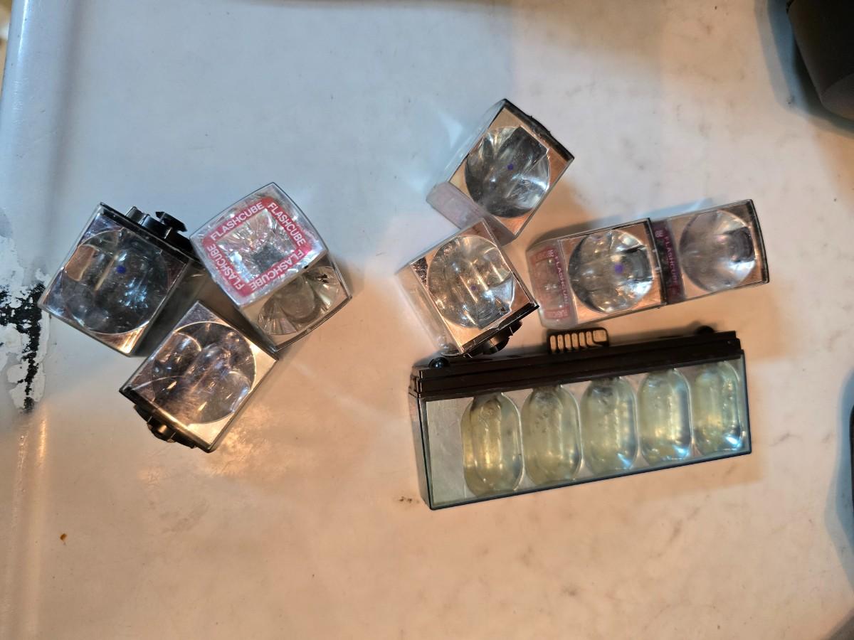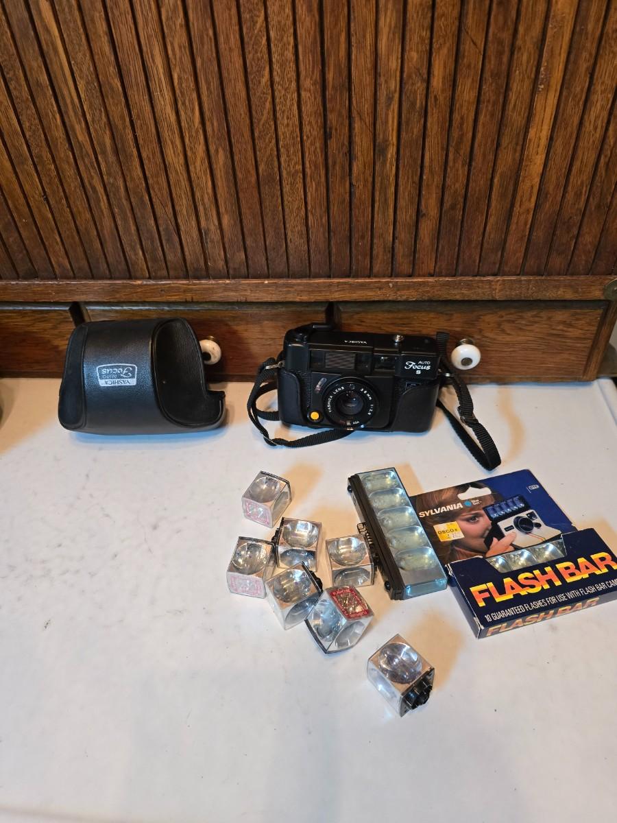 Yashica Auto Focus S 35mm point-and-shoot film camera with an assortment of vintage Sylvania Flashbars and Flashcubes for specific Polaroid cameras.
